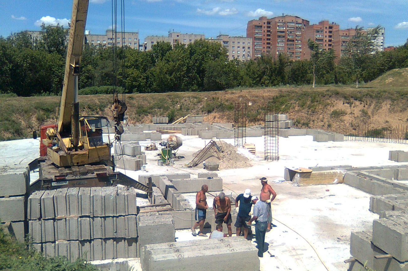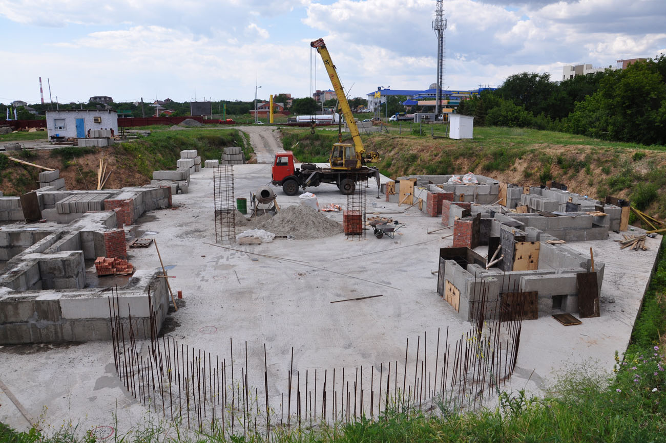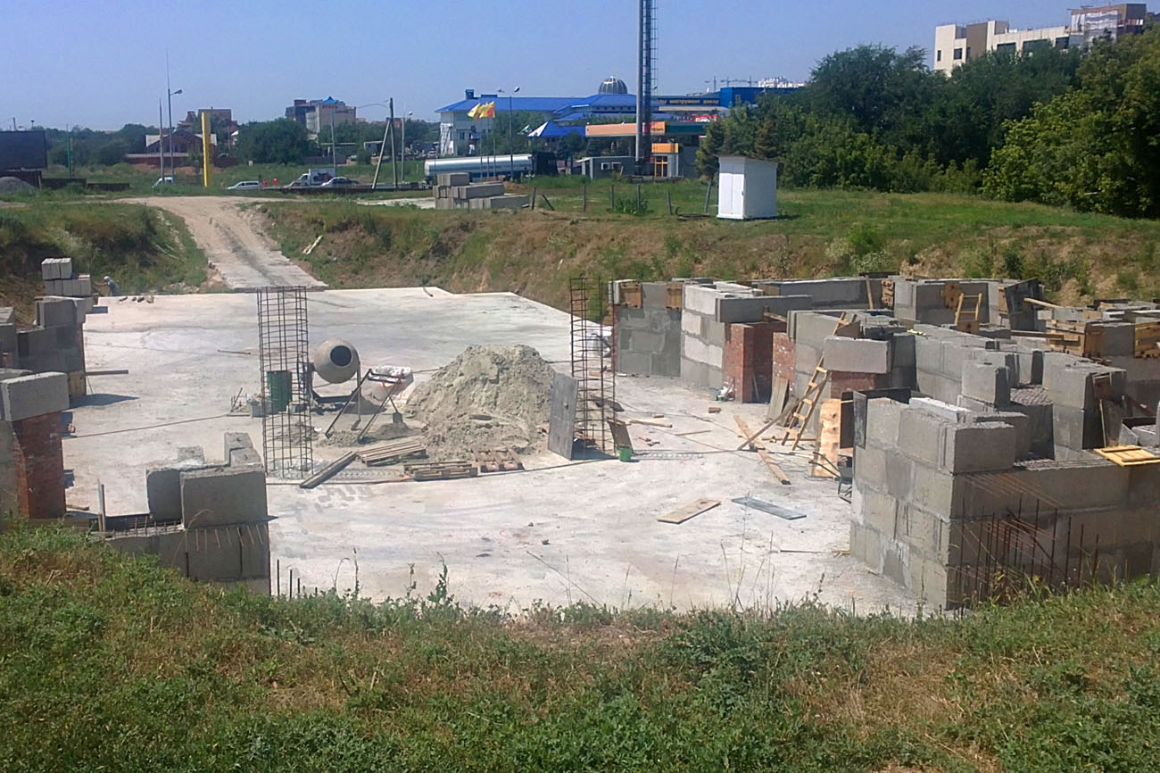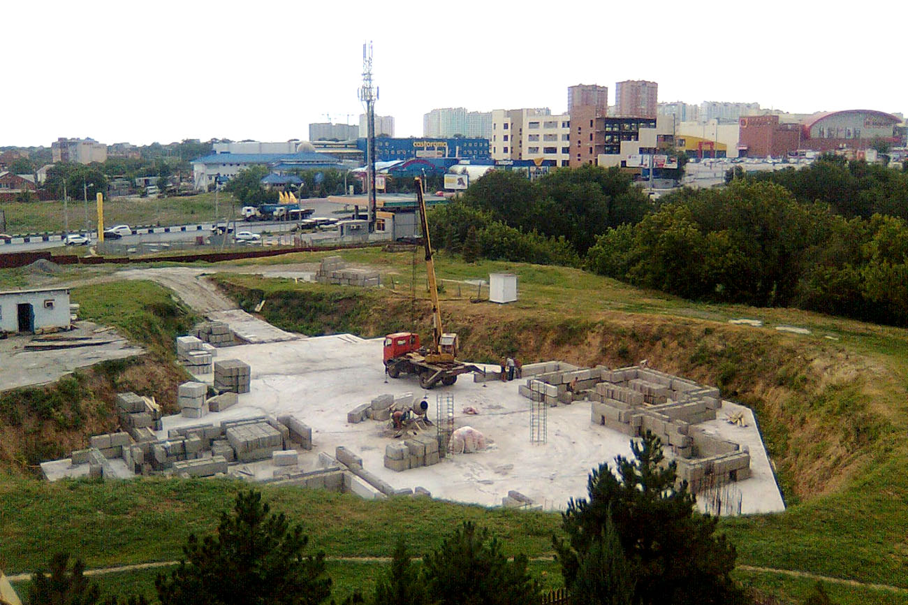 Это было в мае, а сегодня мы видим растущее основание стен, непрекращаюся работу строителей. По выложенным бетонным блокам, закладка которых началась в июне, уже сейчас можно увидеть масштаб того строительства, которое предстоит продолжать не один месяц и год. Почти закончено возведение стен церковной лавки и скоро начнется монтаж крыши. На сегодняшний день забито 749 свай, залита фундаментная плита, начался монтаж блоков для строящегося храма.