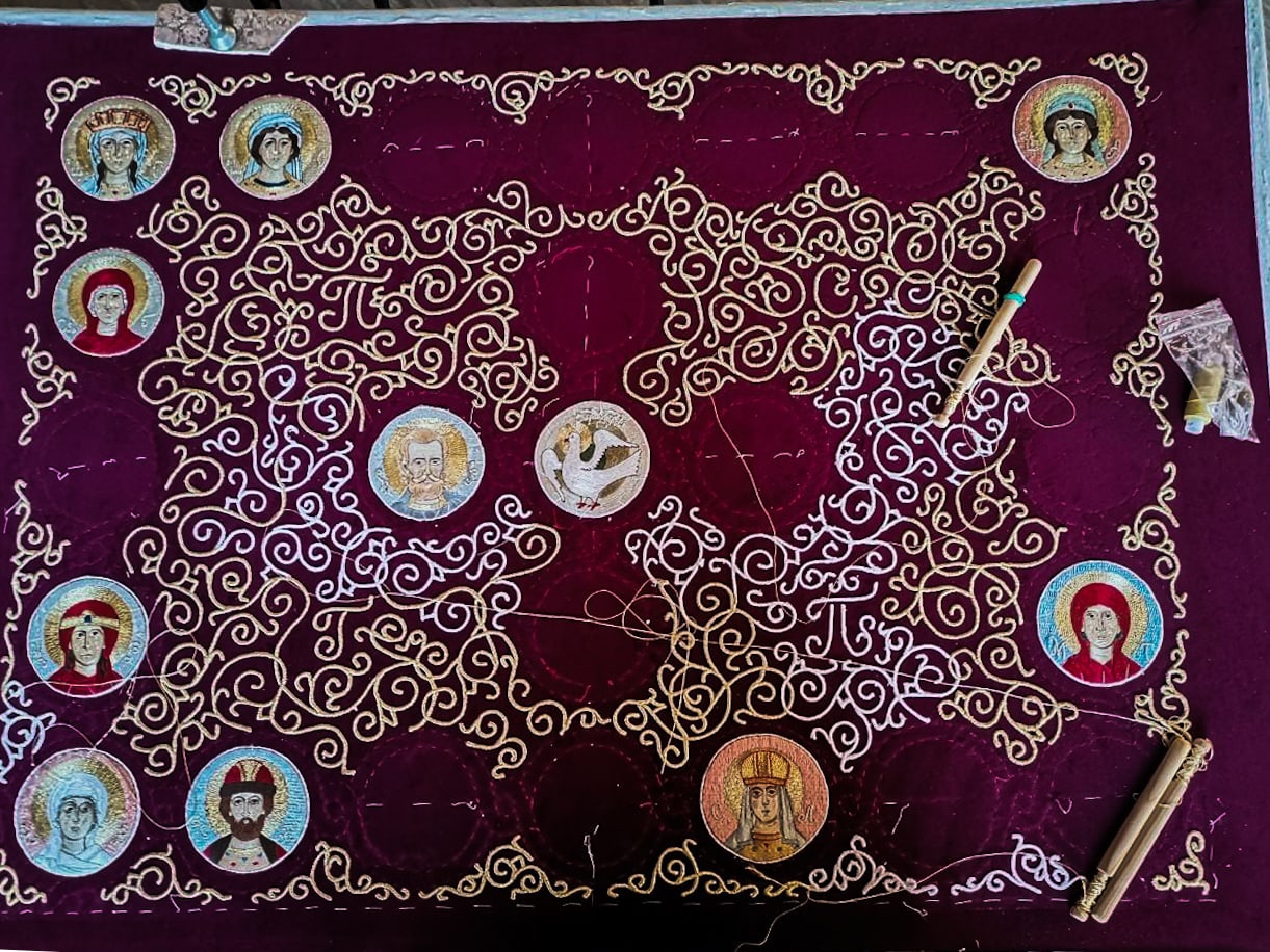 Литургический комплект вышивается на темно-бордовом бархате. Орнамент шьётся золотными нитями по верёвочке. Среди витиеватых узоров можно разглядеть буквы "П", "С", "Г", "П", что определяет принадлежность данного комплекта нашему приходу. На медальонах вышиваются иконы избранных святых. Это святые покровители нашего прихода, покровители семей и иконы с изображением святых, в честь которых названы мастерицы-золотошвеи.