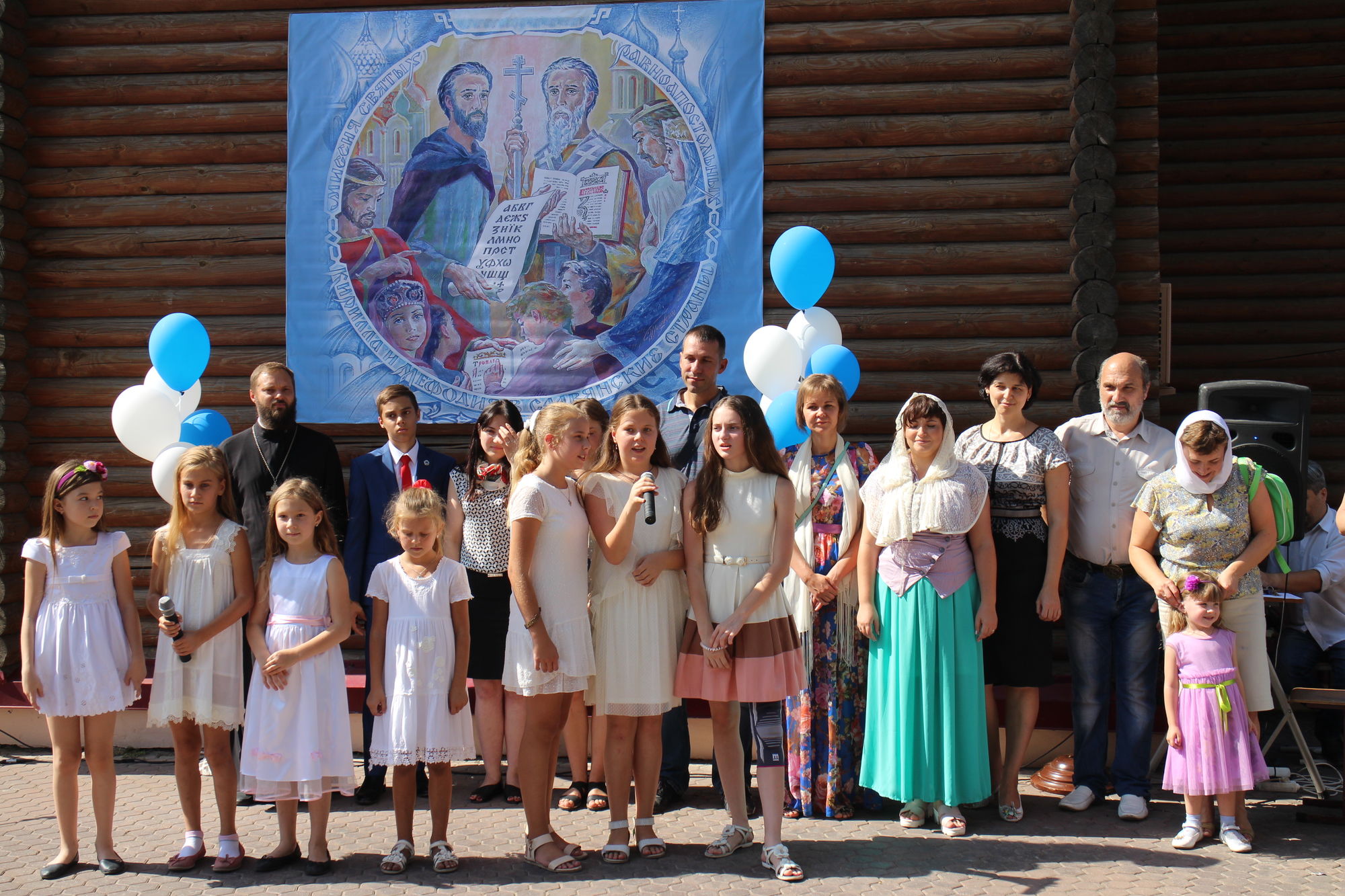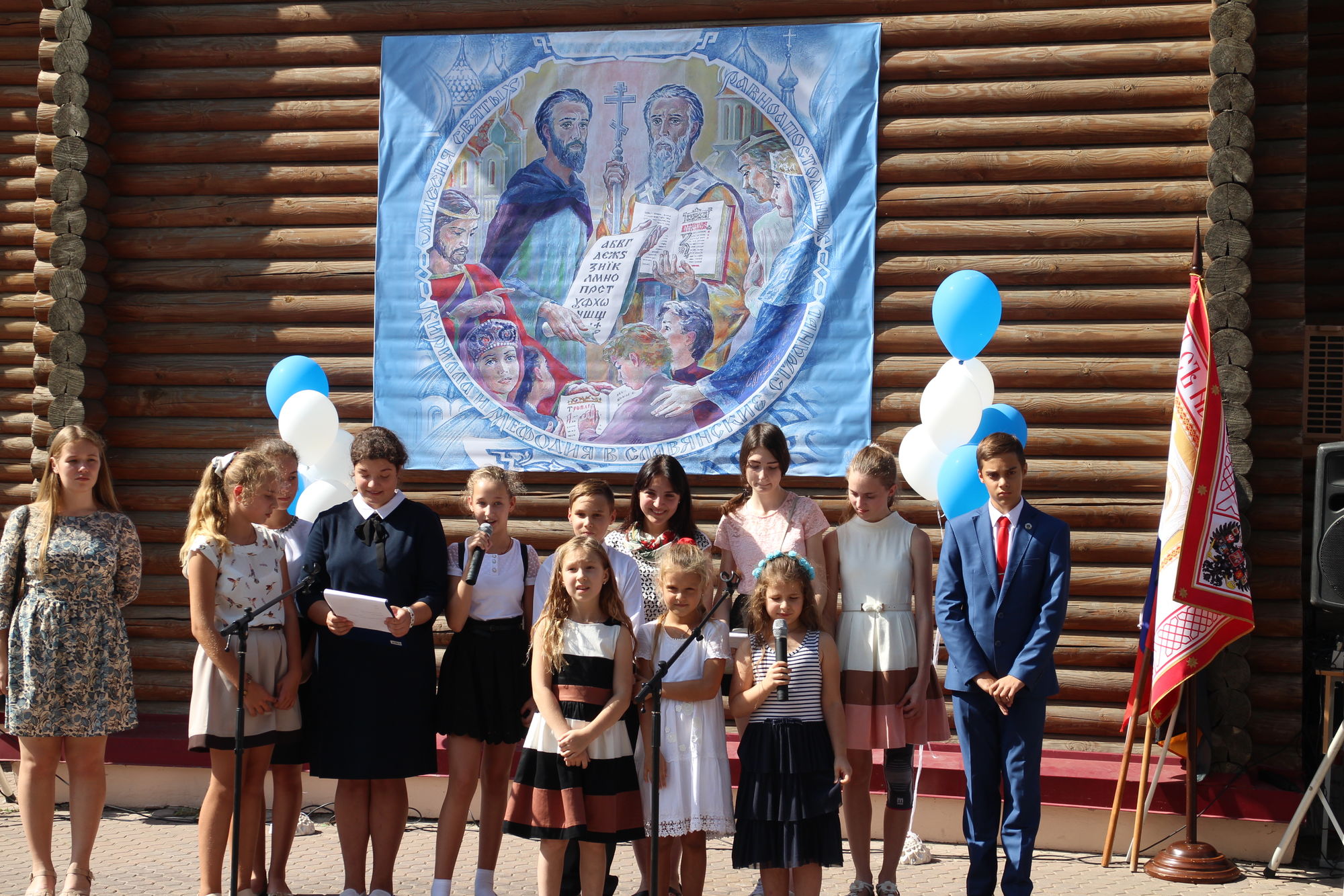 Затем с приветственным словом выступила директор школы Ксения Валерьевна Волощук, которая сердечно поздравила учеников и родителей с новым учебным годом К празднику ребята воскресной школы подготовили концерт, в котором звучали песни и стихи о воскресной школе, о православной вере. Ребята из патриотического центра продемонстрировали свои боевые навыки, а руководитель центра Виктор Иванович Чуцков спел песни собственного сочинения. Завершился концерт дружным выступлением преподавателей воскресной школы и колокольным звоном.