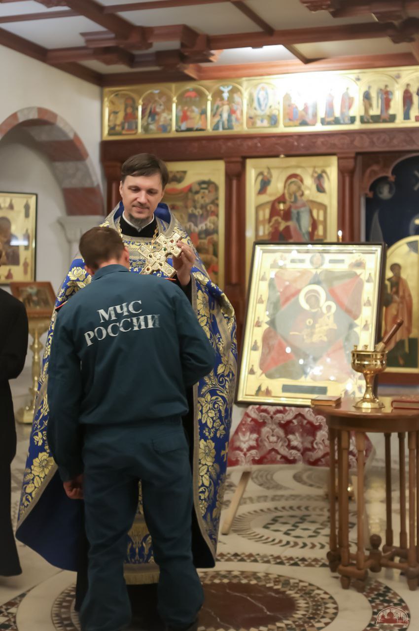 По окончании богослужения спасателям была передана копия иконы Божией Матери "Неопалимая Купина", написанная на средства сотрудников отделения в память чудесного избавления храма святого мученика Иоанна Воина от пожара 31 декабря 2011 года.