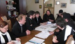 В завершении поездки в здании Шахтинского Епархиального управления состоялось очередное заседание Архитектурно-искусствоведческой комиссии Донской митрополии. В собрании приняли участие: председатель Комиссии протоиерей Валерий Волощук, заместитель председателя, клирик прихода святого Георгия Победоносца, иерей Александр Литвиненко, представитель Шахтинской епархии протоиерей Георгий Сморкалов, представитель Волгодонской епархии иерей Ростислав Сагинашвили, руководитель Архитектурно-строительного отдела Ростовской-на-Дону епархии Пётр Колобаев, архитектор отдела, секретарь Комиссии Александр Лазарев, главный архитектор проектов Епархиальной проектной организации «ООО Реставрационно-строительная фирма „Купола“» Надежда Магагина, представитель Шахтинской епархии, архитектор Владимир Александровский.