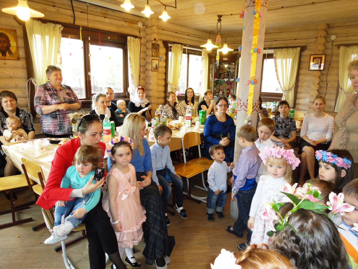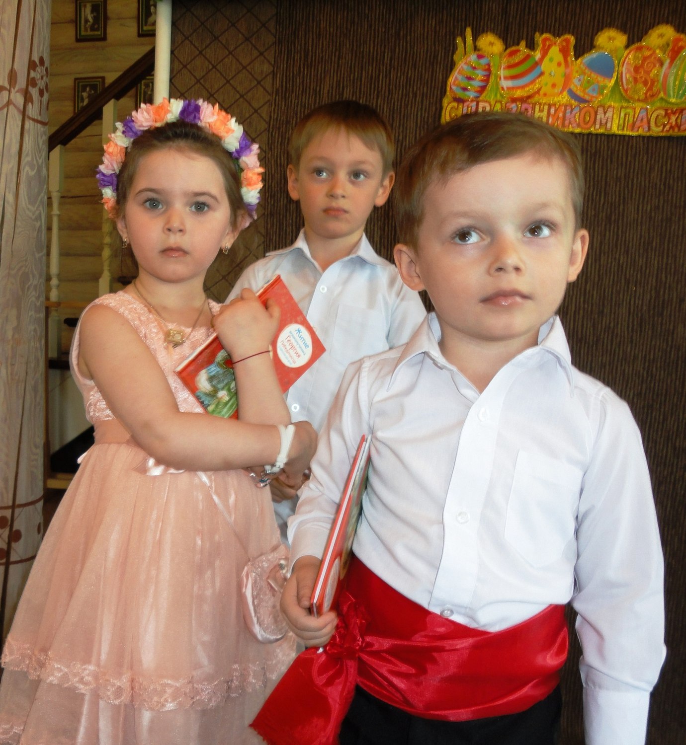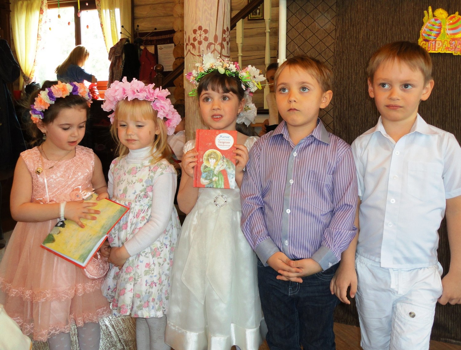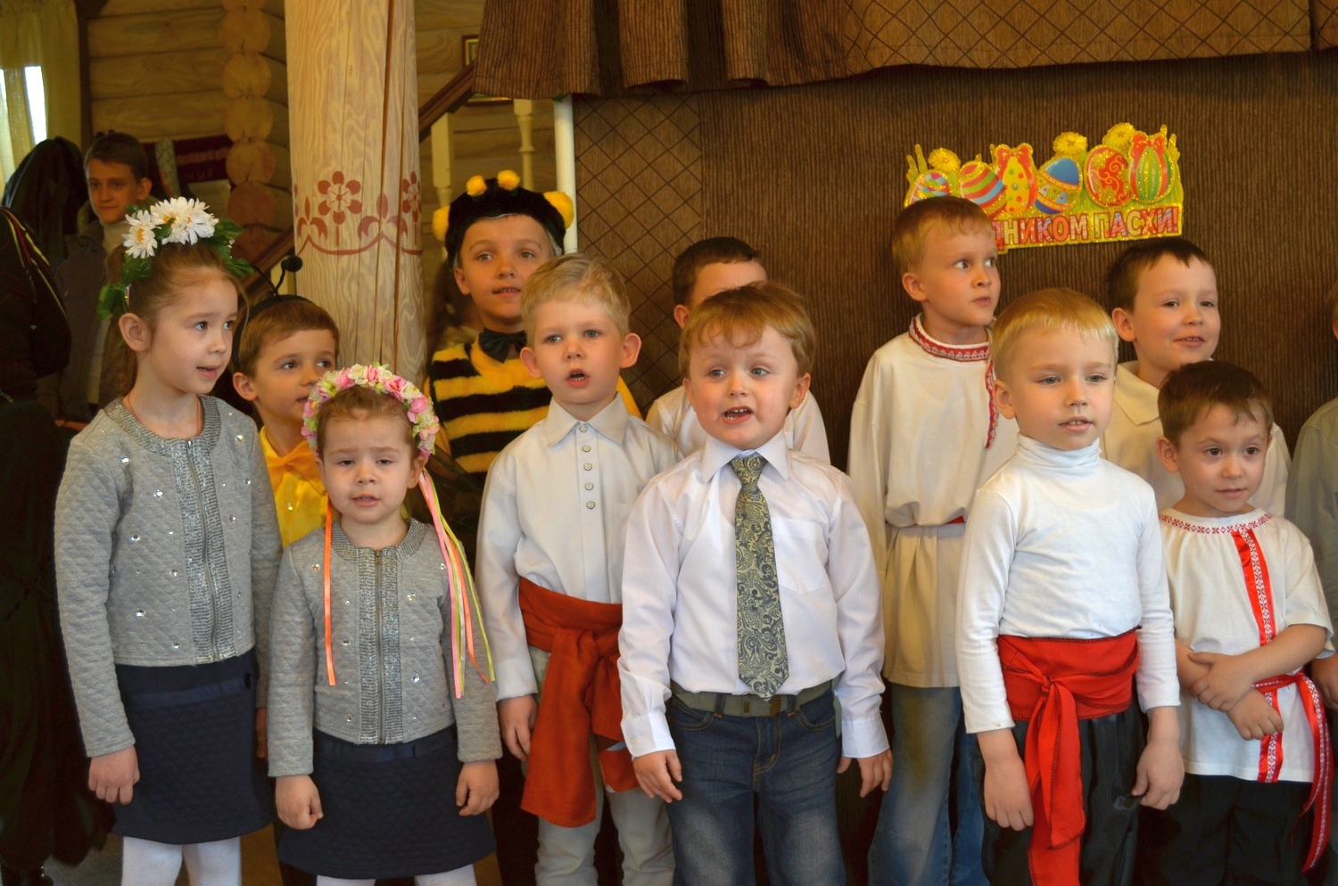 Маленькие участники утренника волновались, потому что среди гостей был настоятель нашего прихода отец Валерий. После общей молитвы и поздравления он отметил, что наши воспитанники похожи на праздничные куличики и пасхальные яйца. У каждой девочки на голове красовался веночек, который с любовью был приготовлен мамой, а одежду мальчиков украшала вышивка на рубашках и красивые пояса-кушаки! В таких нарядах хоровод "Во поле берёза стояла" заиграл всеми красками русских традиций.