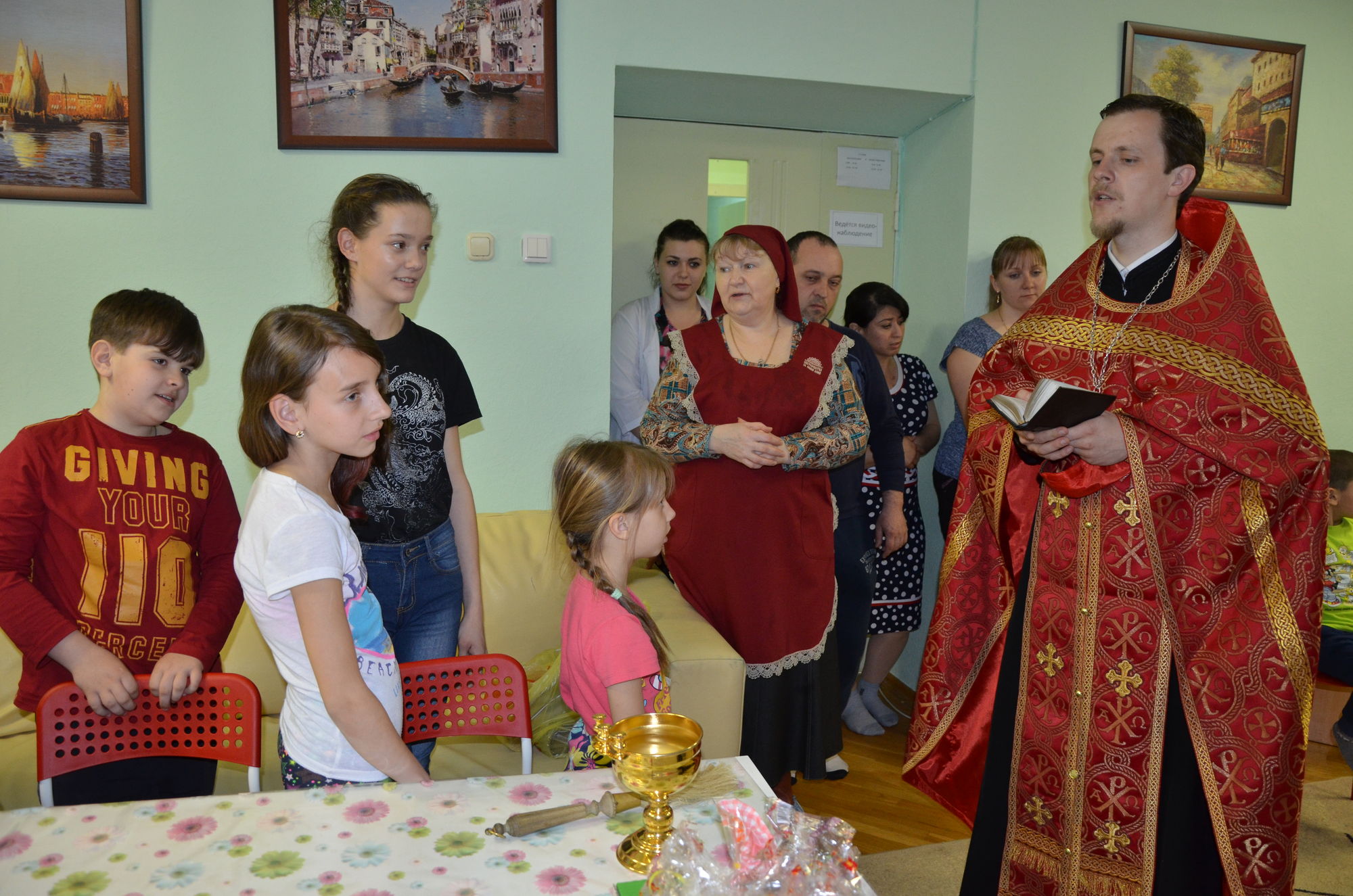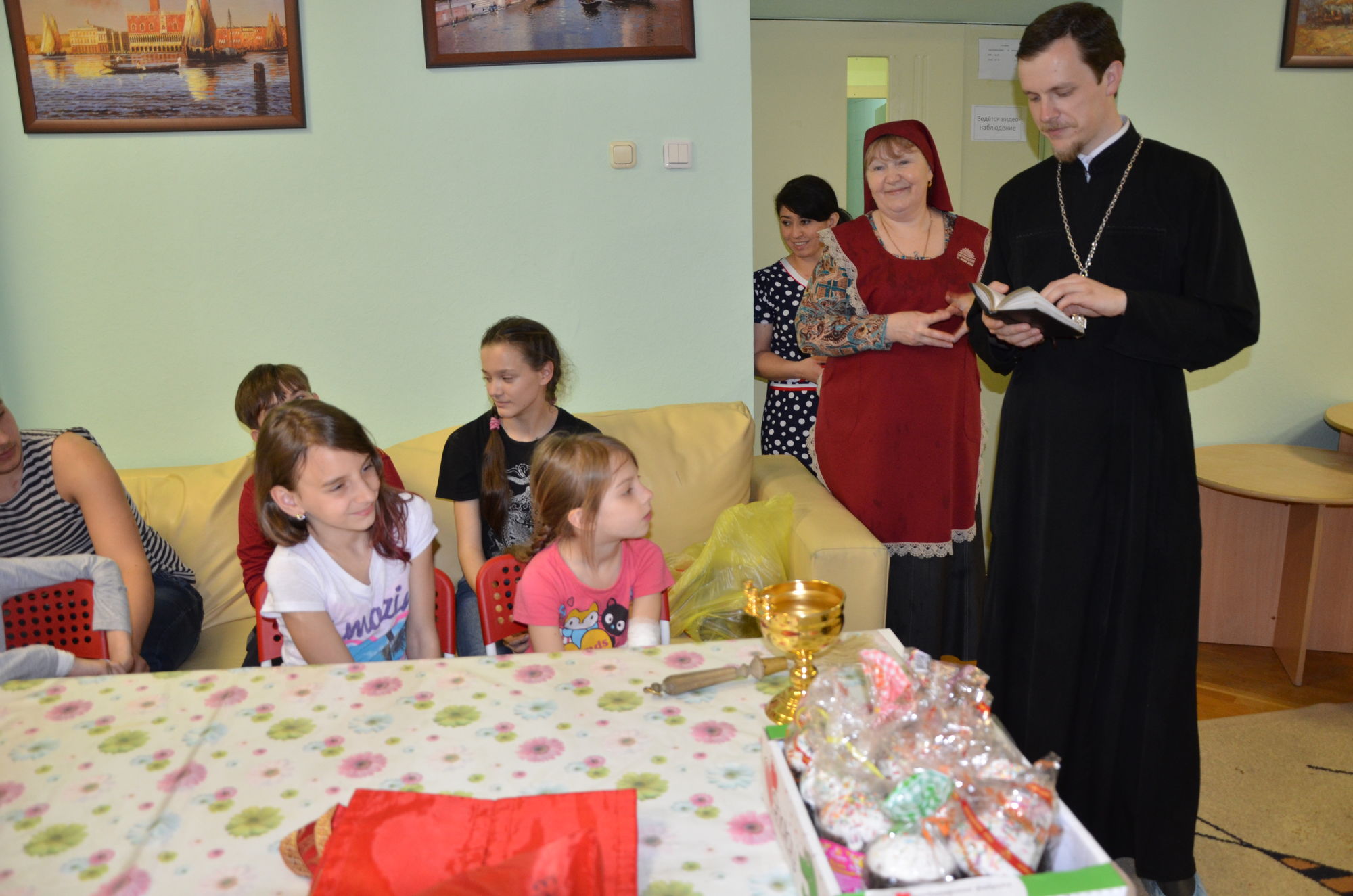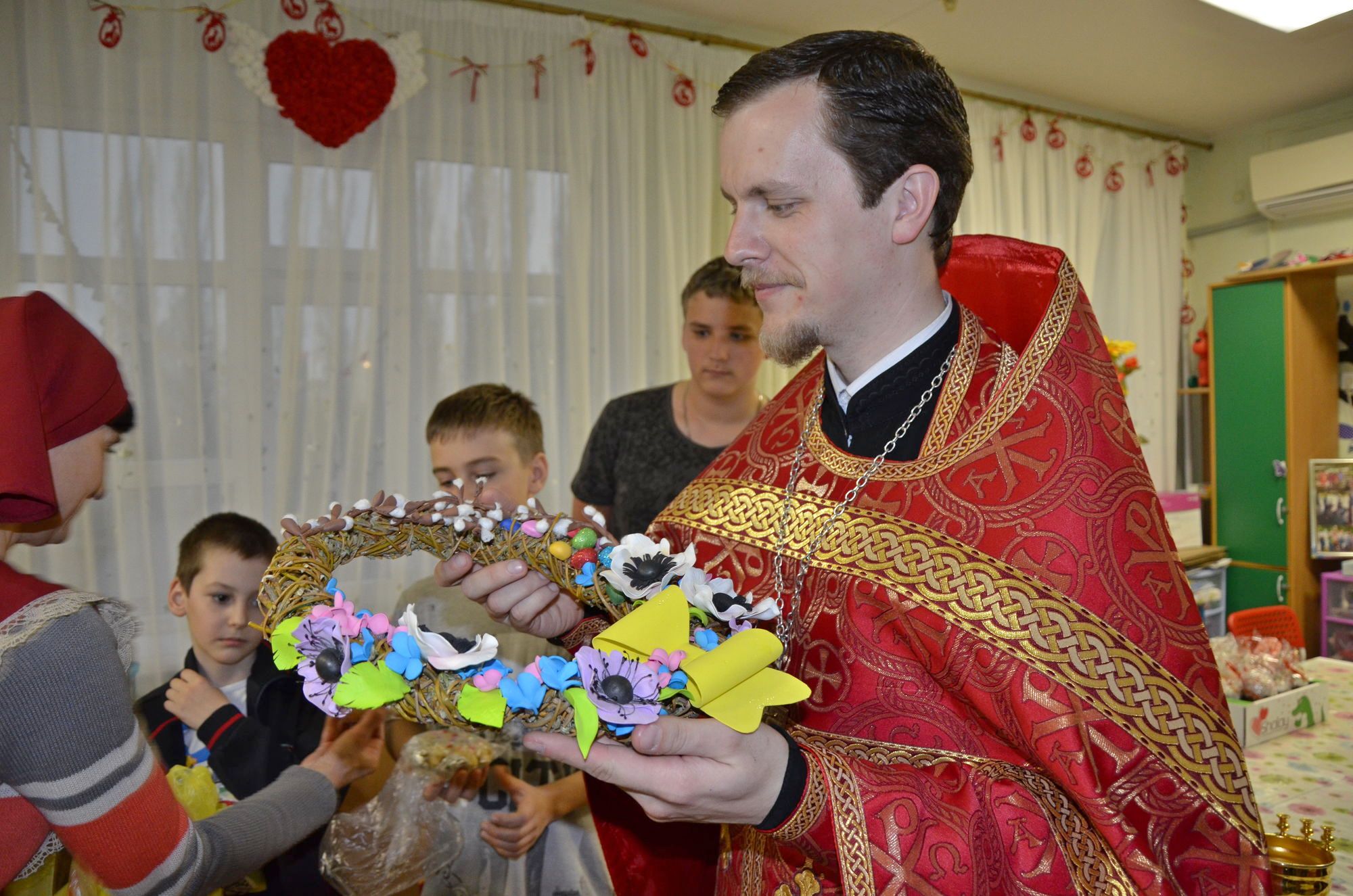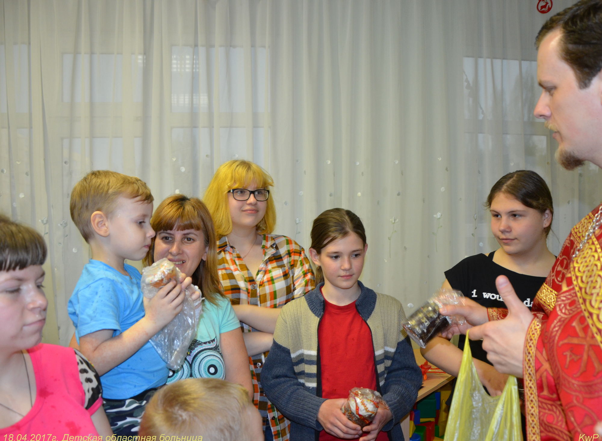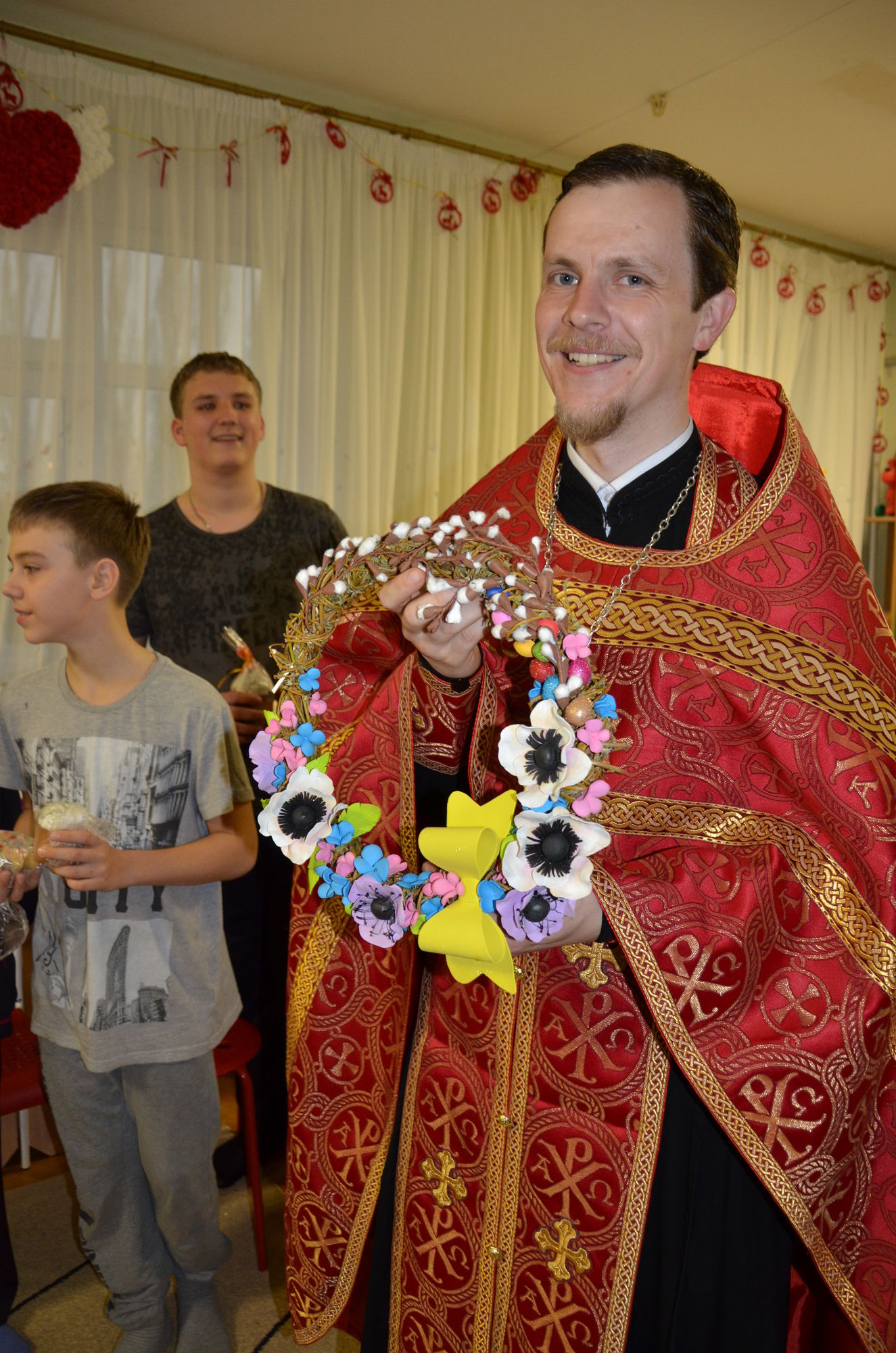 Ребята, родители, администрация отделения собрались в комнате отдыха, где отец Роман рассказал о празднике Пасхи, о нашем храме и о праздничной службе. Радостно было слышать, что многие ребята посещают храм Божий, а некоторые дети рассказали о традиции красить яйца и печь куличи. Все вместе мы молились о здравии этих детей и о даровании им скорейшего выздоровления. После того, как батюшка окропил всех святой водой, сестры раздали ребятам пасхальные куличи. Большой радостью было для нас то, что дети своими руками смастерили венок и подарили нашему приходу. Не остались в стороне и медработники. Им тоже были вручены пасхальные куличи.