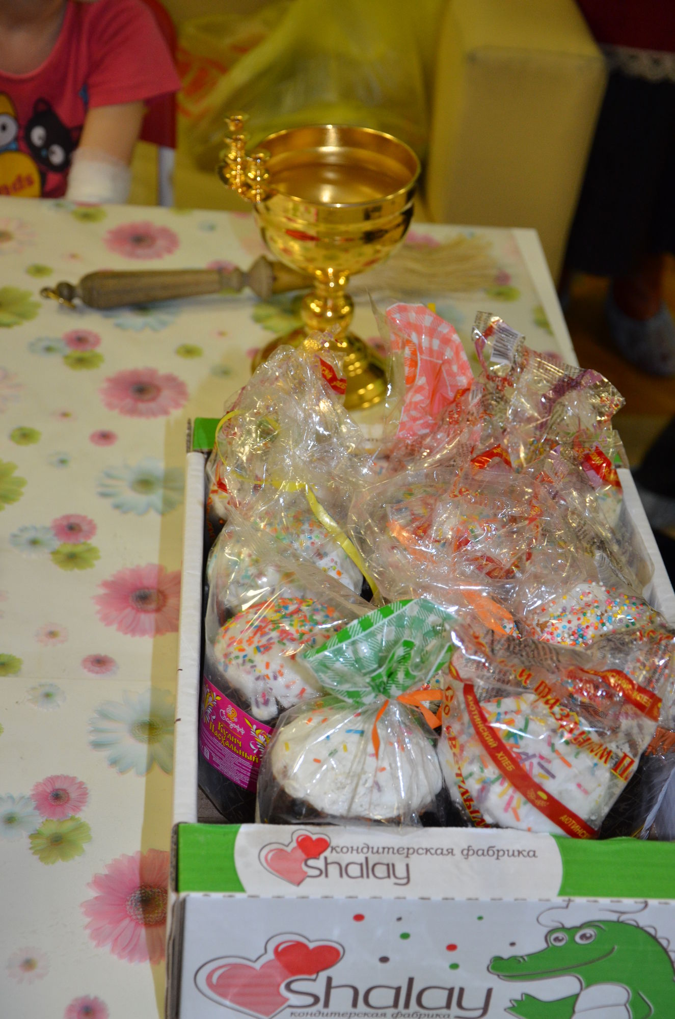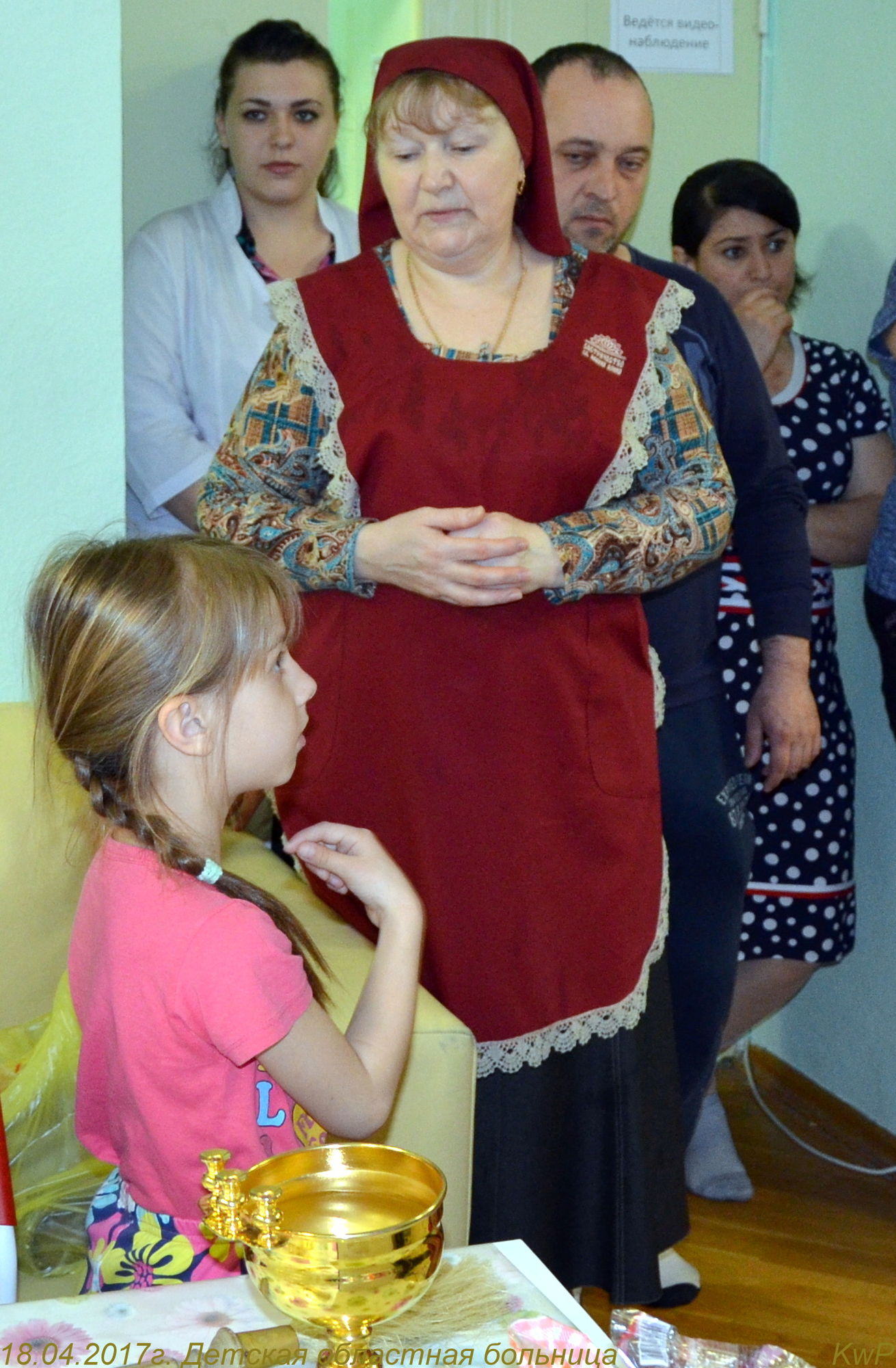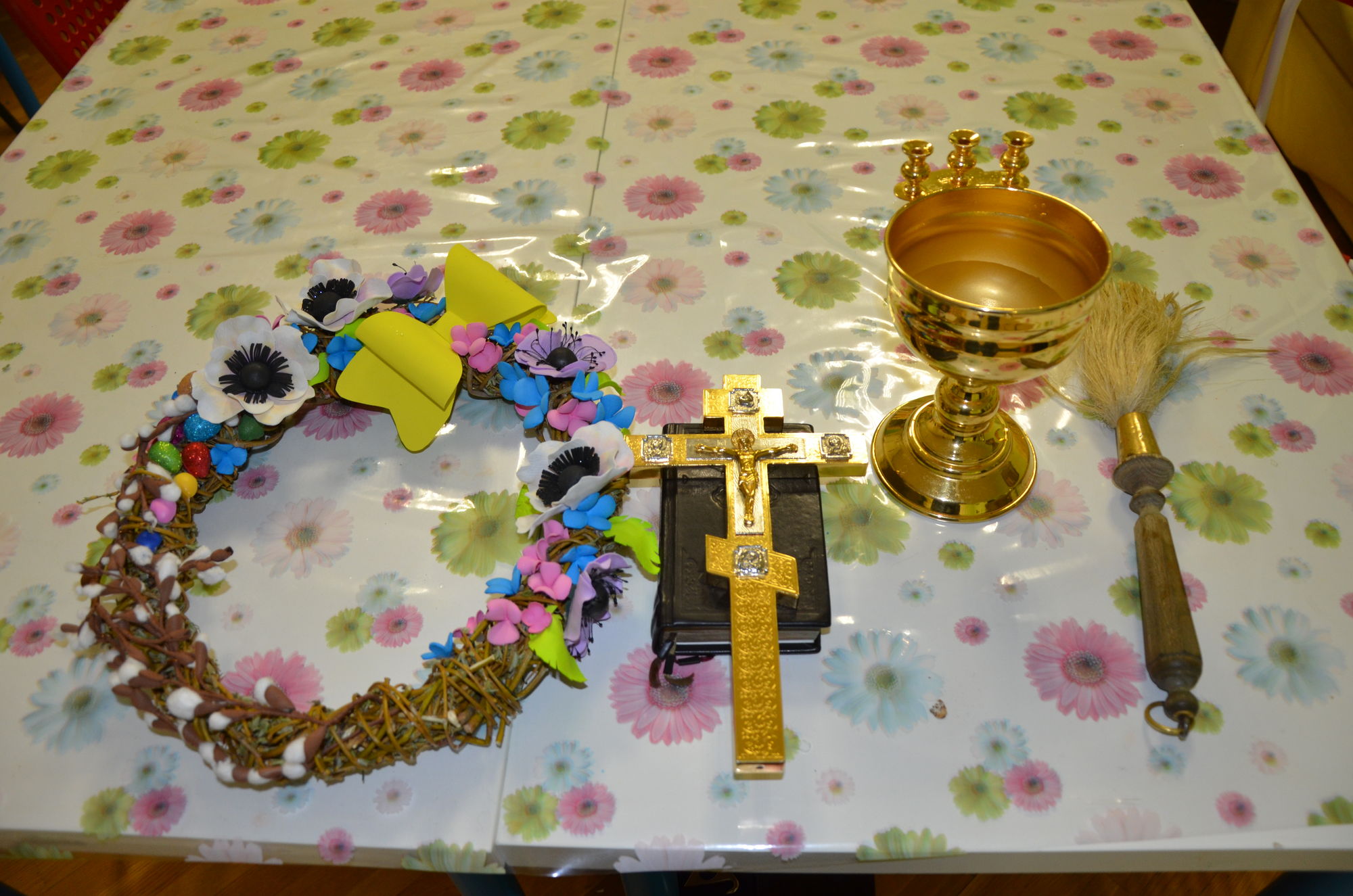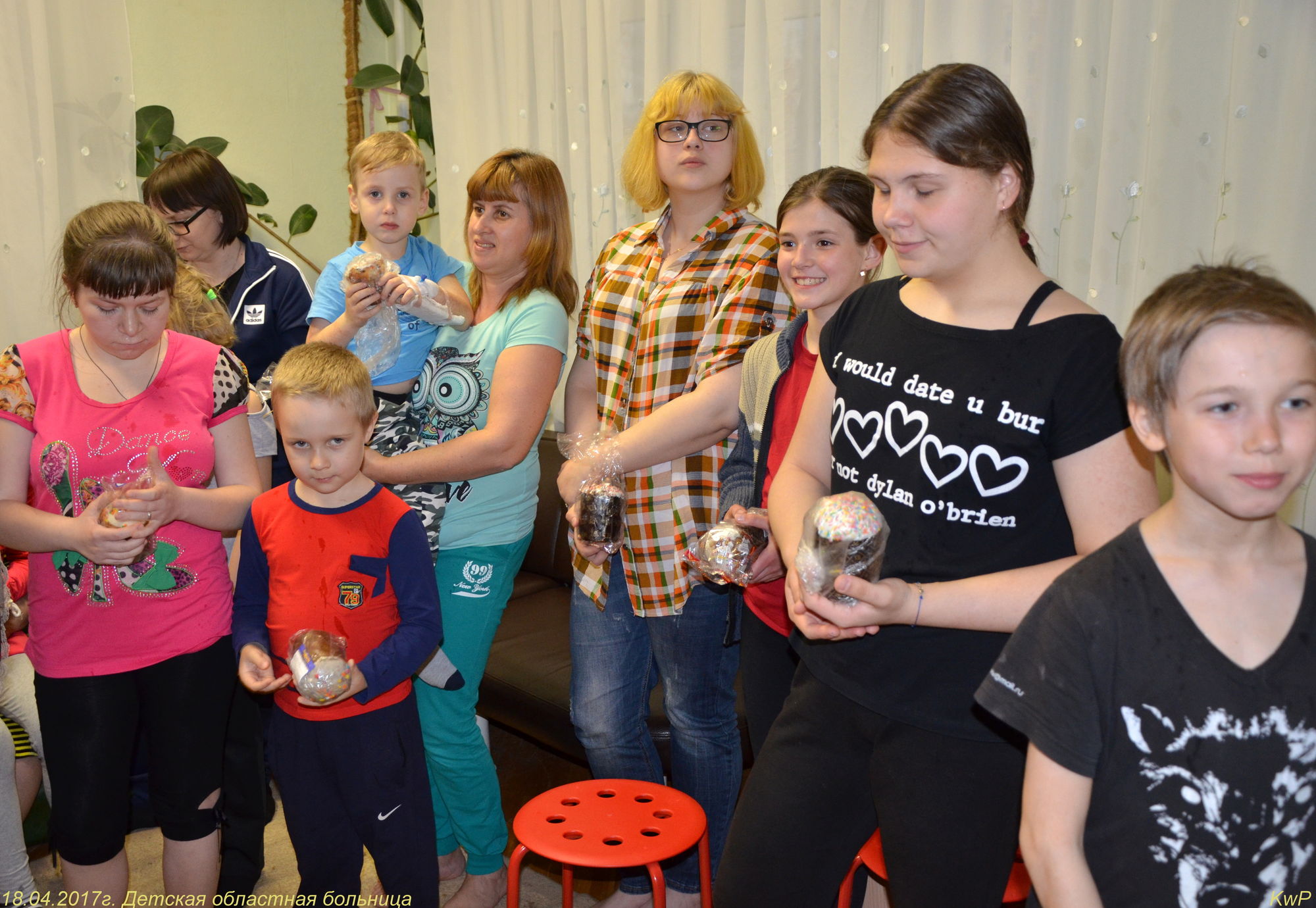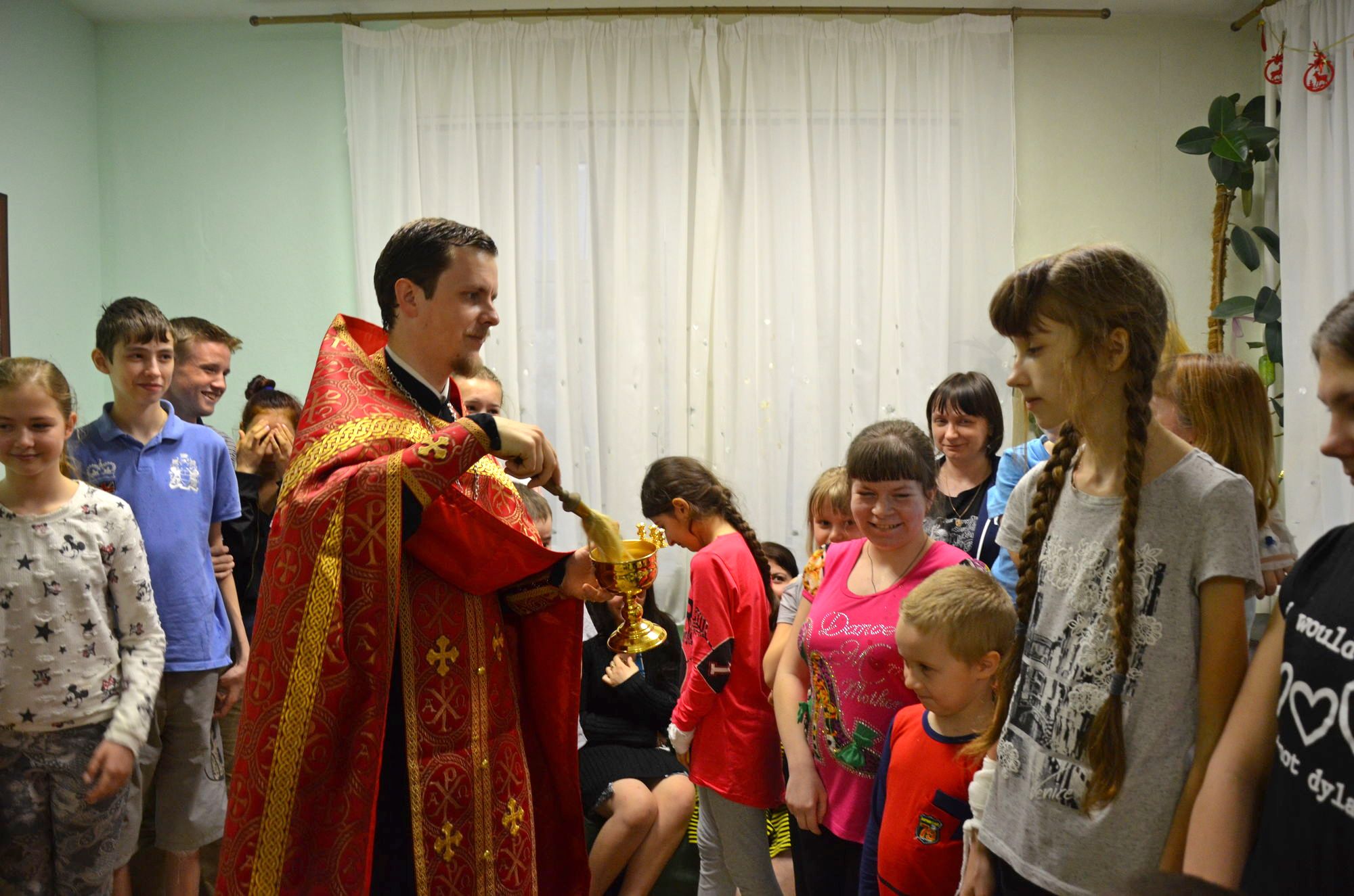 Ребята, родители, администрация отделения собрались в комнате отдыха, где отец Роман рассказал о празднике Пасхи, о нашем храме и о праздничной службе. Радостно было слышать, что многие ребята посещают храм Божий, а некоторые дети рассказали о традиции красить яйца и печь куличи. Все вместе мы молились о здравии этих детей и о даровании им скорейшего выздоровления. После того, как батюшка окропил всех святой водой, сестры раздали ребятам пасхальные куличи. Большой радостью было для нас то, что дети своими руками смастерили венок и подарили нашему приходу. Не остались в стороне и медработники. Им тоже были вручены пасхальные куличи.