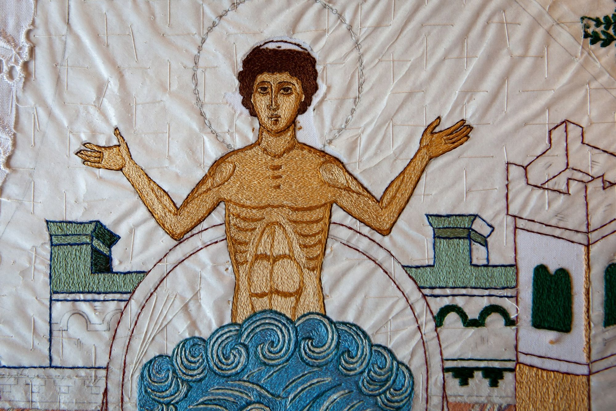 Наши мастерицы золотного шитья неустанно трудятся над большим проектом священнического облачения. Уже вышиты епитрахиль с изображением избранных святых, палица с иконой Сорока мучеников Севастийских и поручи с образом Евхаристии. В разработке – набедренник с иконой святого Иоанна Воина и пояс.