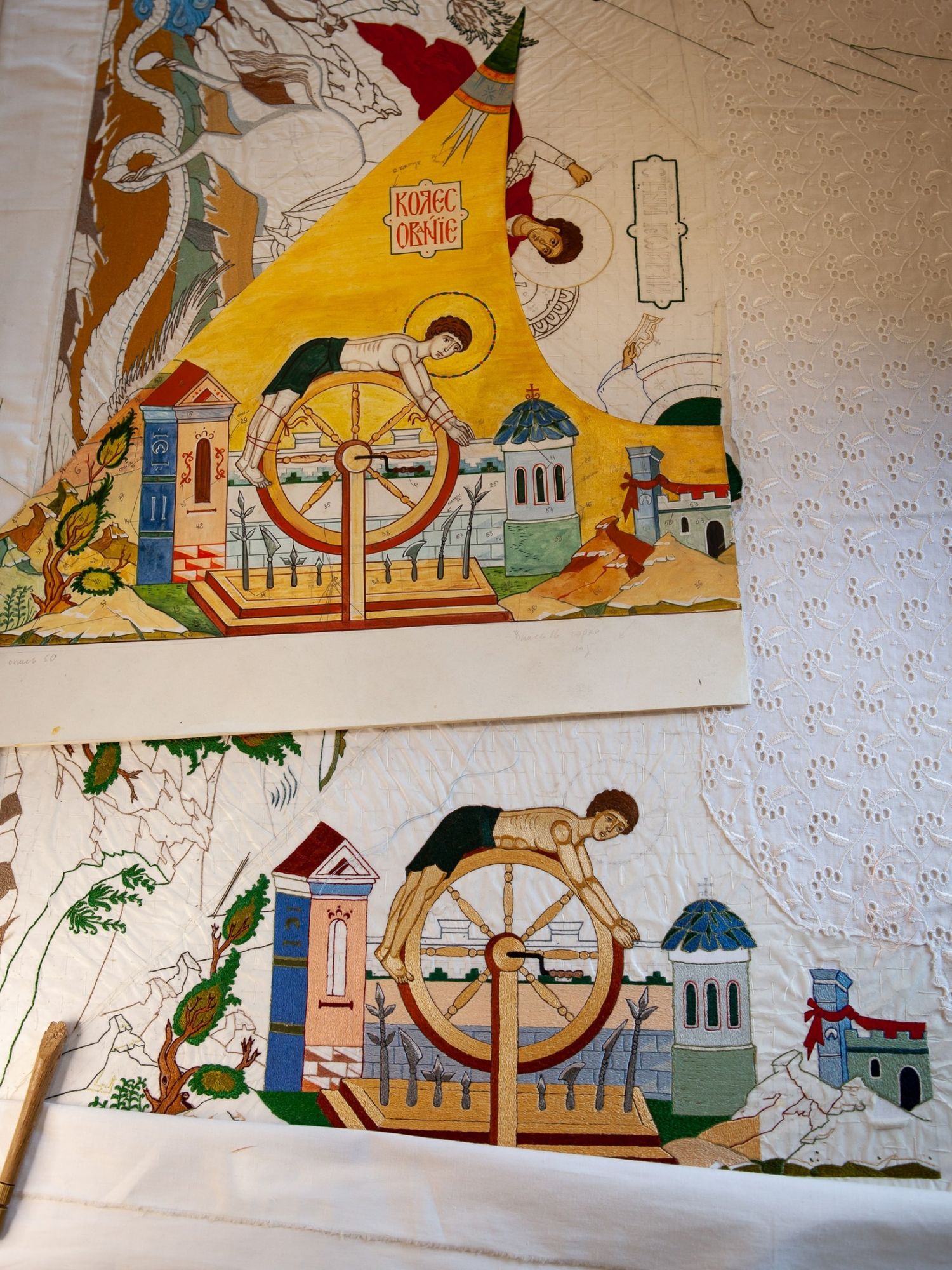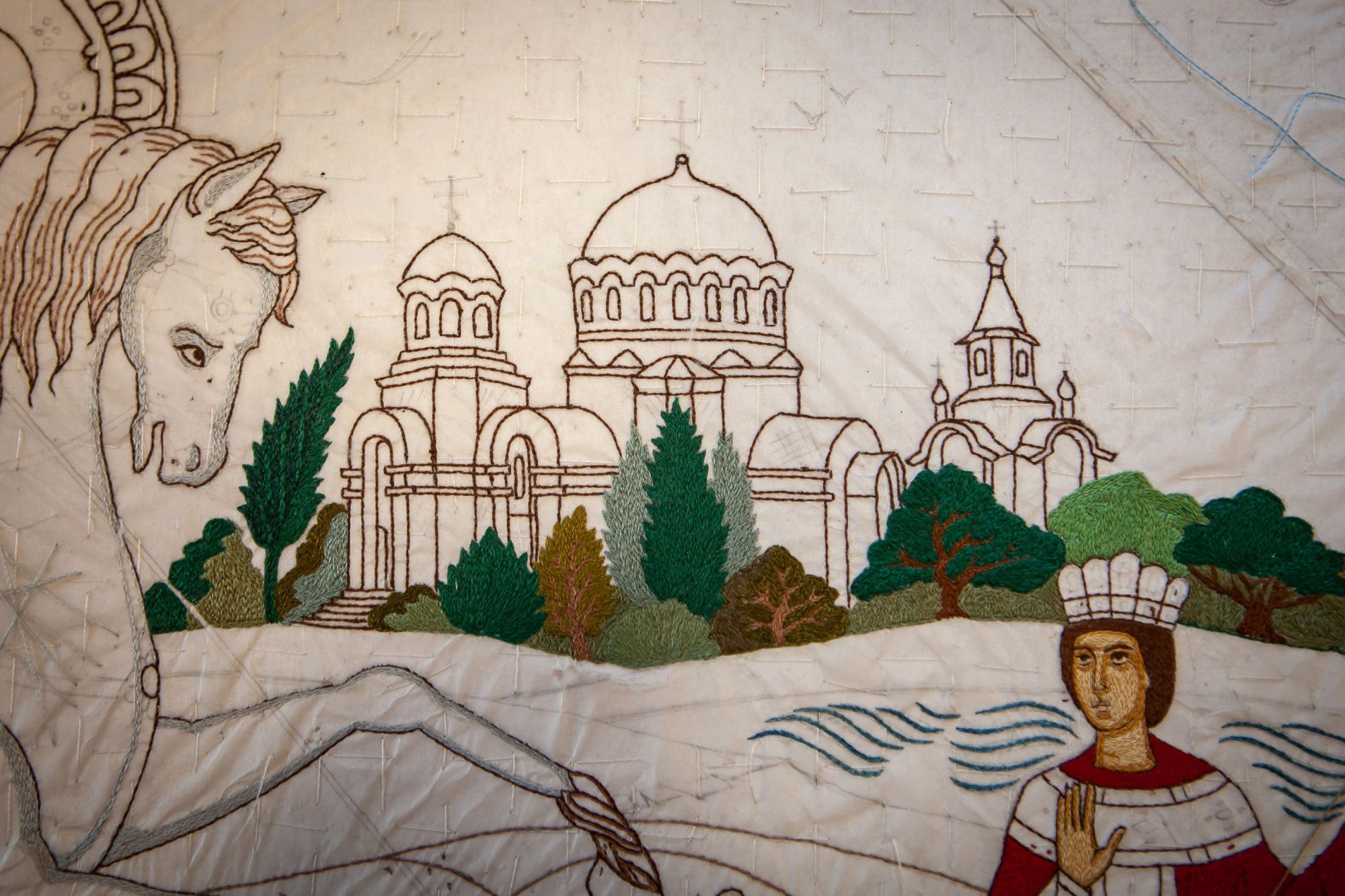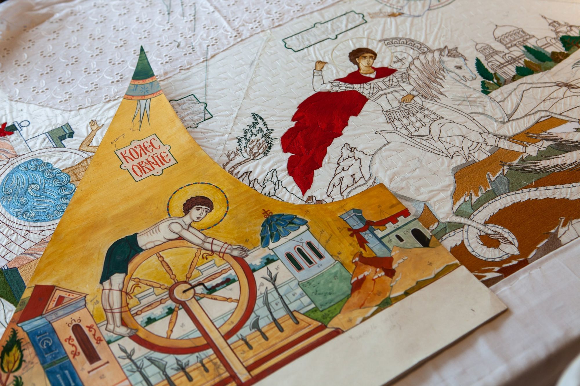 На данном этапе идёт работа над вышивкой оплечья фелони. На нем изображены сюжеты из жития святого Георгия Победоносца: чудо о змии, колесование Георгия и мучение в извести. Примечательно, что на заднем плане оплечья можно увидеть наш храмовый ансамбль. Нашли?