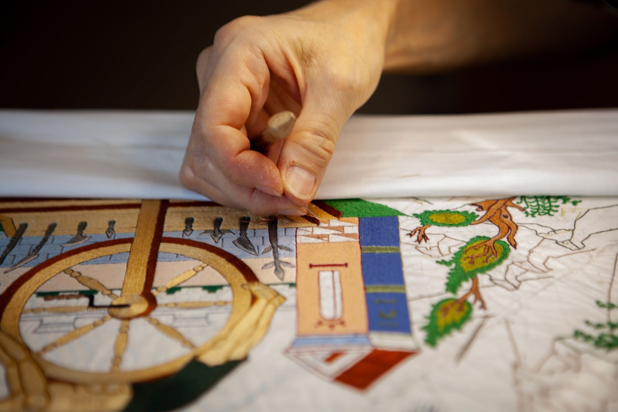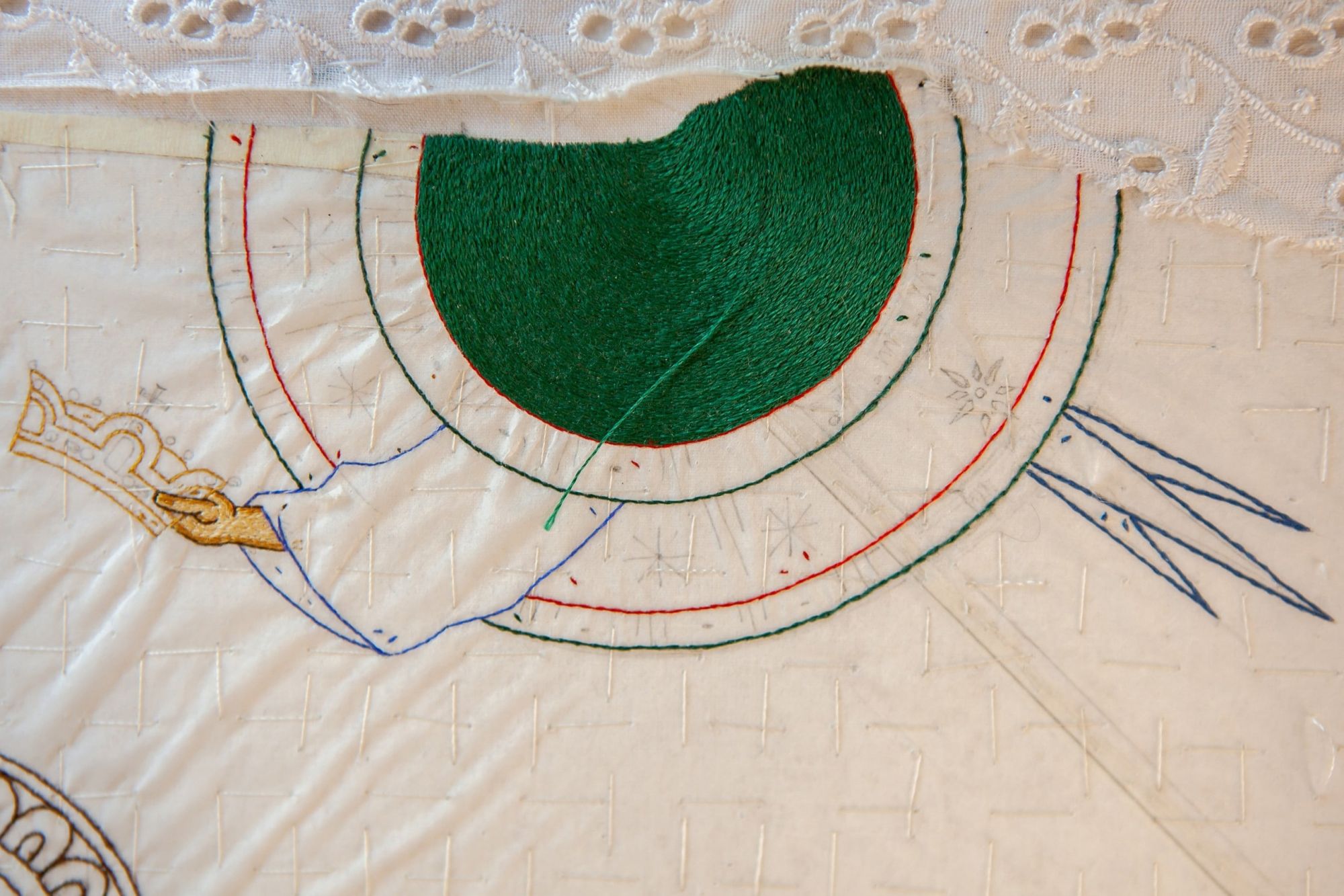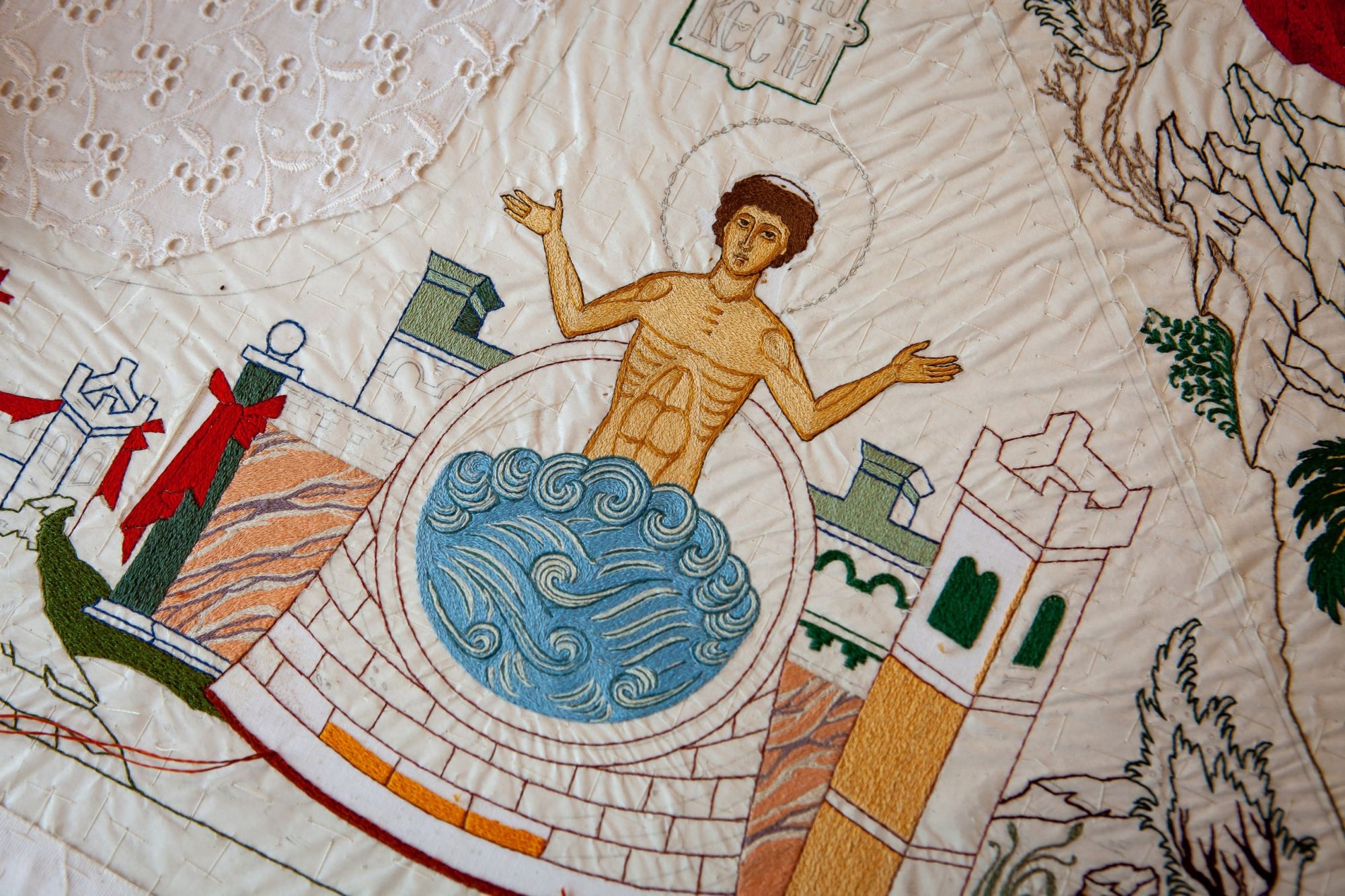 На данном этапе идёт работа над вышивкой оплечья фелони. На нем изображены сюжеты из жития святого Георгия Победоносца: чудо о змии, колесование Георгия и мучение в извести. Примечательно, что на заднем плане оплечья можно увидеть наш храмовый ансамбль. Нашли?