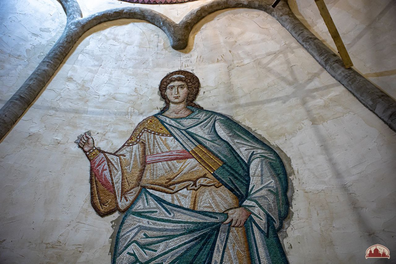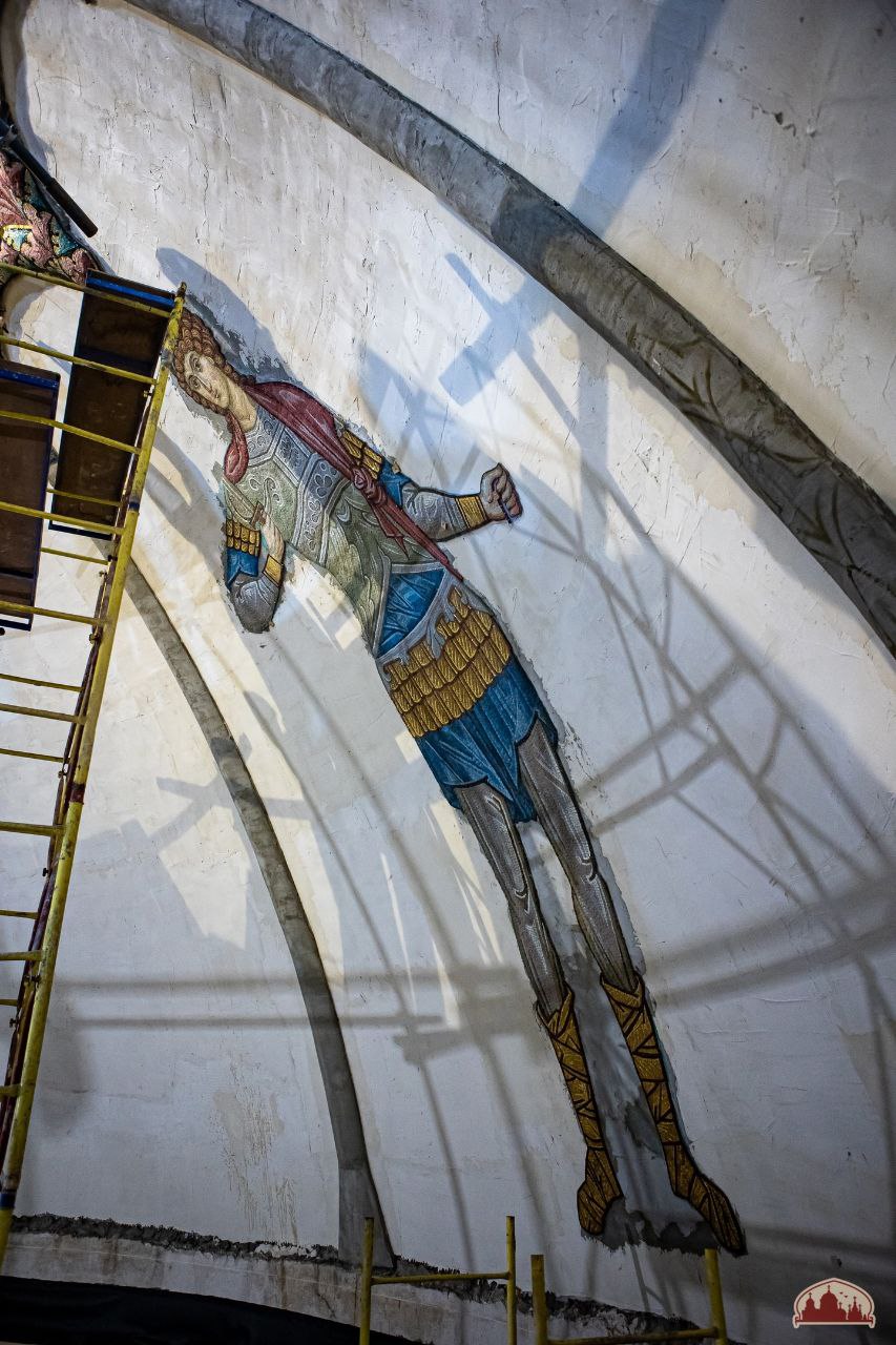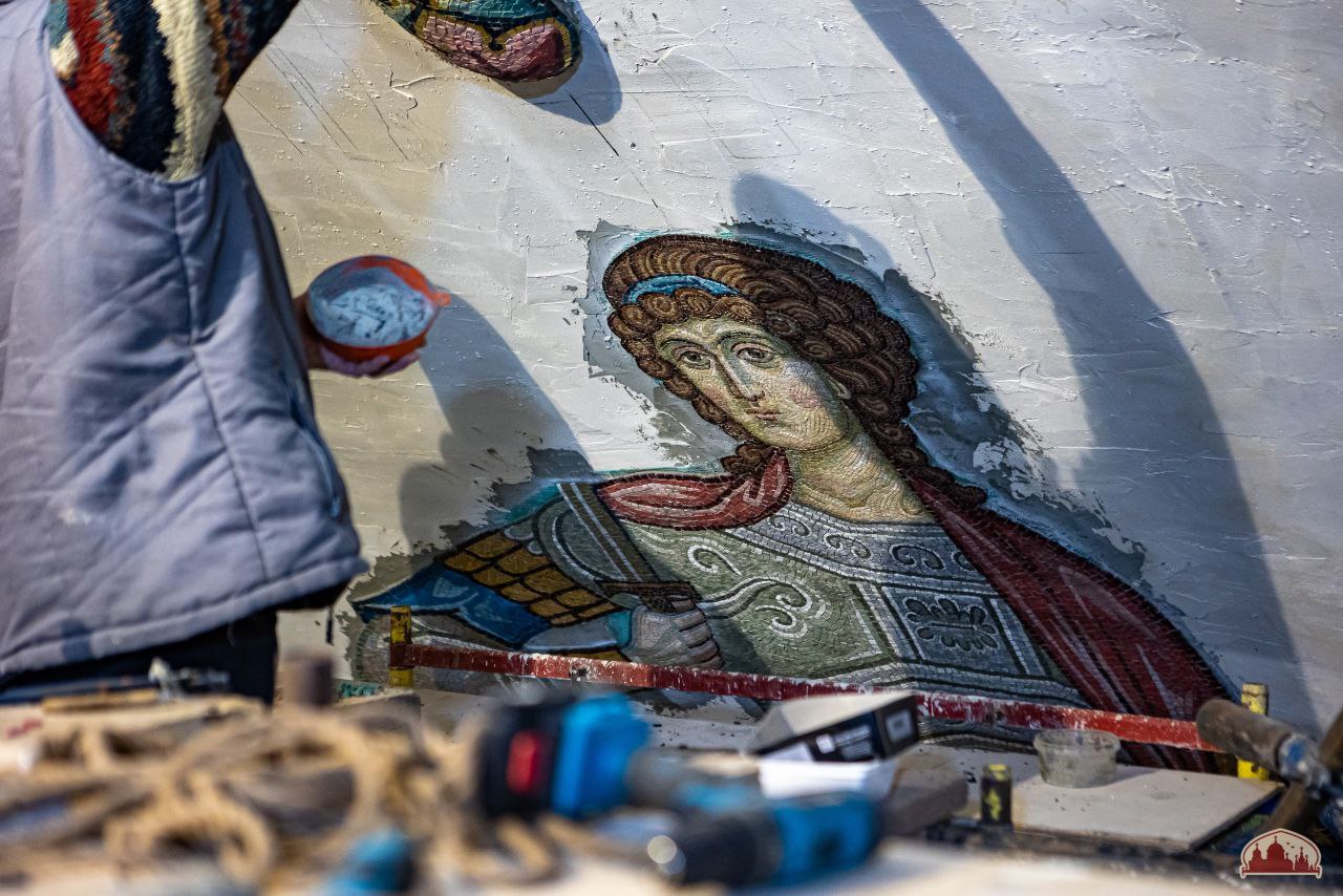 Мы забрались к ним не только, чтобы самим посмотреть на работу мастеров, но и показать вам. Две шестиметровые фигуры Архангелов уже заняли свое место, собран мозаичный пояс по всей окружности купола, началась отделка декоративных элементов.