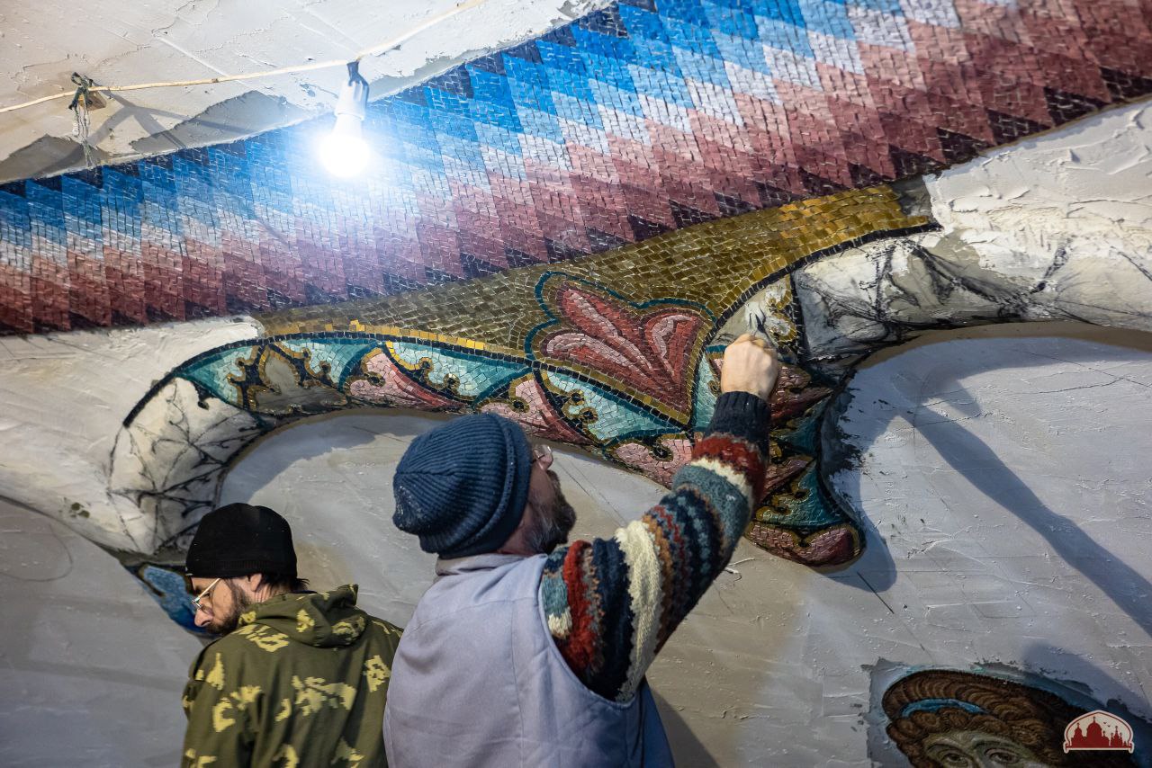 На высоте 33 метров от земли под куполом строящегося храма трудятся мозаичисты.