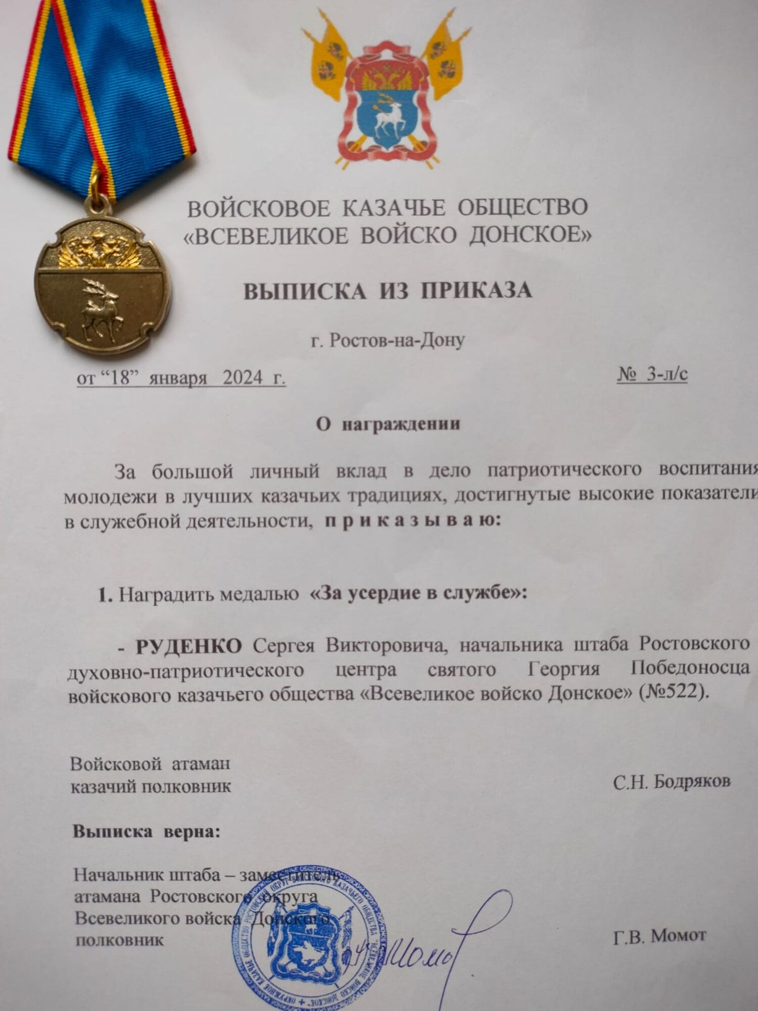 Приказом Заместителя Губернатора Ростовской области, Атамана войскового казачьего общества «Всевеликое войско Донское» Бодрякова Сергея Николаевича (№3-л/с от 18 января 2024 года) за большой личный вклад в дело патриотического воспитания молодежи в лучших казачьих традициях, достигнутые высокие показатели в служебной деятельности, Чуцков Виктор Иванович, Руденко Сергей Викторович, Погодин Владимир Владимирович и Сомов Денис Викторович были награждены медалью «За усердие в службе»!