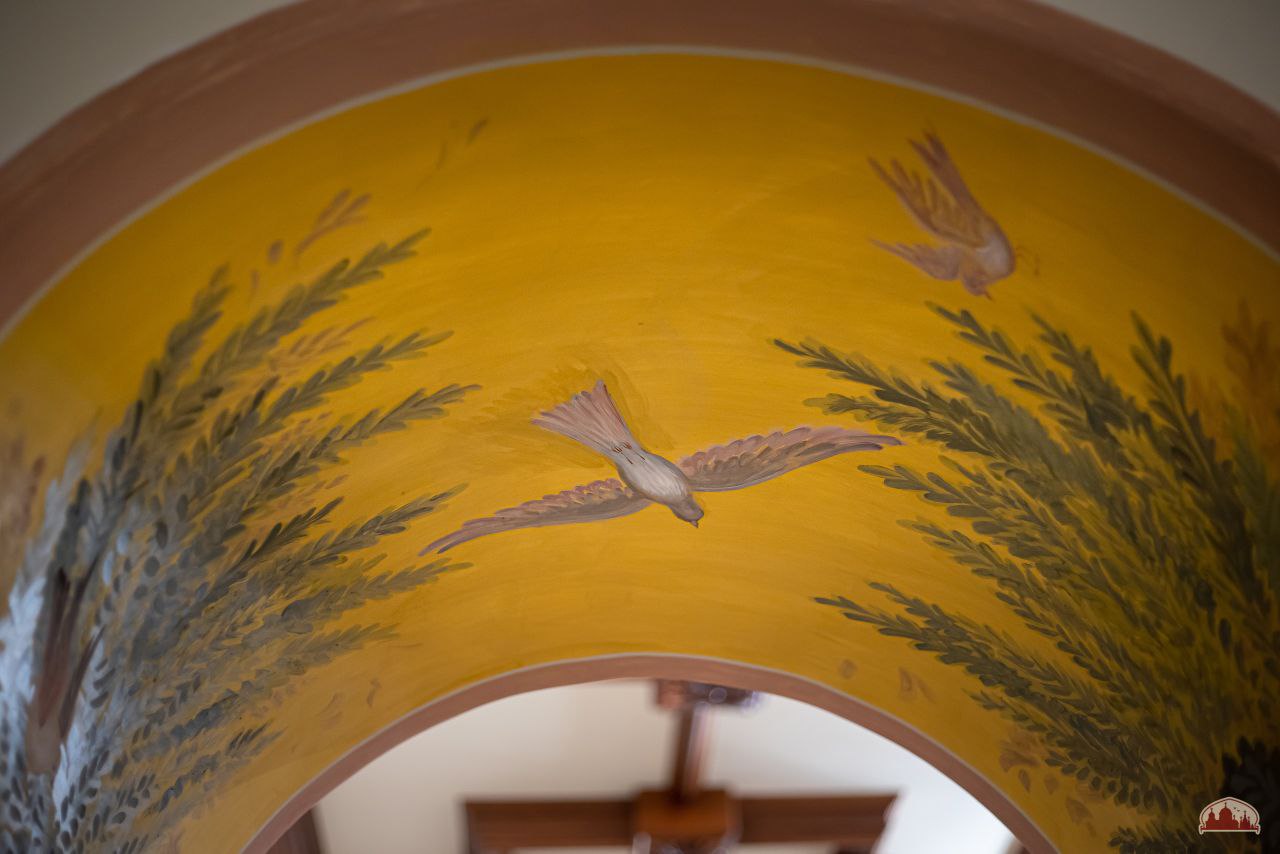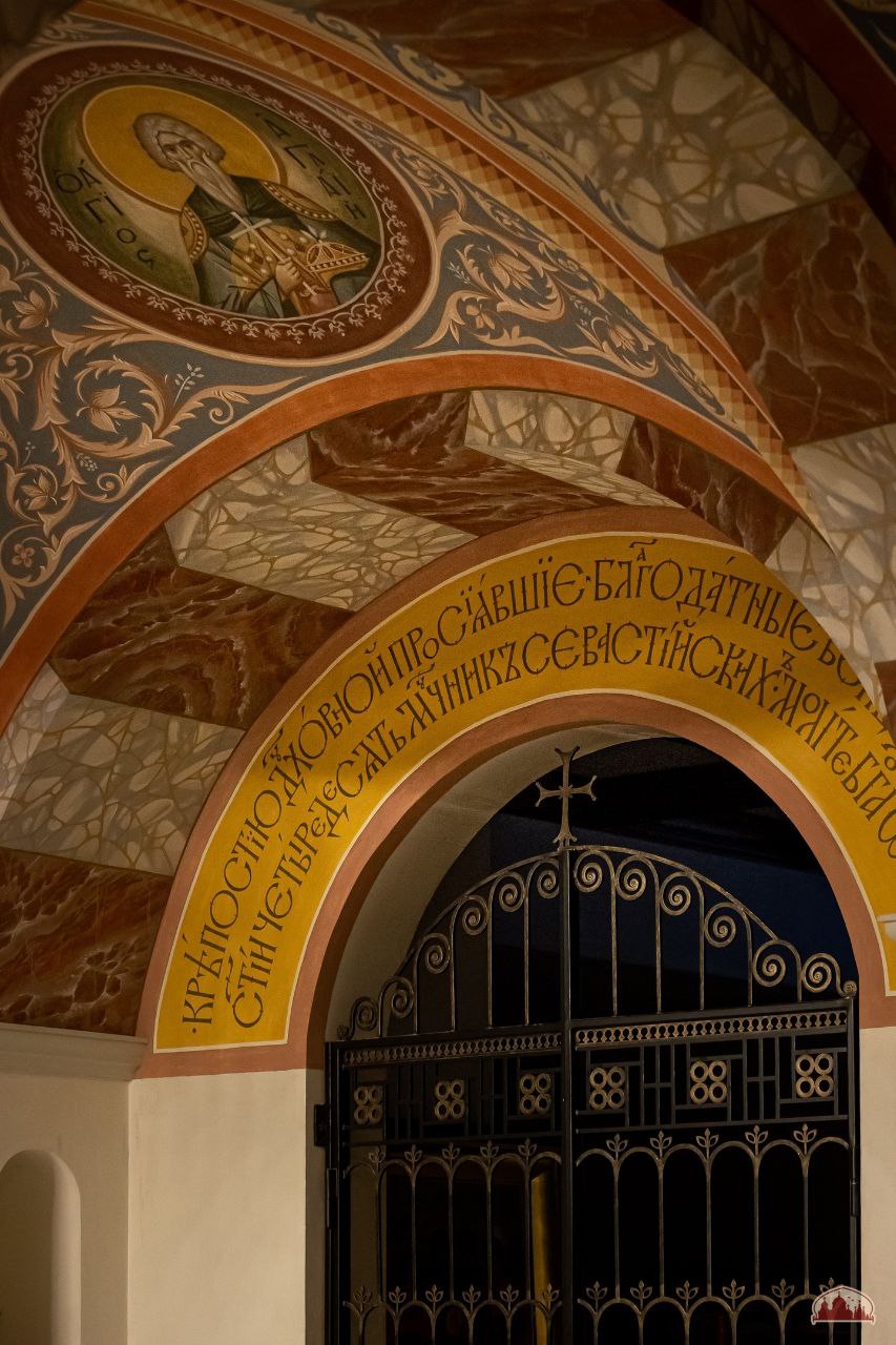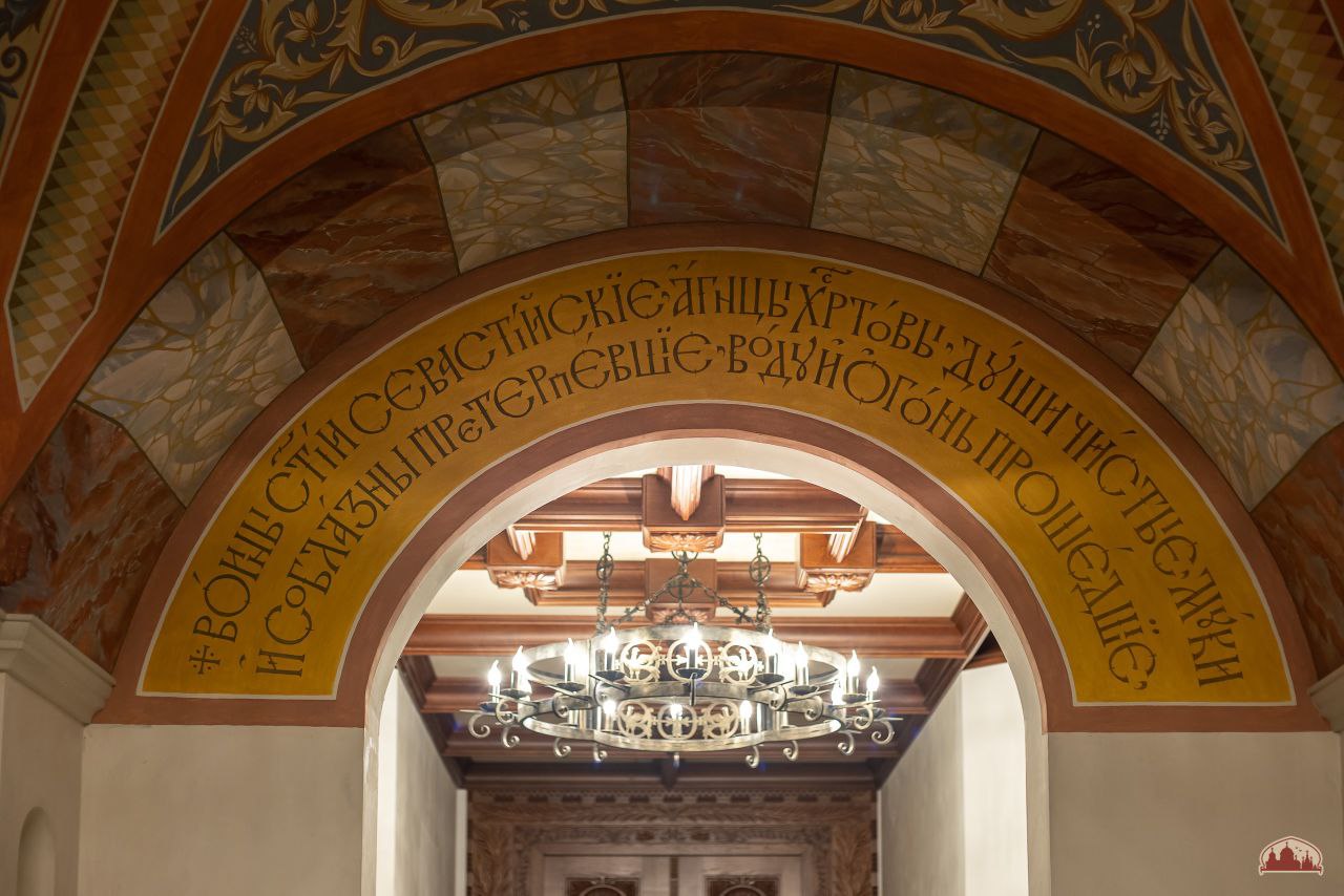 На арках центральной части храма завершены работы по созданию гипсовых панно с изображением виноградной лозы — символа Христа и Его Церкви. Продолжается роспись спарушенных сегментов галереи, создаются надписи, напоминающие нам о подвиге воинов молниеносного легиона.
