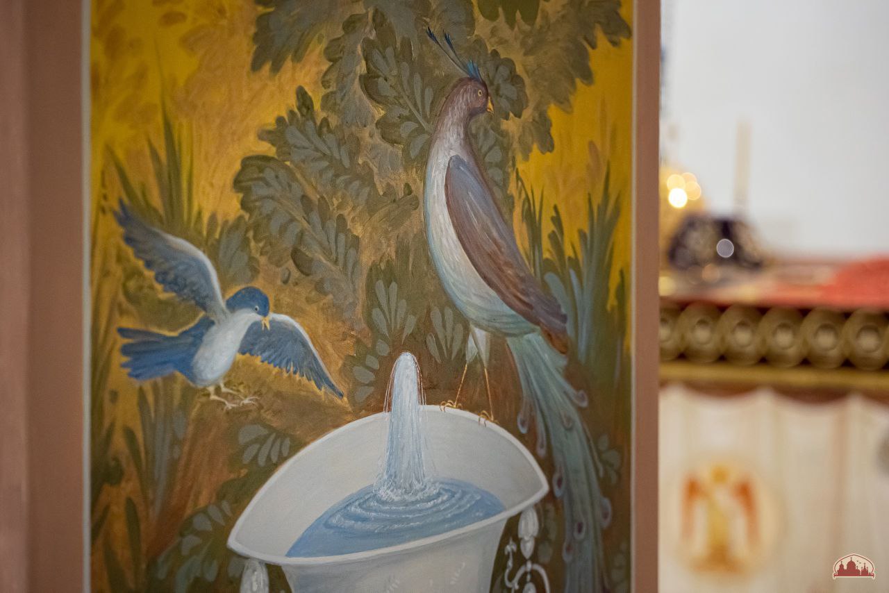 В алтаре иконописцем, преподавателем МДА Анатолием Алешиным создается большой образ воинов-мучеников. Уже сейчас можно увидеть, как на фоне райского сада появляются прекрасные райские птицы, символизирующие духовную красоту и благодать.
