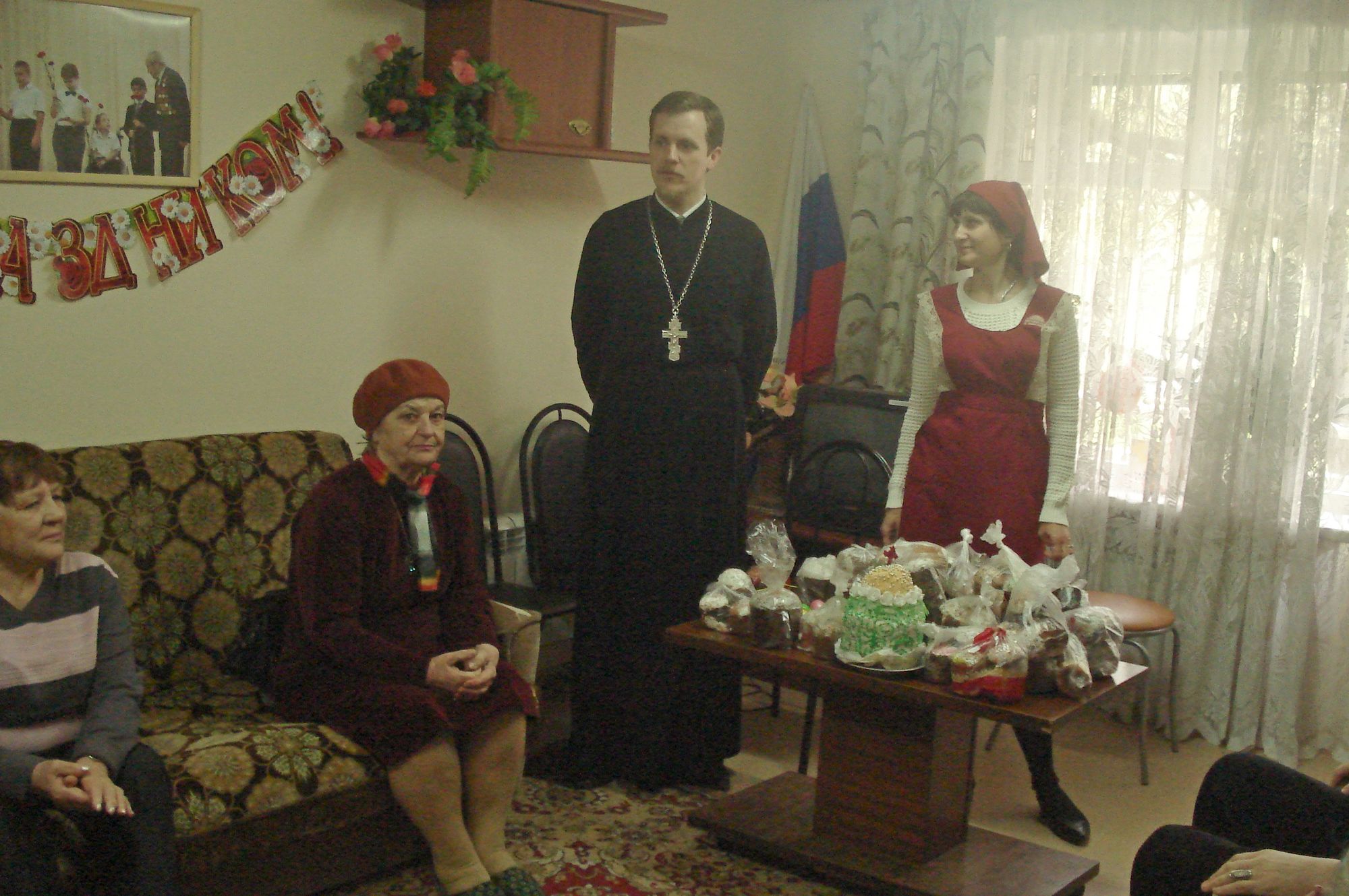 19 апреля 2017 года иерей Роман Зимин, старшая сестра Храма Иоанна Воина Ольга Терехова и сестра милосердия Валентина Кижикина посетили Центр социального обслуживания населения Советского района и поздравили всех со светлым праздником Пасхи! Встреча прошла в доброй и теплой обстановке. Пенсионеры задавали батюшке интересующие их вопросы. Сестры рассказали о празднике Пасхи, о ночной литургии и о крестном ходе, который прошел в нашем храме. В конце встречи сестры раздали куличи, и была сделана фотография на память.