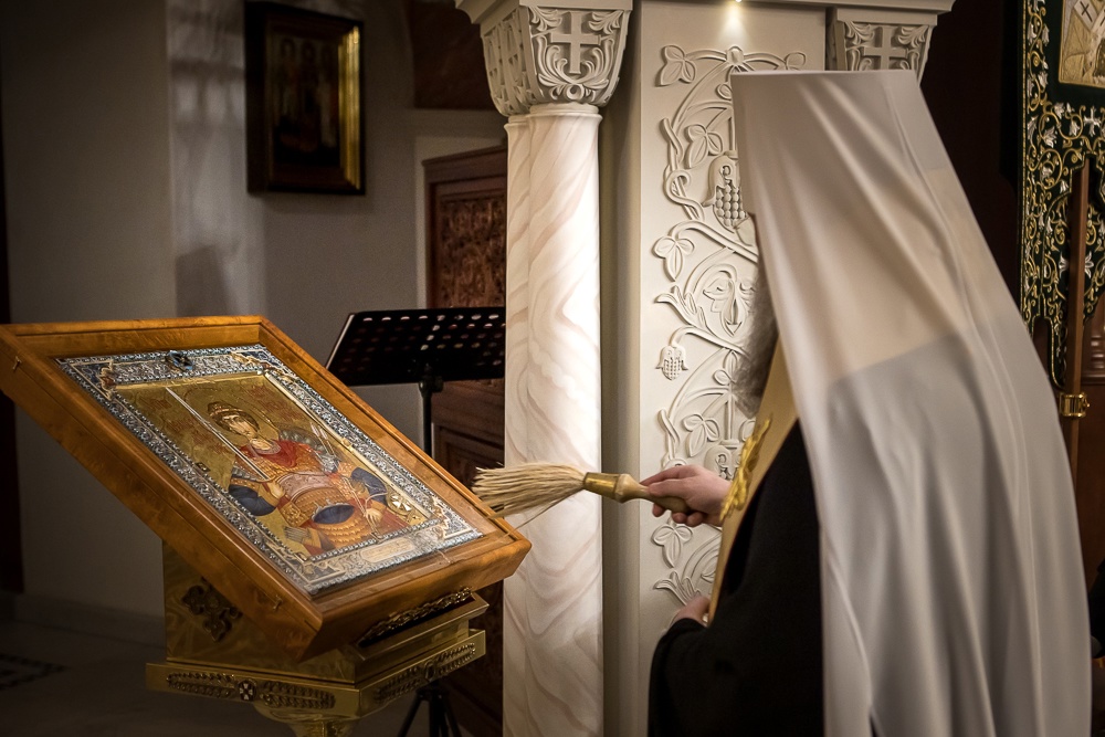 В криптовом храме в честь сорока Севастийских мучеников архипастырь освятил икону святого великомученика Георгия Победоносца с частицей святых мощей. Икона была освящена по случаю изготовления драгоценного оклада, выполненного на пожертвования военнослужащих ЮВО. На полях иконы изображены знак Южного военного округа и эмблемы воинских объединений, входящих в его состав.