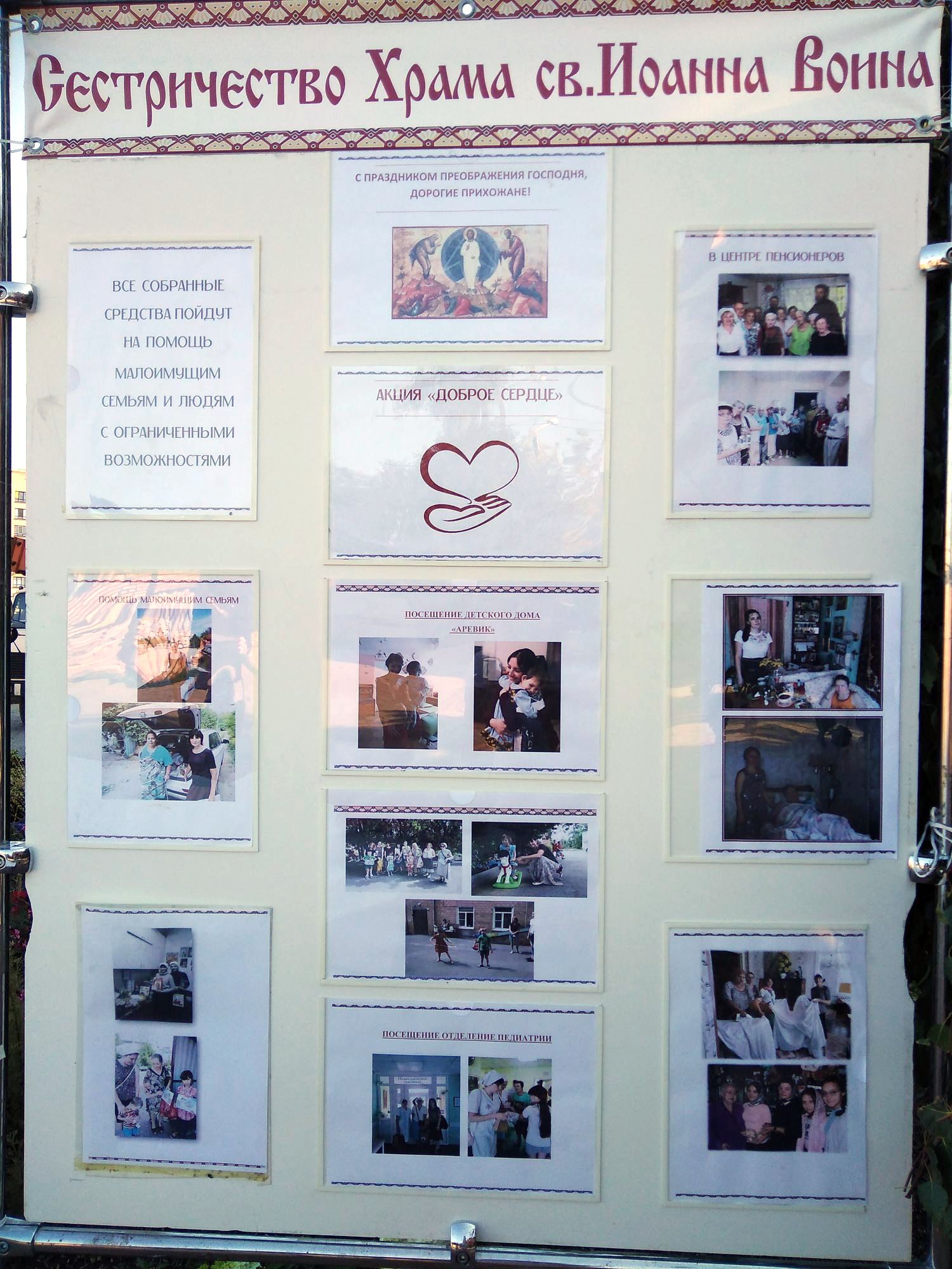Праздник Преображения Господня, 19 августа, также является всемирным днем гуманитарной помощи. В этот день сестричество храма святого Иоанна Воина провело акцию «Доброе сердце». Прихожане храма и сестры милосердия испекли пироги, пряники, пирожки и другую выпечку. Все полученные денежные средства будут направлены малоимущим семьям. Данная акция имеет важное значение для православных христиан, так как в Евангелии от Луки (6 глава, 36 стих) написано: «Итак, будьте милосерды, как и Отец ваш милосерд».