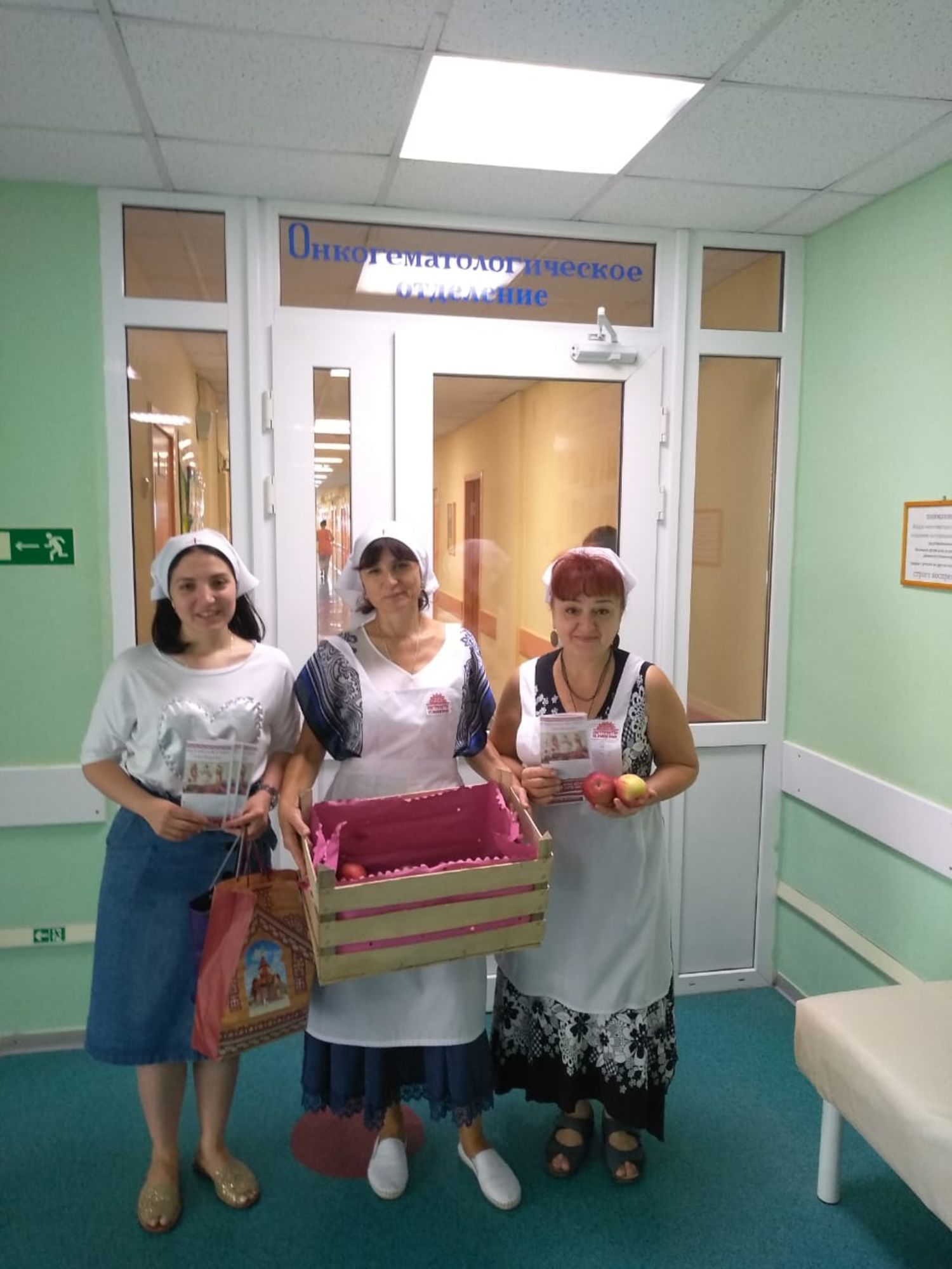 По благословению настоятеля протоиерея Валерия Волощука сестры навестили окормляемые отделения педиатрии и гематологии. В отделениях была проведена благотворительная акция по раздачи церковной утвари: крестиков, иконок и церковной литературы. Сестры рассказали о празднике, подарили каждому памятку и праздничную листовку. С праздником Преображения Господне сестры также поздравили администрацию больницы и подарили освященные фрукты. Детям сестры пожелали скорейшего выздоровления и угостили каждого освященным яблоком.