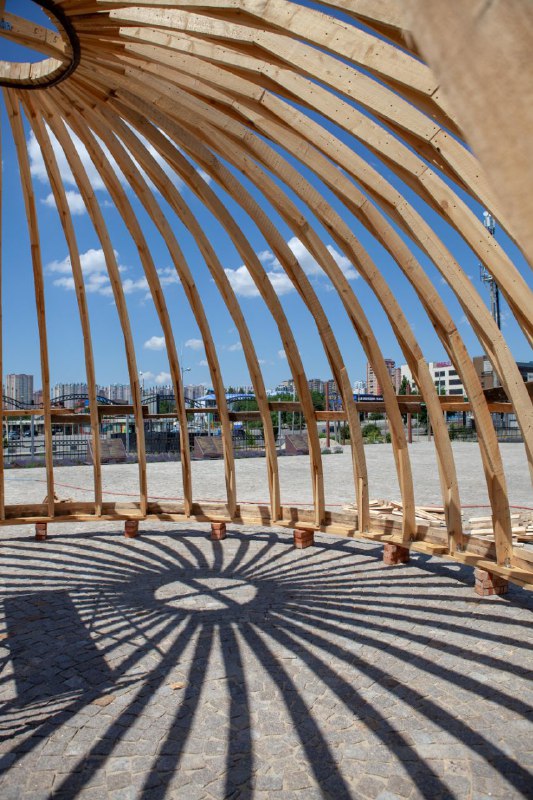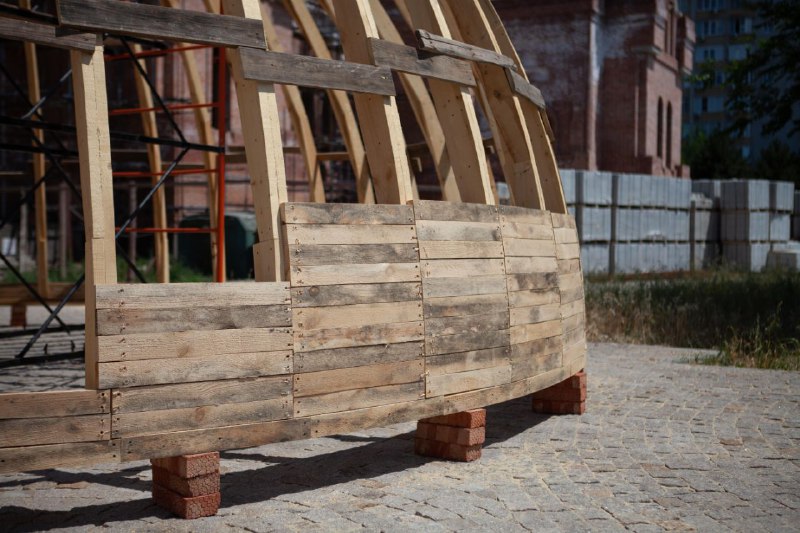 Собираем каркас для опалубки свода колокольни. Уже установлены ребра, которые будут обшиваться фанерой. После чего конструкцию поднимут на колокольню и обвяжут армокаркасом для будущей заливки бетоном.