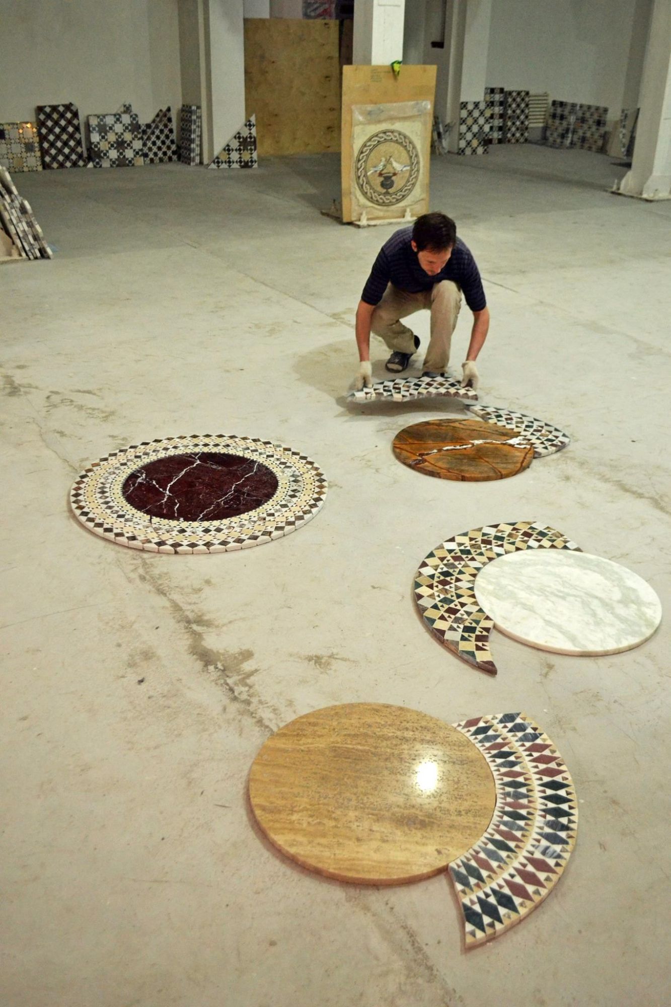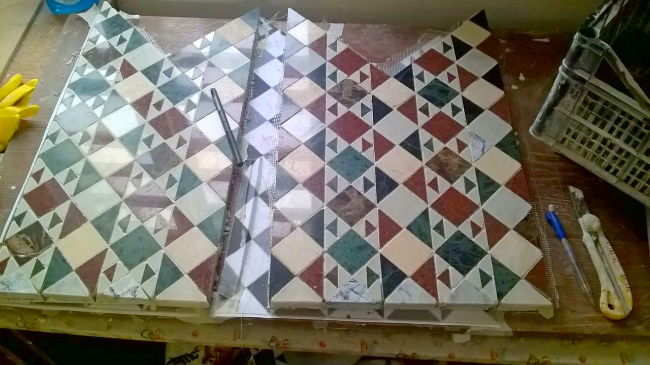 За это время было куплено и обработано более 30 тонн мрамора, гранита, кварцита, травертина, оникса и порфира – всего более 20 сортов камня из 7 стран мира. Около 15 тонн из этого количества было распилено более чем на четверть миллиона кусочков различных форм, размеров и цветов. К слову, для того чтобы распилить такое количество камней на кусочки было полностью сточено более 20 абразивных распиловочных дисков. Каждый из получившихся в результате кусочков камня побывал в руках специалистов по мозаике, был подогнан под нужный размер и вмонтирован в панно вручную. Около двух лет кропотливого и усердного труда потребовалось чтобы собрать все это в единый «живой» каменный рисунок общей площадью почти 500 квадратных метров.