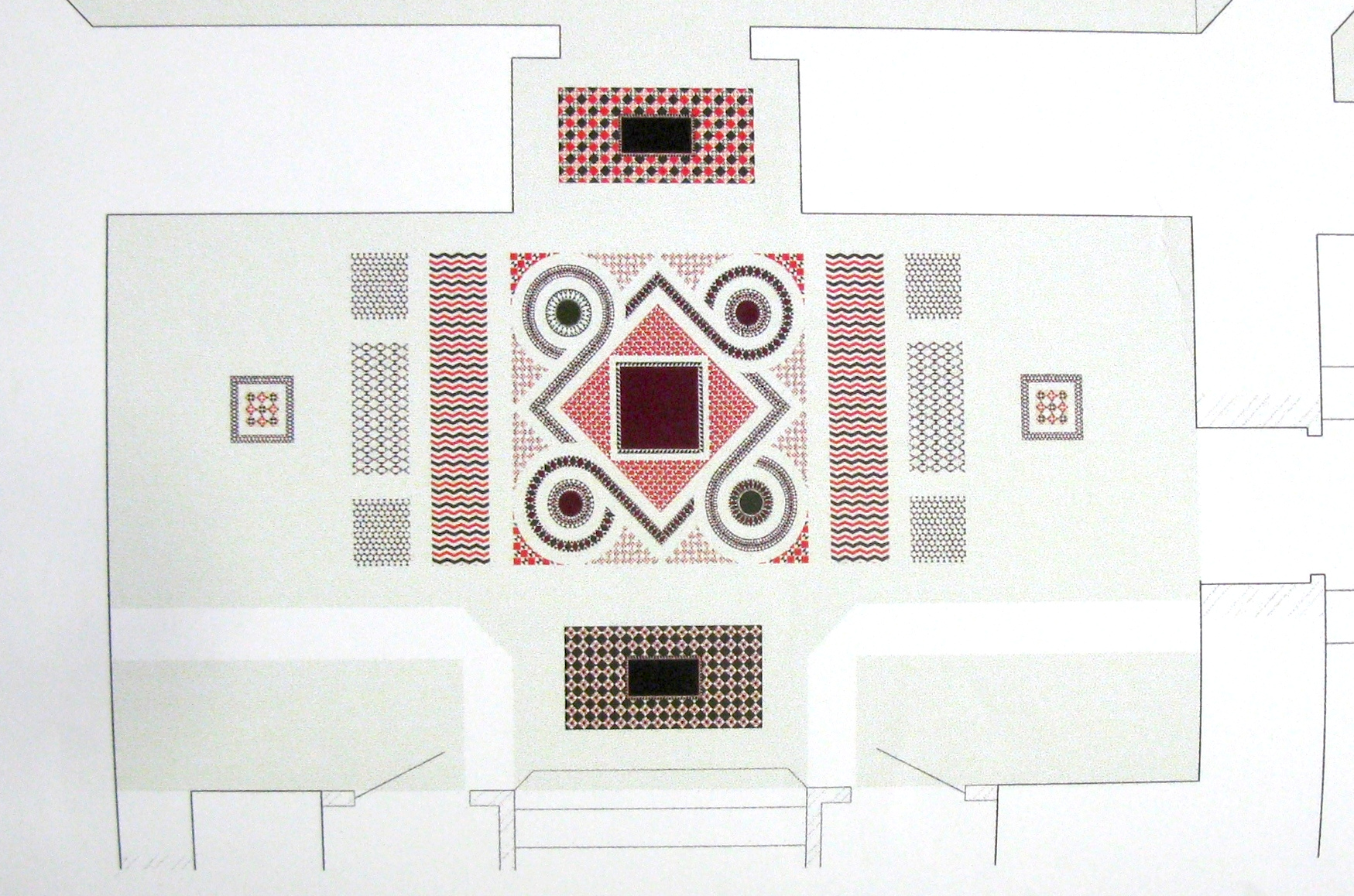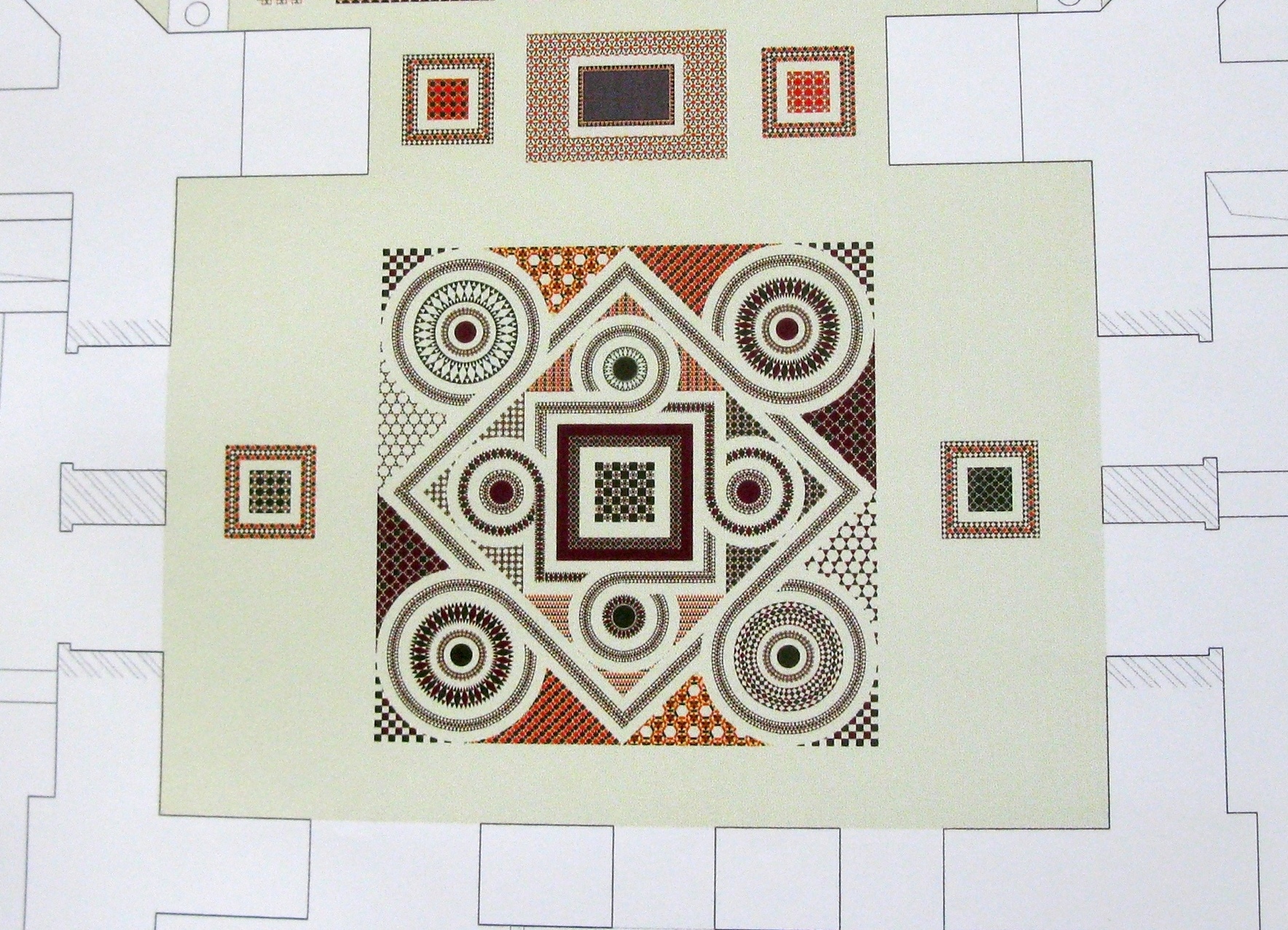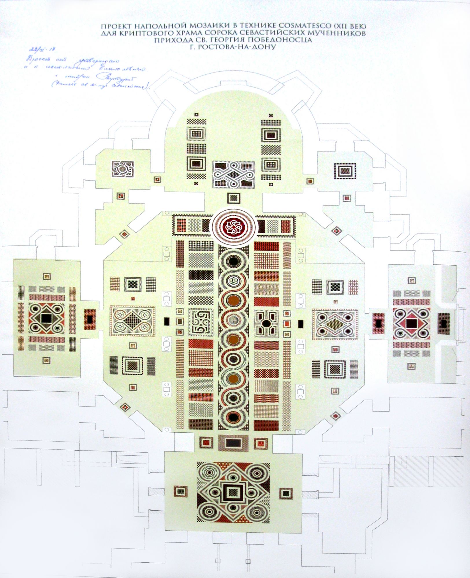 Структура этого храма довольно сложная. Необычная 8-гранная планировка центральной части, арочные колоннады, отделяющие две боковые галереи со сводчатыми арками от центрального наоса, замысловатая форма клироса, совмещенная с круглой солеей, отдельные помещения притвора и трапезной, которые предполагалось использовать, в том числе, и как часть храма во время литургий, полукруглая форма алтаря, многочисленные проходы - все эти части нужно было с помощью мозаичного напольного панно объединить в единое храмовое пространство, сохранив при этом уникальные архитектурные особенности каждого отдельного помещения и подчеркнуть их с помощью напольной мозаики. Создать проект для такого пространства, не перегруженный деталями, и при этом в меру насыщенный и праздничный, и в то же время на всех этапах полностью соответствовать исторически сложившимся правилам стиля Косматеско – непростая задача. Нужно сказать, что до того, как был утвержден окончательный план панно, художники разработали и отвергли в общей сложности 11 различных вариантов композиции пола.