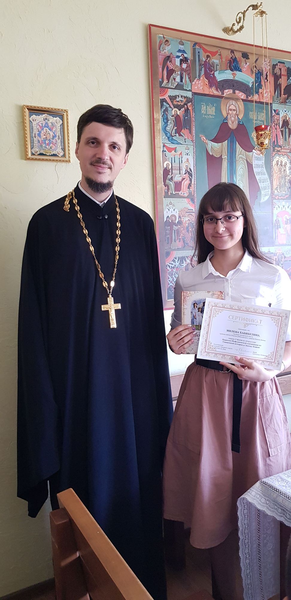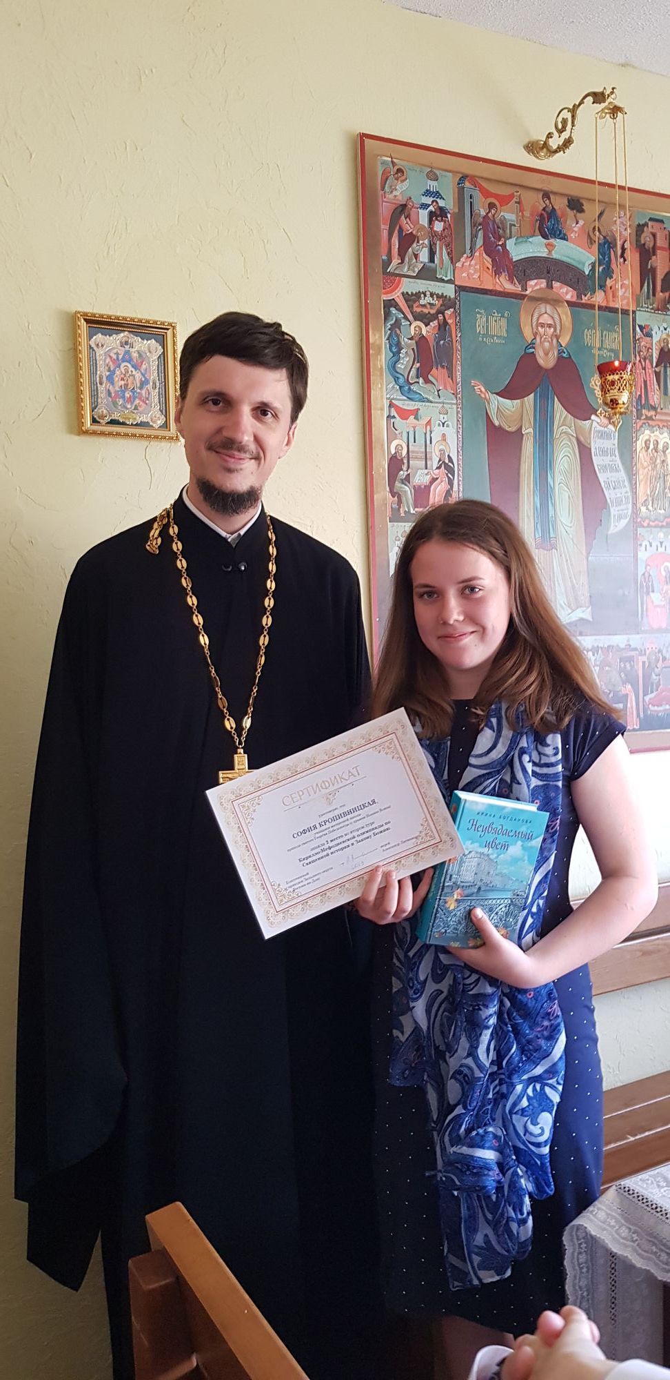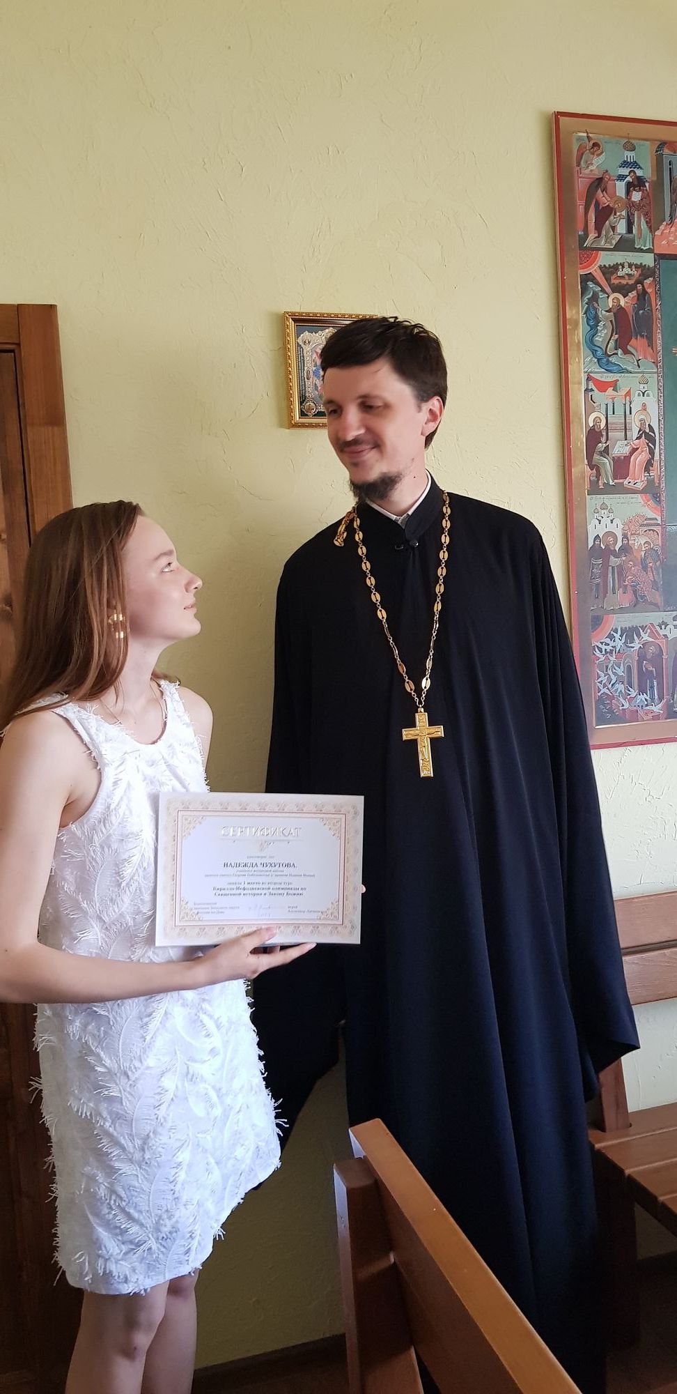 19 мая 2019 года благочинный приходов Западного округа иерей Александр Литвиненко наградил учеников нашей воскресной школы, занявших призовые места во втором туре олимпиады по закону Божиему и Священной истории. В младшей возрастной группе призерами стали Полина Халамеева и Анастасия Кан; в средней группе - Милена Хабибулина, Анна Говорова и Александра Кропивницкая; в старшей группе - Надежда Чухутова, София Кропивницкая и Елисей Лукоянов.