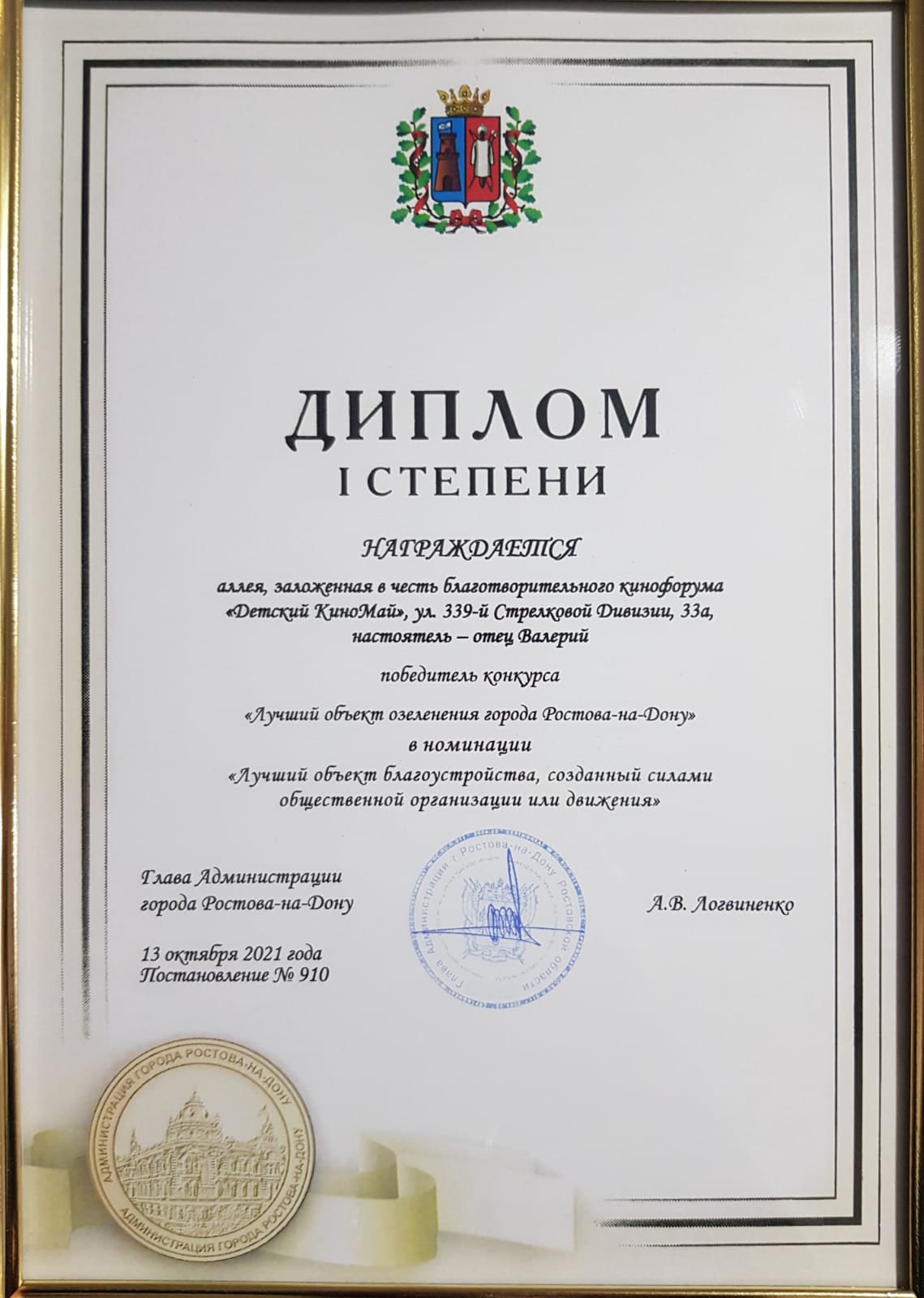 19 ноября 2021 года Геннадий Юрьевич Туркин, Глава администрации Советского района, вручил нашему настоятелю от лица Администрации города диплом победителя конкурса «Лучший объект озеленения города Ростова-на-Дону» в номинации "Лучший объект благоустройства, созданный силами общественной организации или движения".