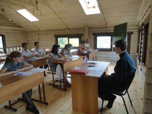 После молебна в новом здании прошли первые учебные занятия Воскресной школы для детей, а также огласительные беседы для готовящихся к Крещению. На фото ниже - старшая группа воскресной школы.