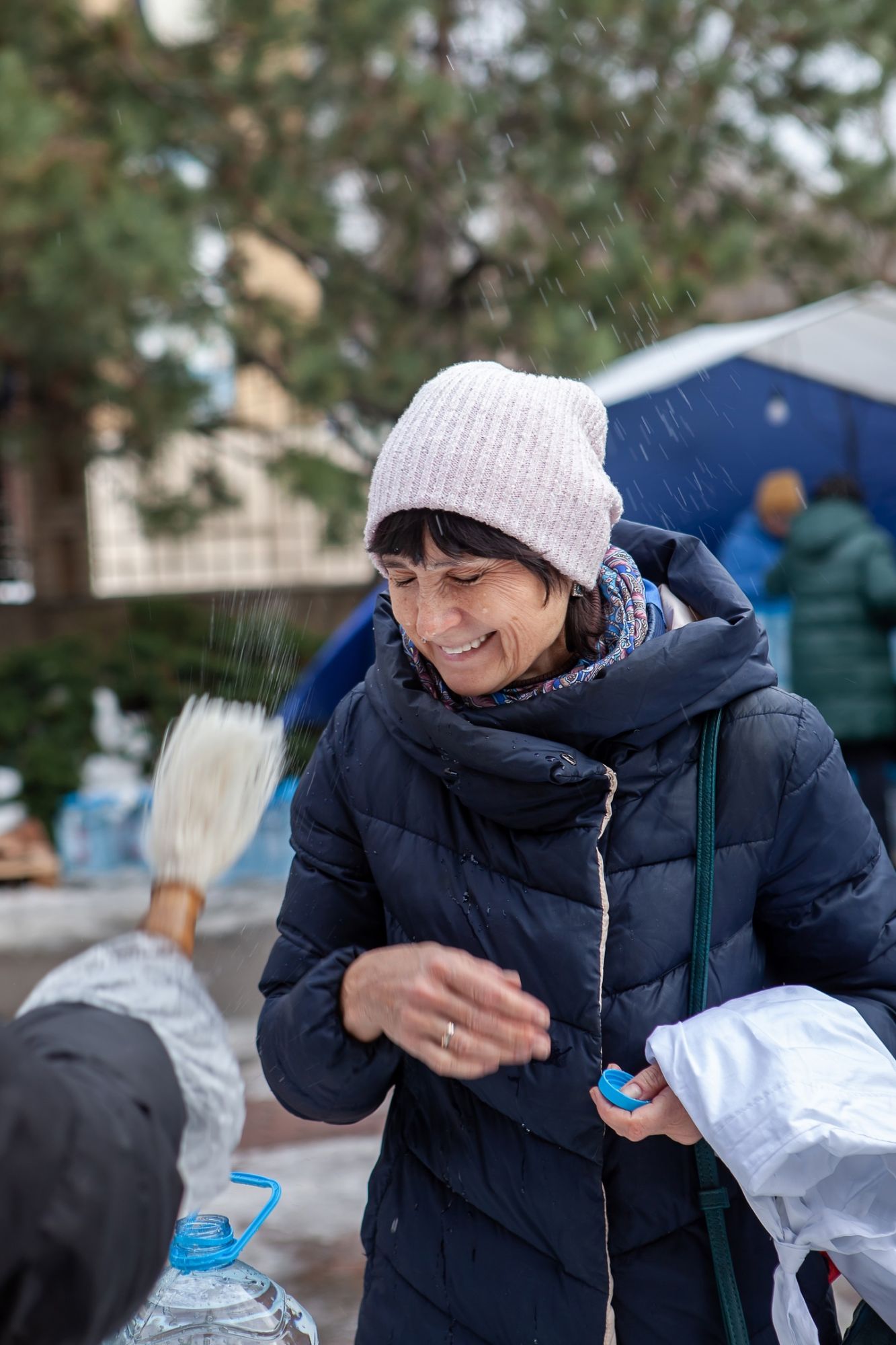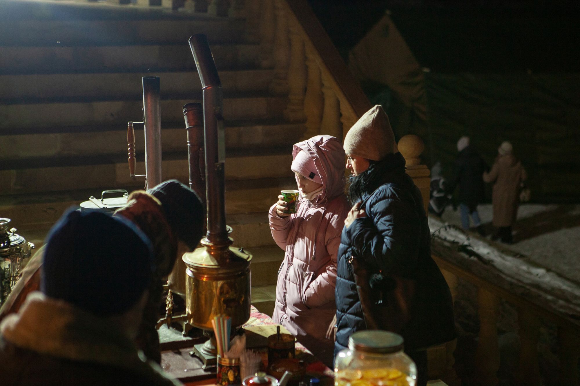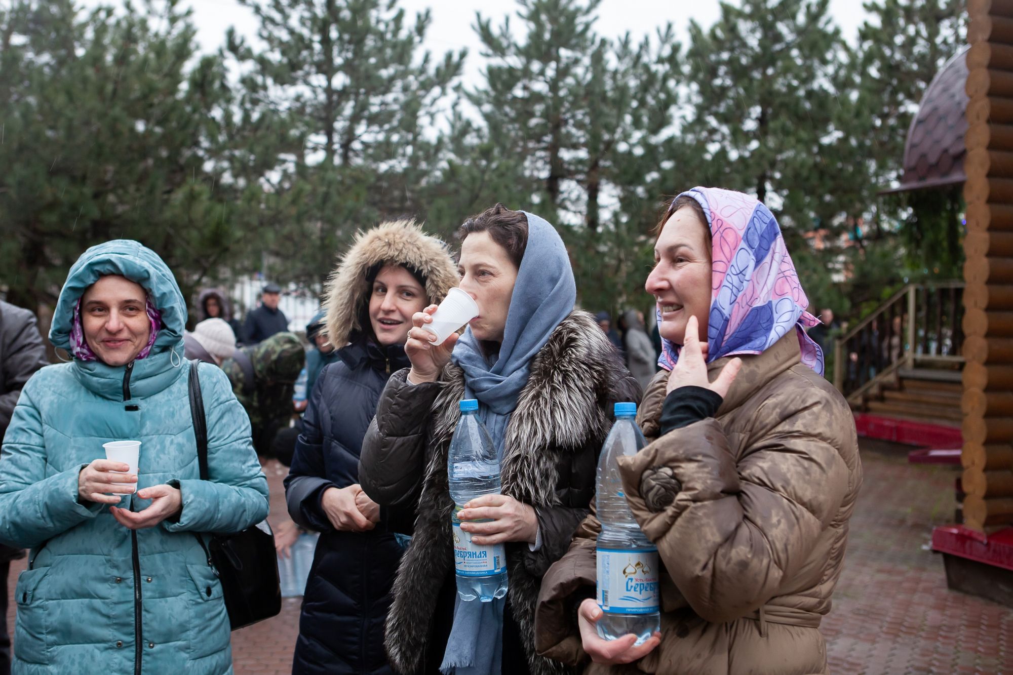 Для готовящихся благоговейно окунуться в купель на территории Георгиевского парка были оборудованы обогреваемые палатки для переодевания и медицинский пункт. А в нашей кофейне всех гостей ждал травяной чай из самовара, сбитни и приходская выпечка.