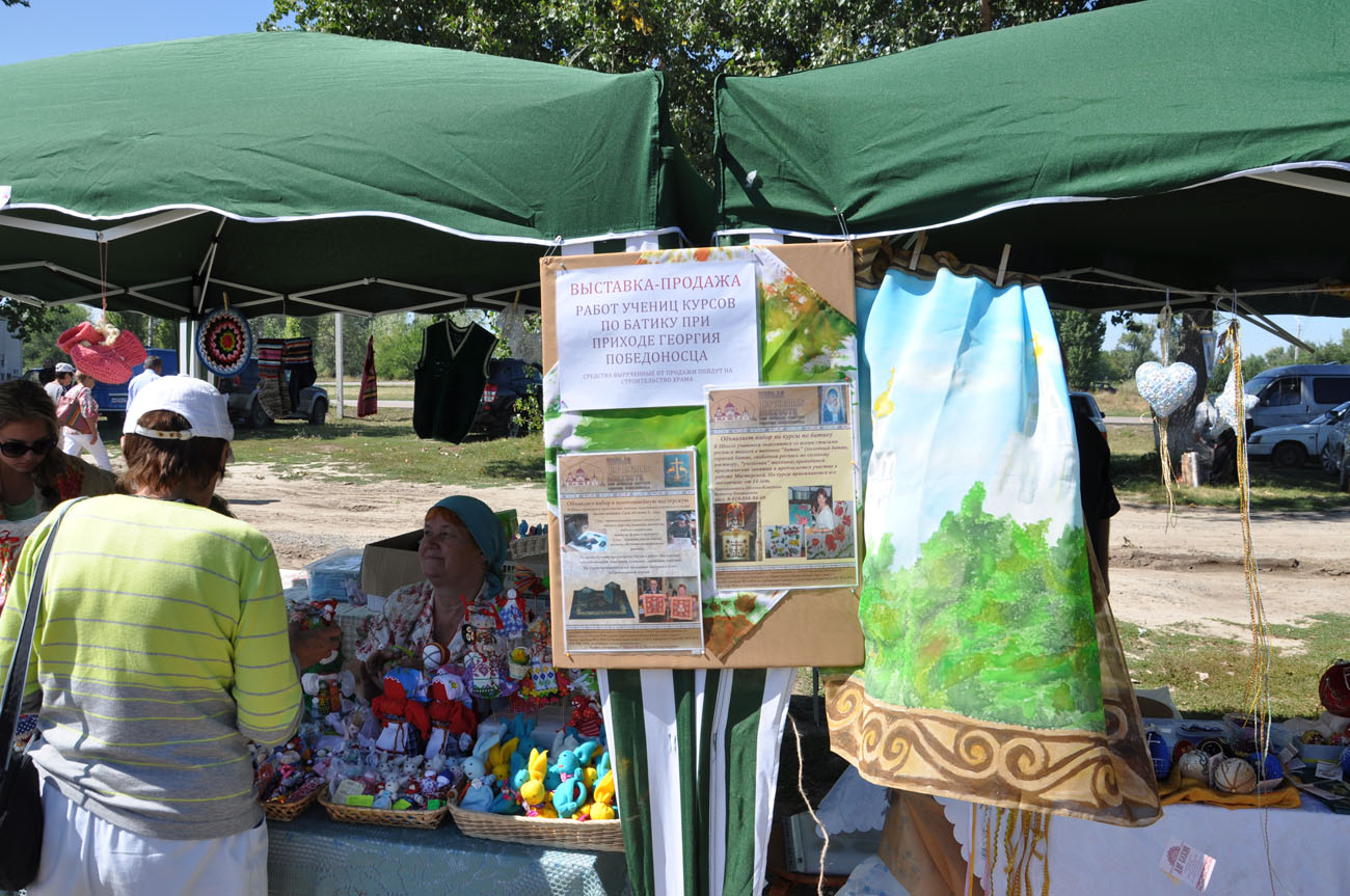 Прихожане прихода святого Георгия Победоносца приняли участие в праздничном богослужении и крестном ходе. На фестивальной ярмарке народных ремесл представители приходского центра развития ремесел и творчества «ДАР БОЖИЙ» представили работы мастеров по батику, традиционной народной куклы, мастеров золотного шитья.