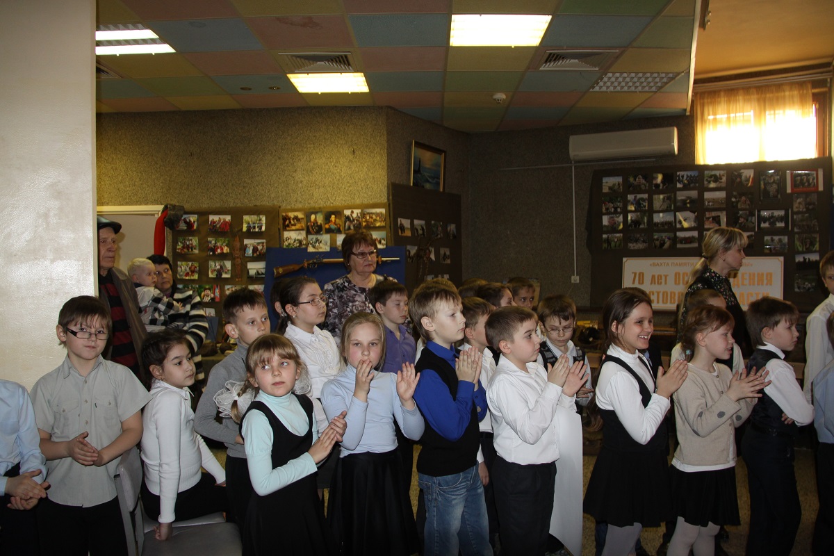 "Вахту памяти" посетили учащиеся школ Октябрьского района города и почётные гости - ветераны войны. Всем участникам выставки были подарены православные календари прихода святого Георгия Победоносца.