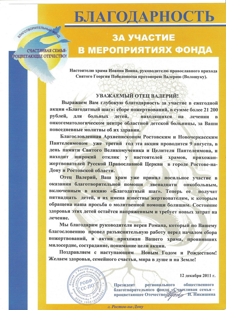 20 декабря 2011 г. Дорогие братья и сестры! Сегодня наш приход получил благодарственное письмо от Регионального общественного фонда "Счастливая семья - процветающее будущее" за участие в его мероприятиях по сбору денежных средств для лечения в Областной детской больнице.