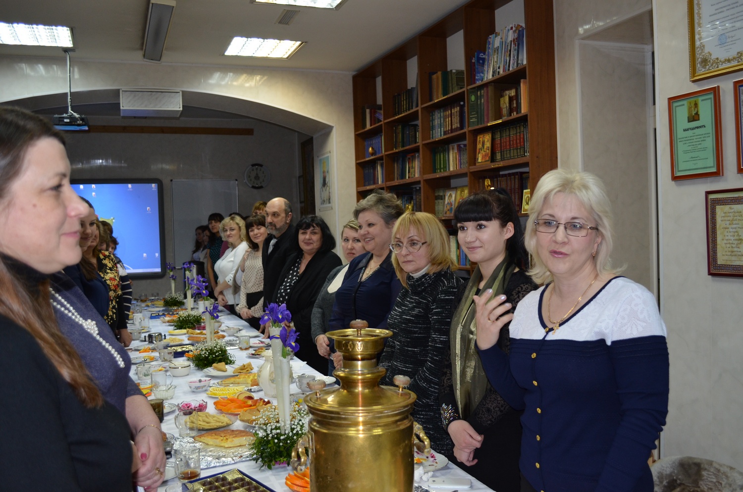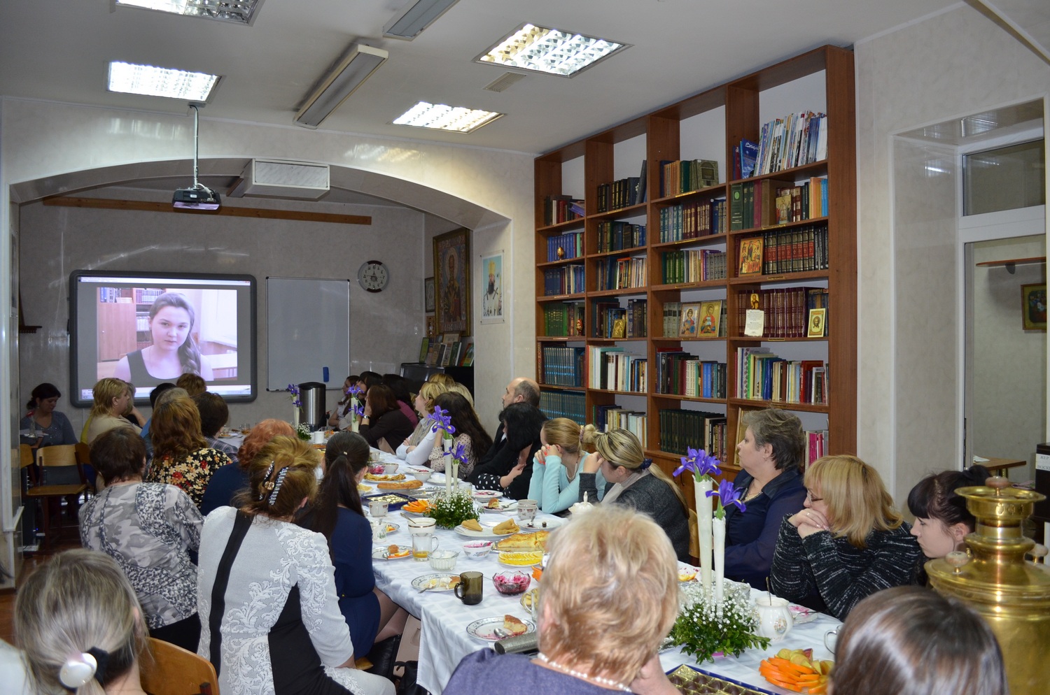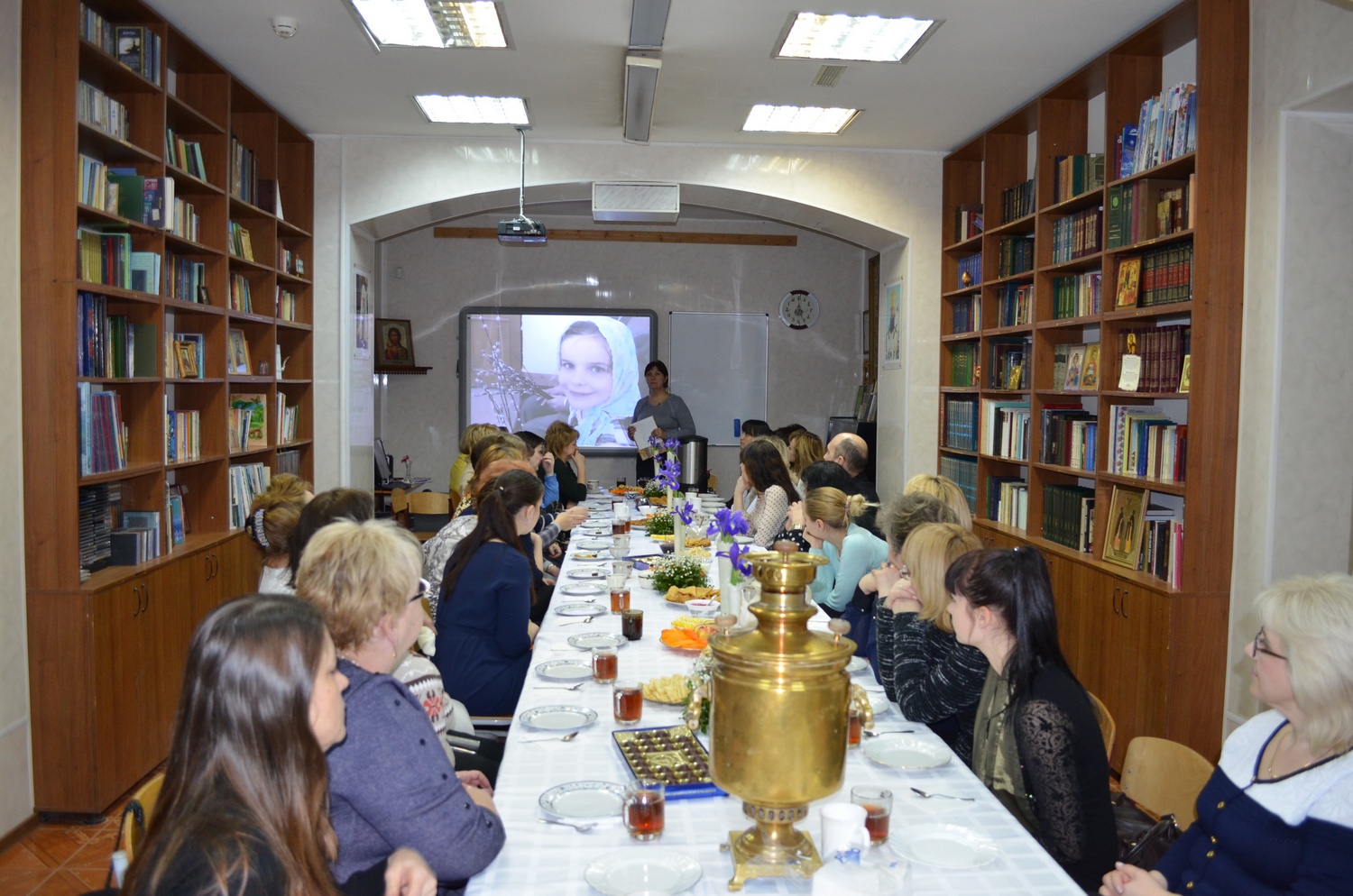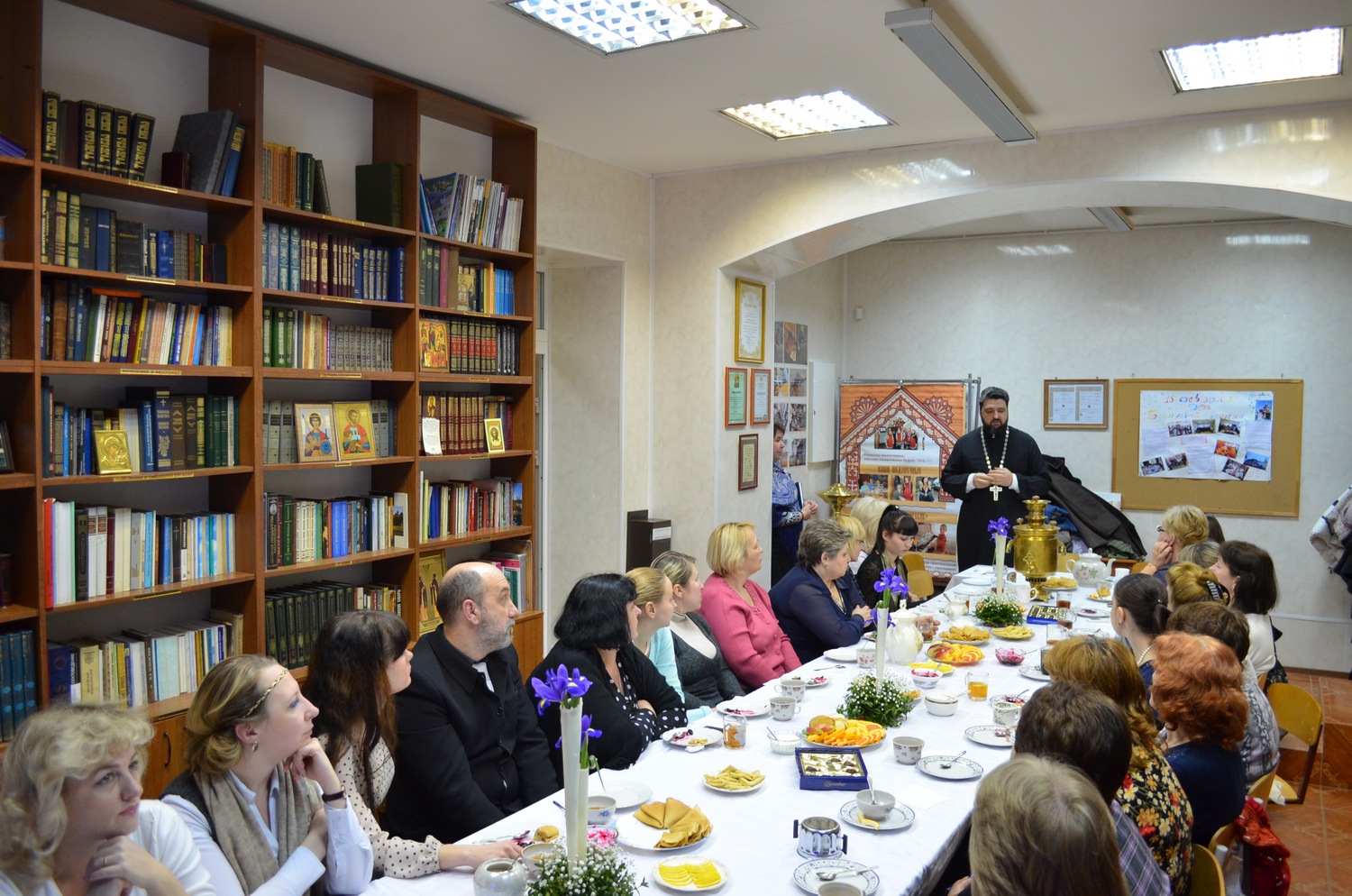 После презентации, за чаепитием с блинами, учителя наших школ смогли задать вопросы Татьяне Михайловне, поделиться своими впечатлениями. В дискуссии принял участие и настоятель прихода Валерий Волощук. Главный специалист Отдела Образования Ластовка Людмила Николаевна выразила общее мнение всех присутствующих о том, что такие встречи очень полезны для учителей ОПК, тем более, что они проходят при поддержке прихода.