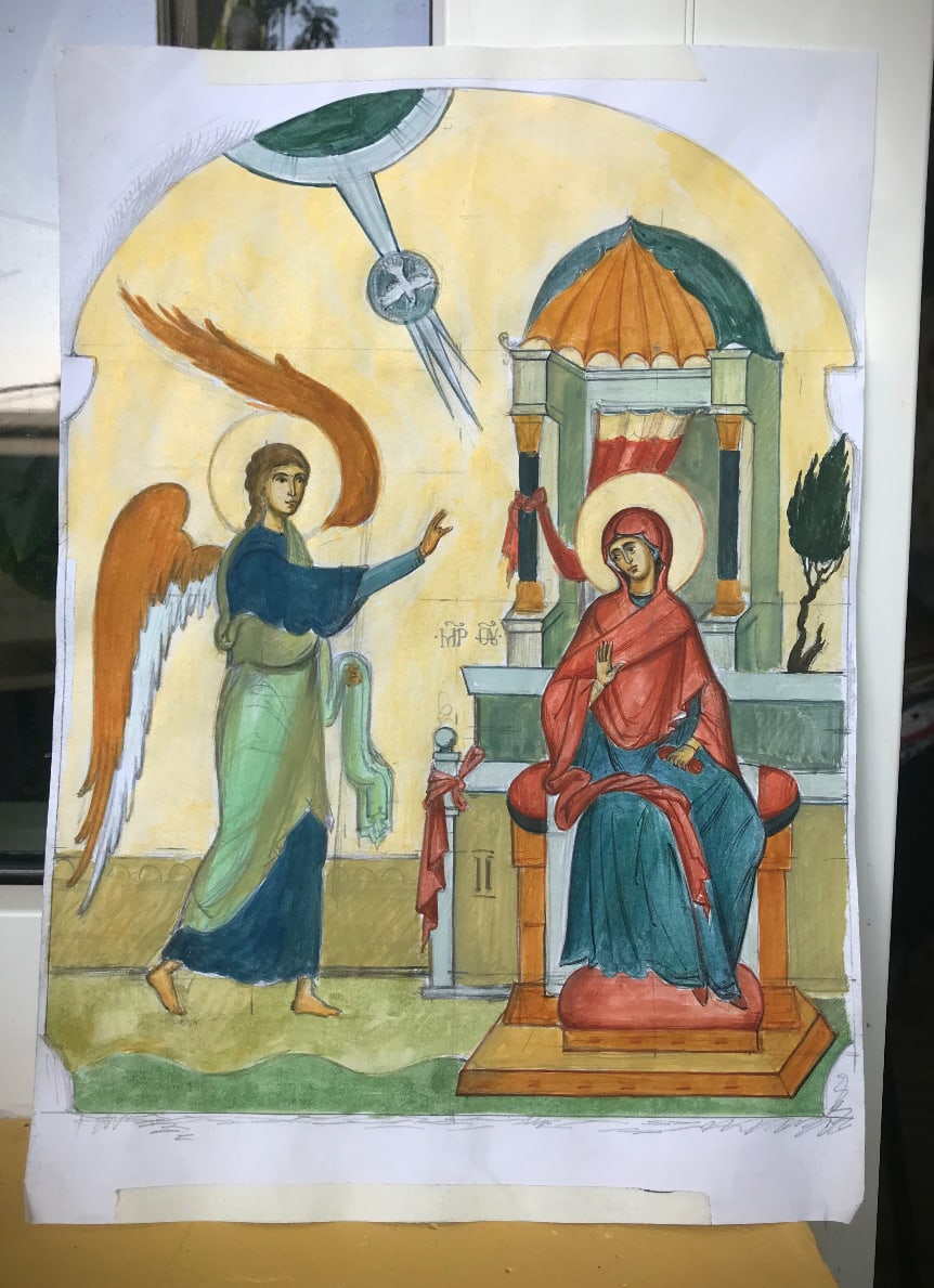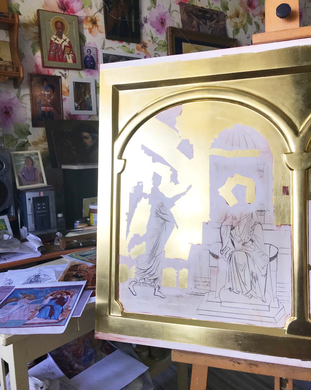 О тонкостях иконописи и будущей иконе «Благовещение Пресвятой Богородицы» в иконостас криптового храма сорока мучеников Севастийских рассказывает Дмитрий Шестопалов: «Сперва делается эскиз-проект будущей иконы. Это принципиально новое решение, но основанное на древних образцах, и издалека их напоминает. Потом рисунок переносится на левкас и пишется контур тонкой кистью и позолота вокруг образа. Сложность состоит в том, что весь рисунок остается закрыт золотом и, чтобы его не утратить, контур каждого образа обводится острой иглой. Остаётся еле заметное углубление в грунте, и после золочения золото счищается до этой линии! А потом всё сначала».