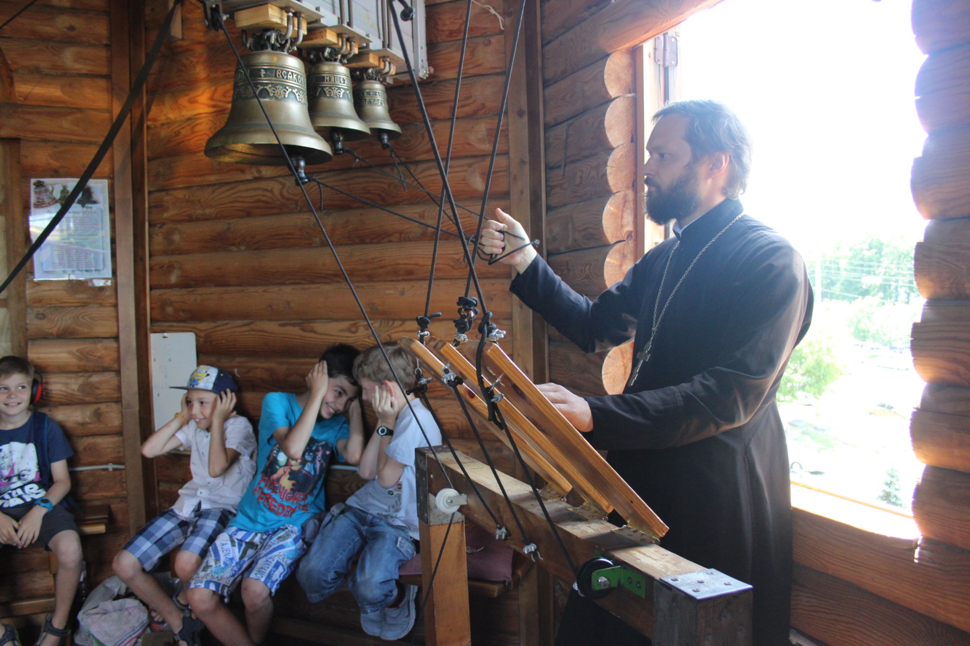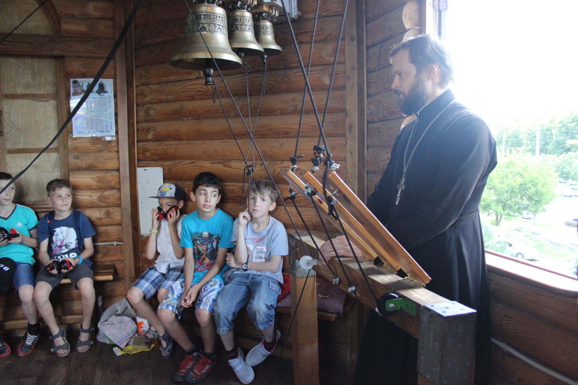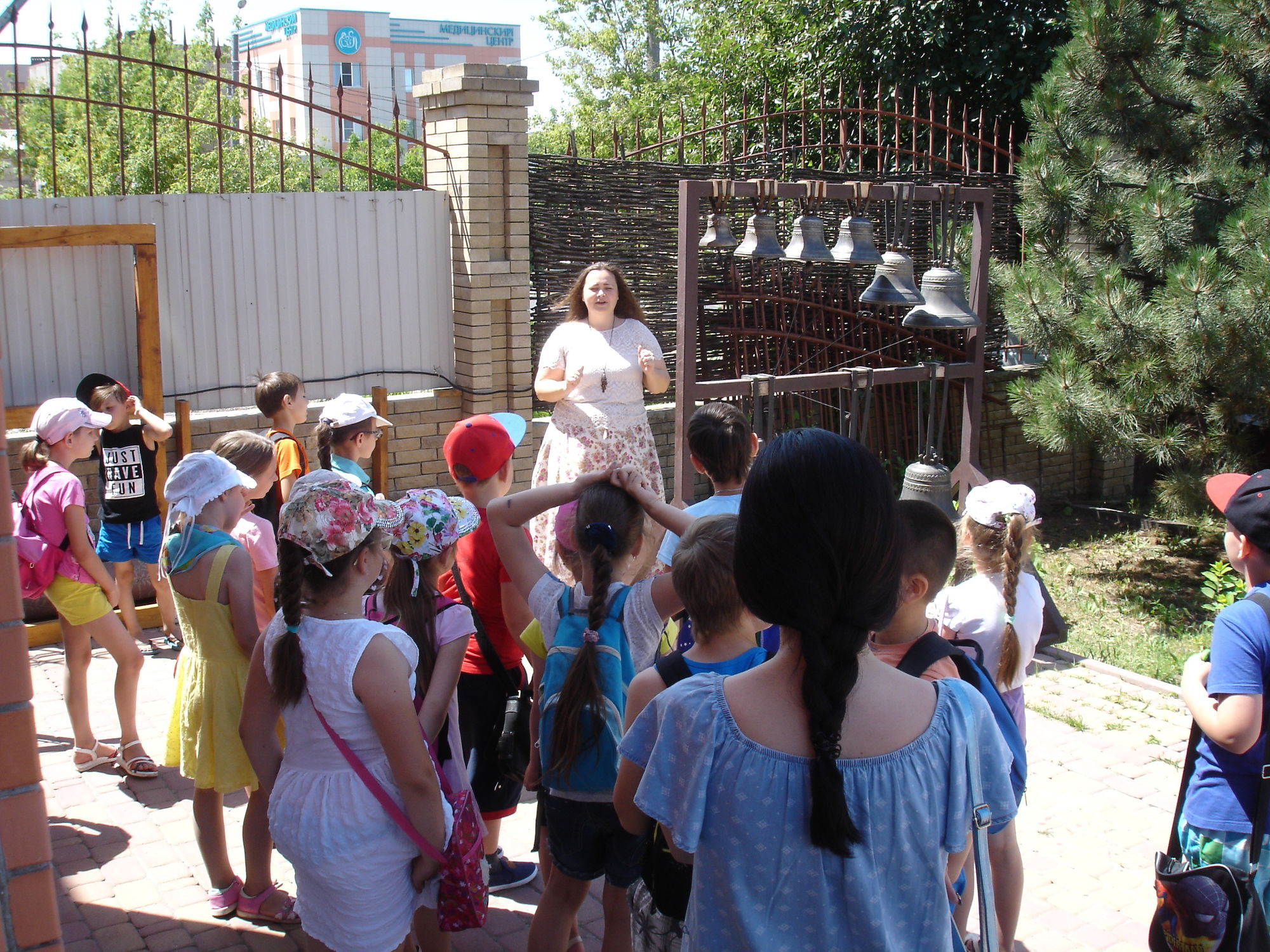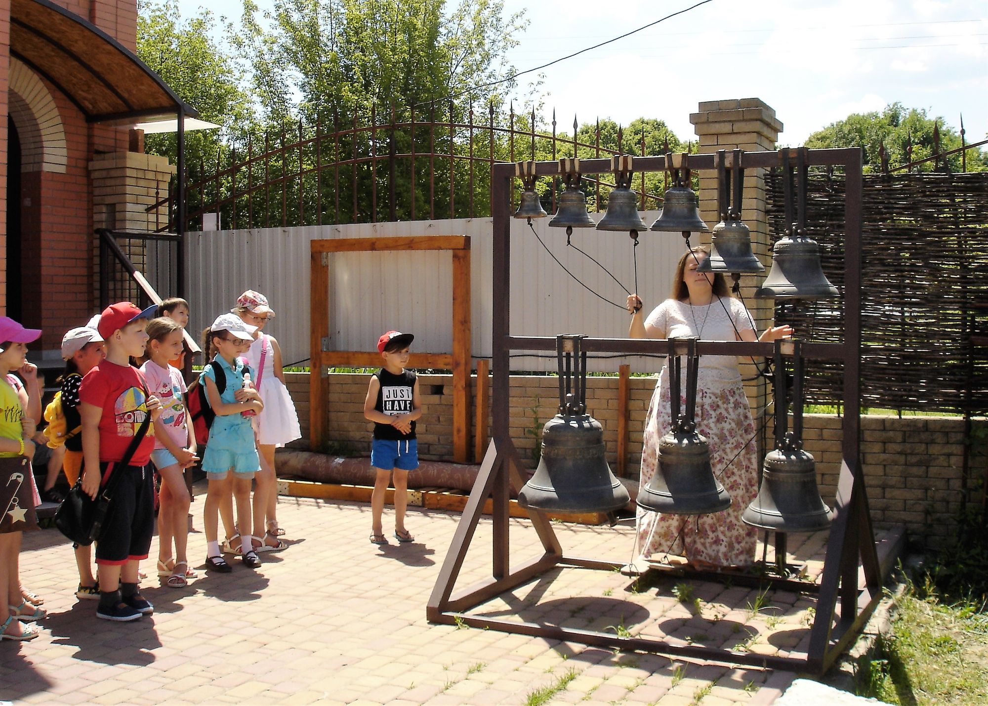 Во второй части экскурсии, золотошвейка Ольга Шевчук познакомила ребят с деятельностью приходских творческий мастерских: золотошвейной, иконописной, традиционной тряпичной куклы, росписи по ткани в технике батика и провела мастер-класс по колокольному звону.