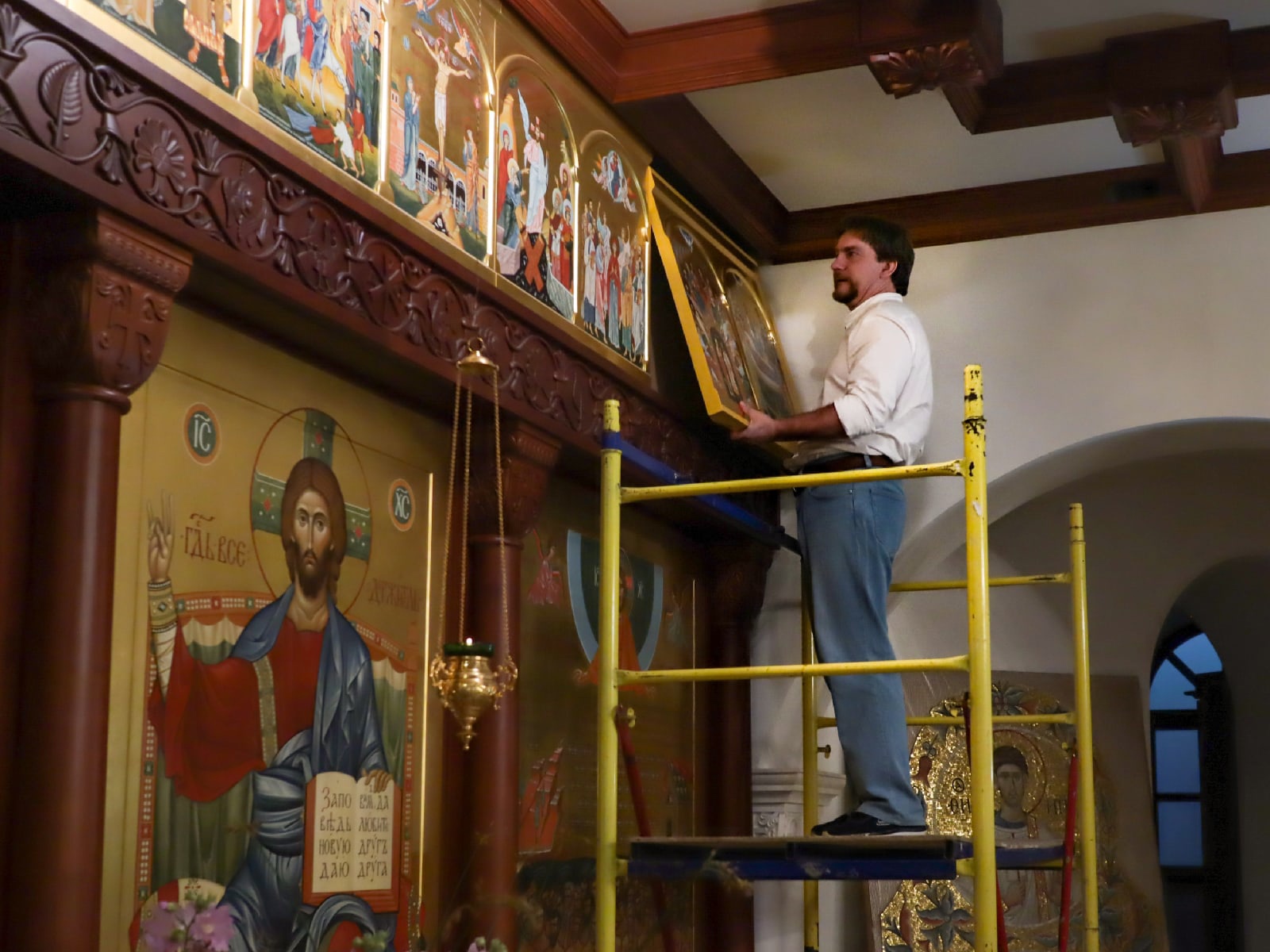 Работы по проекту начались около 10 лет назад, как только была залита бетонная плита под храм. Пока он строился, в нашей иконописной мастерской были написаны основные иконы. Главную храмовую икону Сорока мучеников Севастийских и Царские Врата писал Владимир Мирошниченко. Проект иконостаса и резьбы разрабатывал Дмитрий Шестопалов, а также им были написаны иконы "Спас Вседержитель на троне", образ Толгской Пресвятой Богородицы и иконы праздничного ряда.