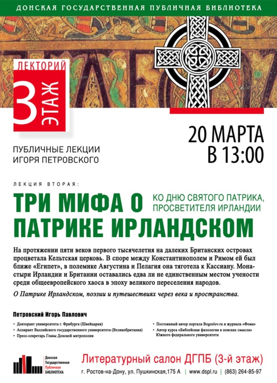 Лекция "Три мифа о Патрике Ирландском" ко дню святого Патрика, просветителя Ирландии (о Патрике Ирландском, поэзии, путешествиях через века и пространства...), состоялась в рамках нового проекта "Публичные лекции Игоря Петровского". Это уже вторая лекция, в которой участвует наш клуб.