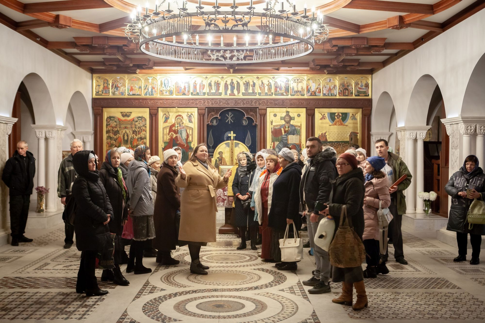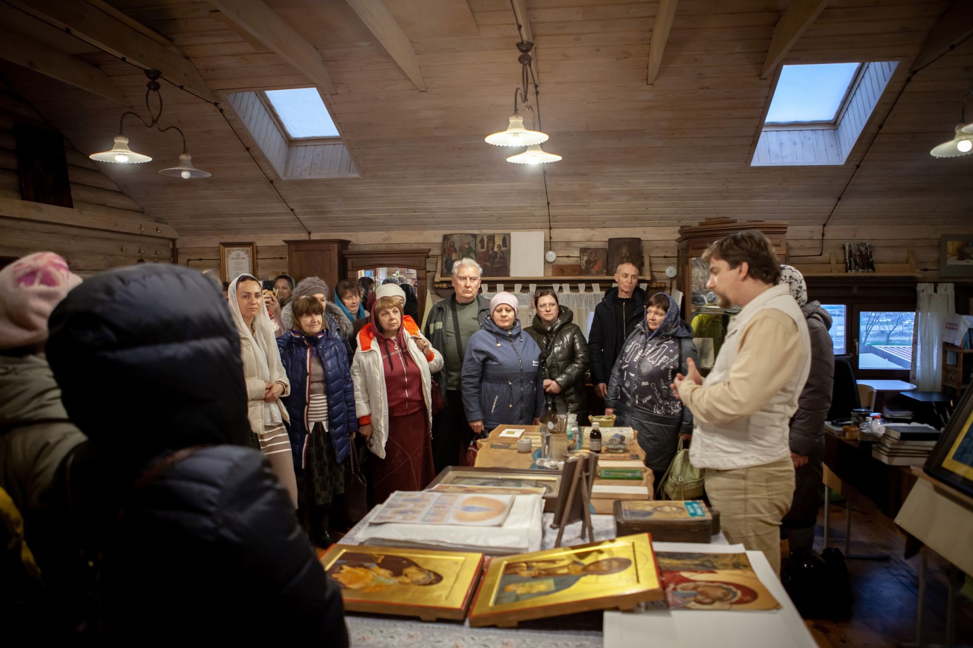 Паломники из Шахтинской епархии посетили наш приход. О жизни и трудах прихода гостям рассказывали руководитель золотошвейной мастерской Ольга Паланджян и иконописец Дмитрий Шестопалов.