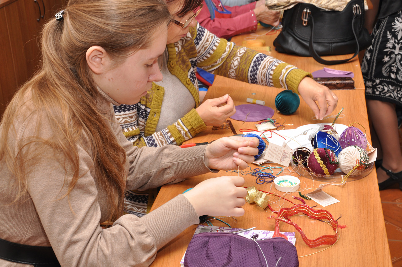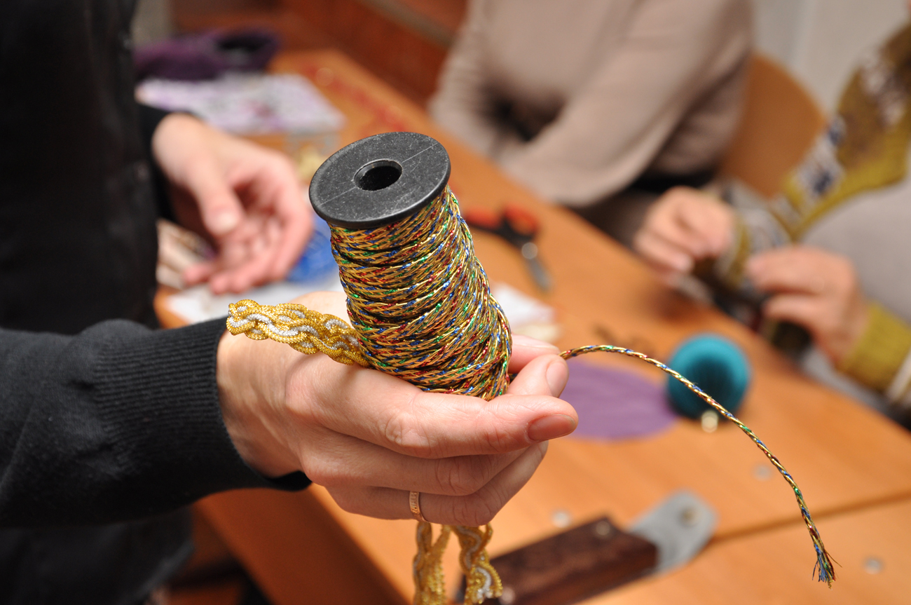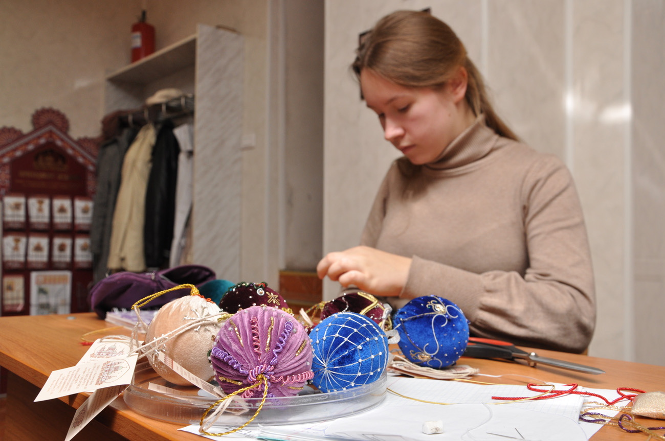 Темой мастер-класса стало создание и украшение рождественских елочных шаров. В рамках занятия были представлены различные техники шитья и вышивки по бархату с ипользованием различного золотошвейного материала: канители, трунцала, натуральных камней, золотой декоративной тесьмы, шелковых лент, а также золотого шнура, изготовленного мастерицами золотошвейной мастерской вручную.