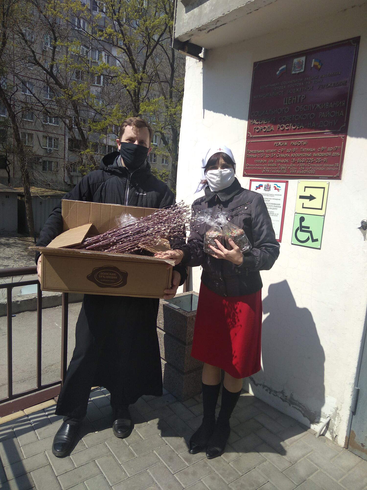 21 апреля 2020 года клирик храма Иоанна Воина иерей Роман Зимин и старшая сестра Ольга Терехова посетили Центр социальной защиты населения Советского района. В это трудное время они работают в усиленном режиме: доставляют горячие обеды; социальные работники разносят лекарства.