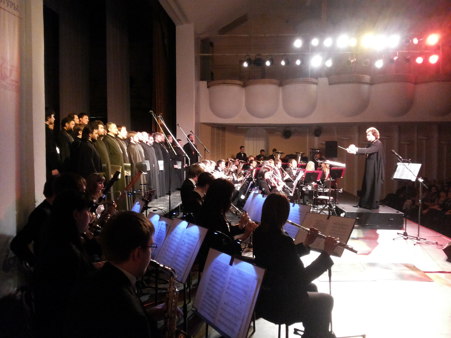 На сцене большого зала филармонии выступили государственный концертный оркестр духовых инструментов им. В. Еждика (художественный руководитель – Артур Богдасаров) и сводный хор духовенства Ростовской-на-Дону епархии (руководитель – протодиакон Владимир Зубрицкий). В их исполнении прозвучала духовная музыка и патриотические произведения.