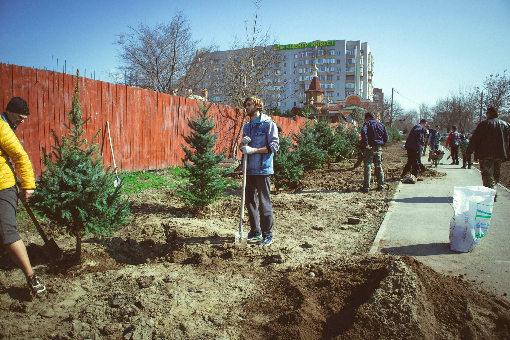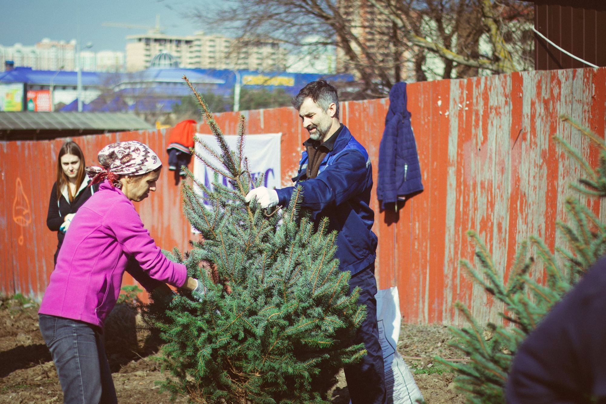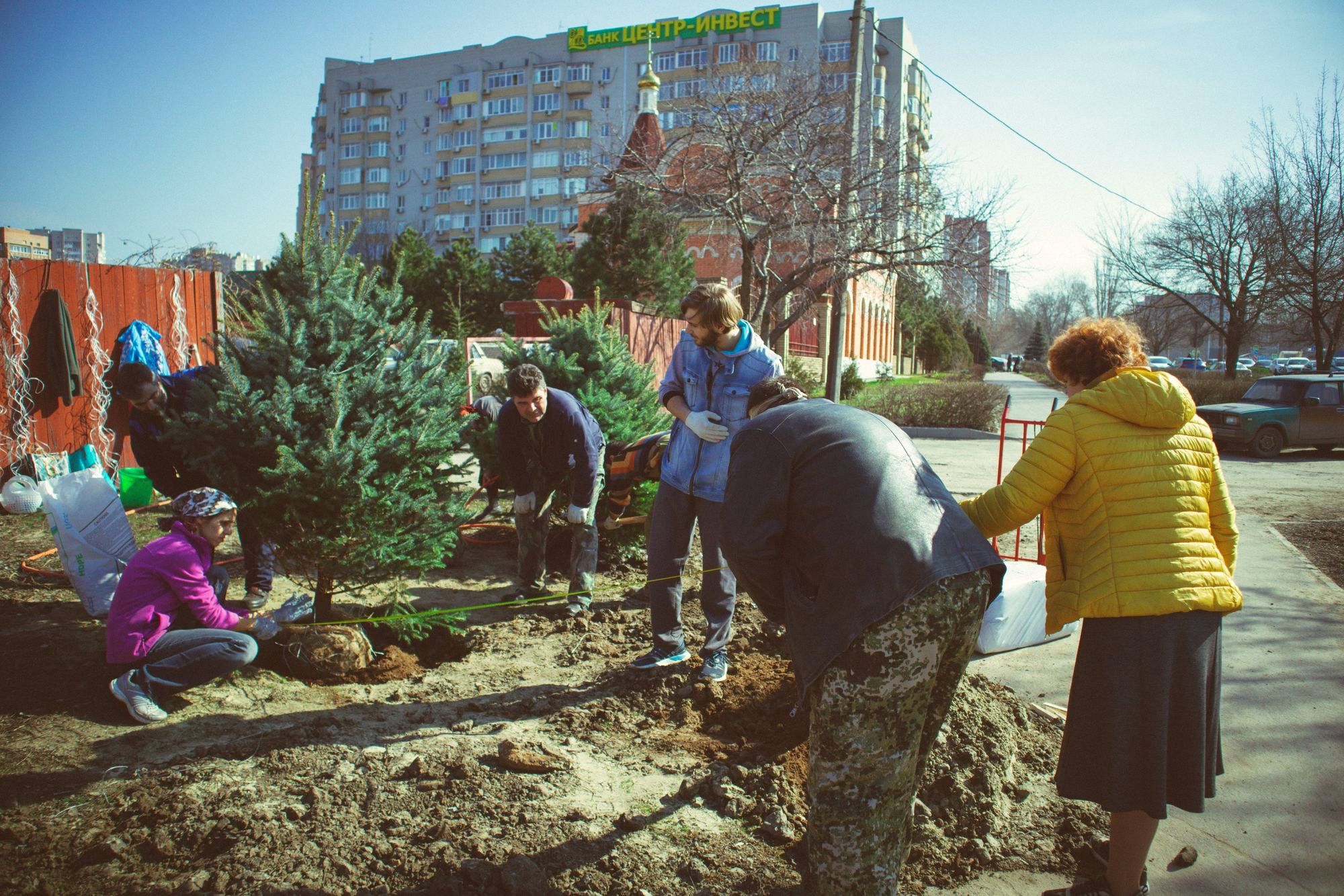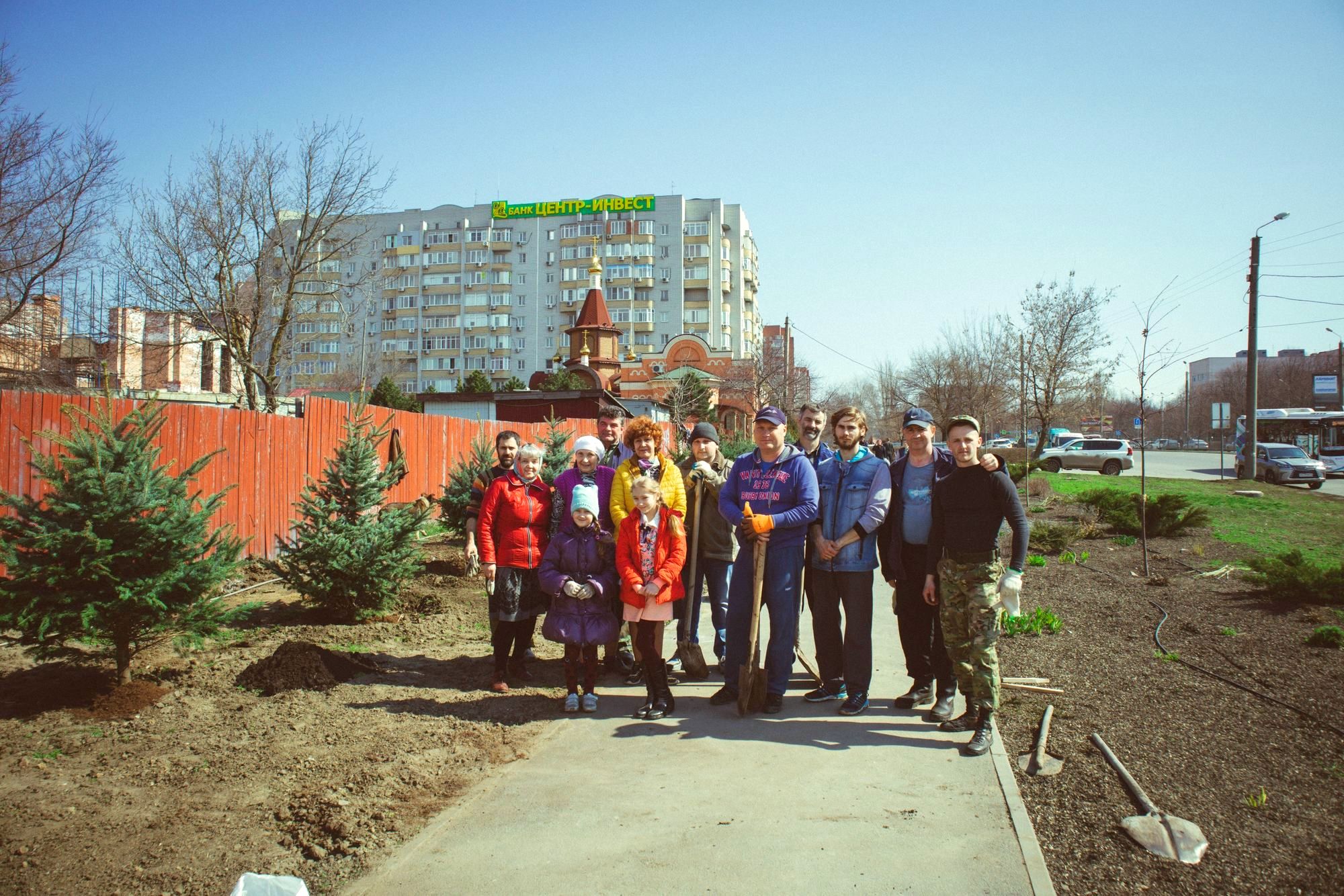 Флористы, прихожане, учащиеся воскресной школы, участники молодёжного движения Парикия и сотрудники ростовского отделения страховой группы "Макс" высадили на территории прихода более 20 пушистых ёлок, которые впоследствии станут живой изгородью.