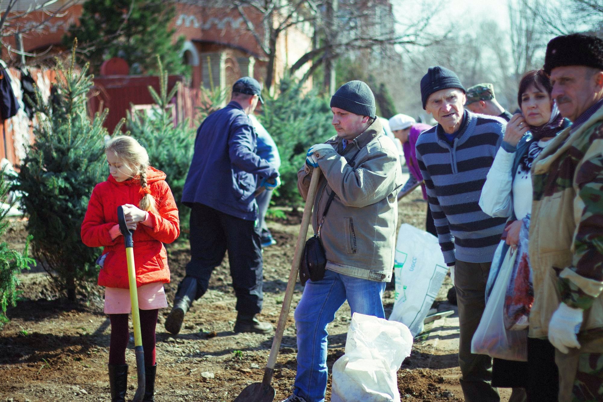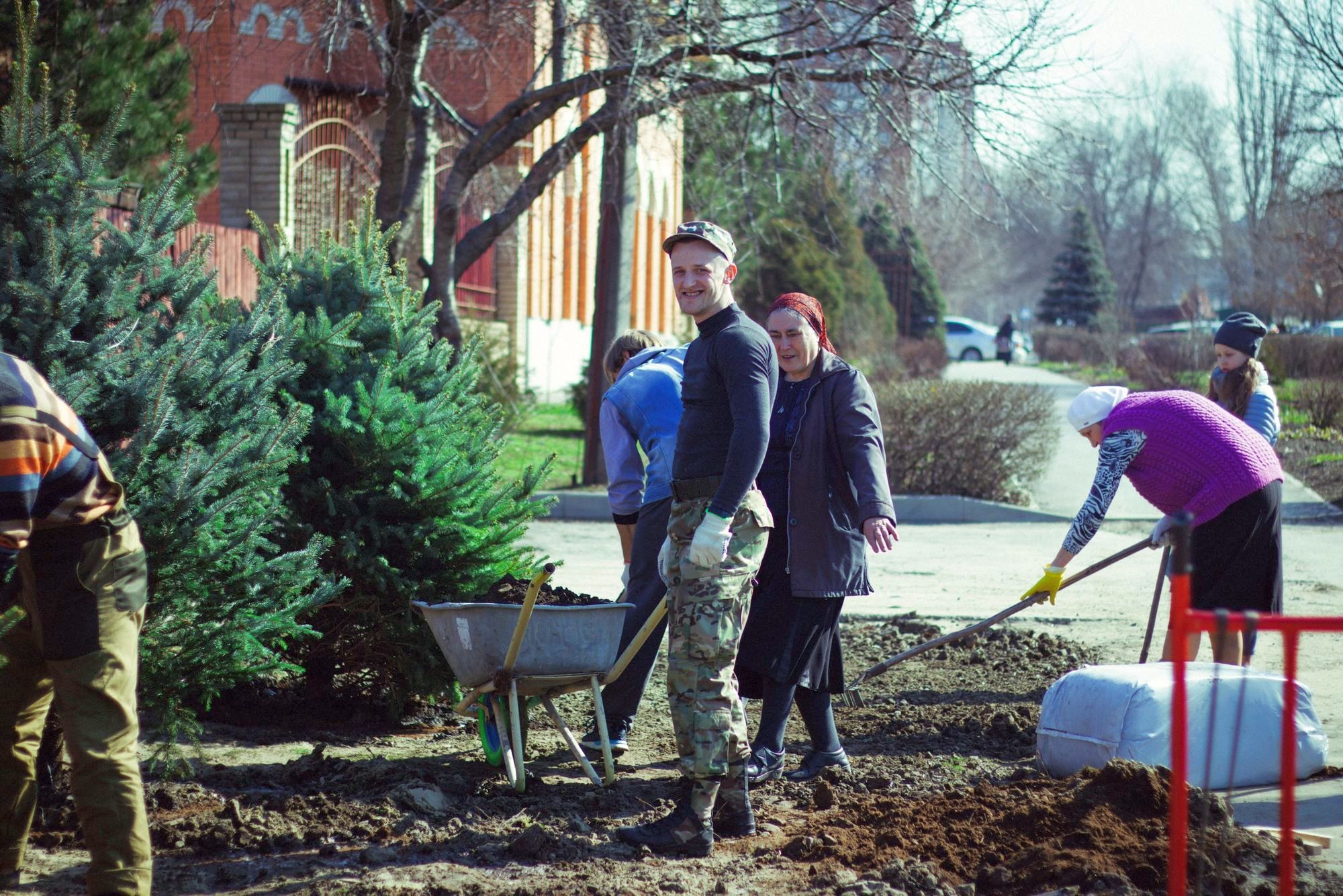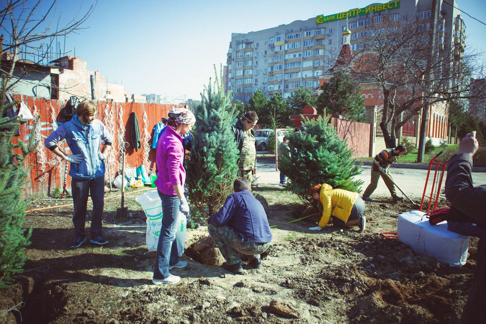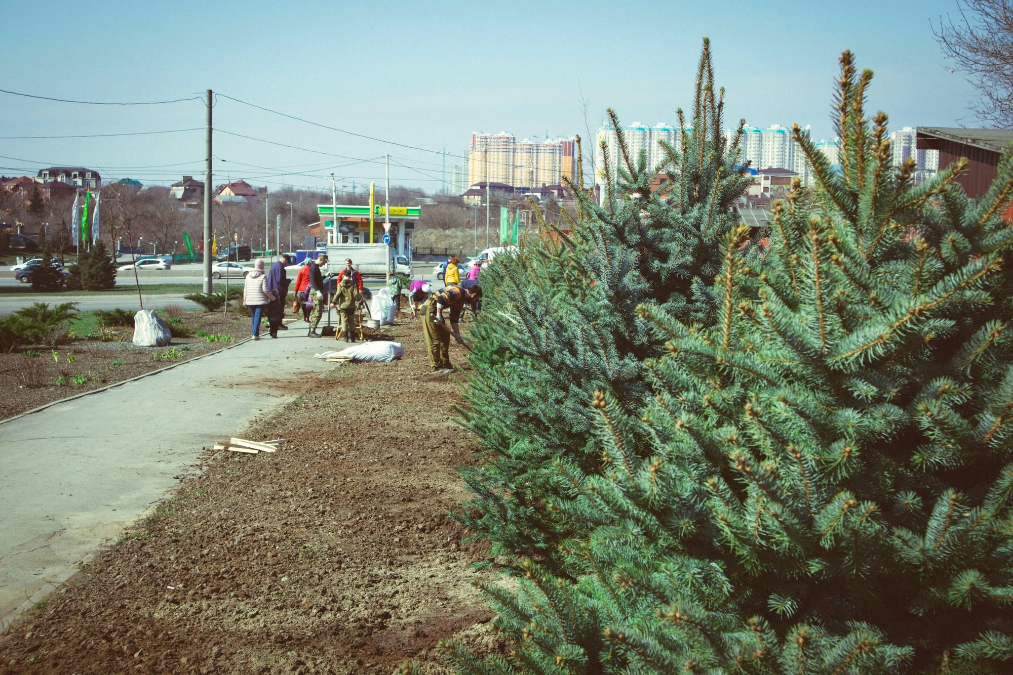 Флористы, прихожане, учащиеся воскресной школы, участники молодёжного движения Парикия и сотрудники ростовского отделения страховой группы "Макс" высадили на территории прихода более 20 пушистых ёлок, которые впоследствии станут живой изгородью.