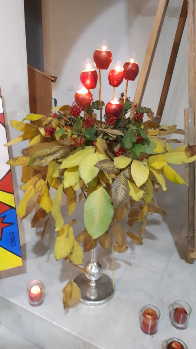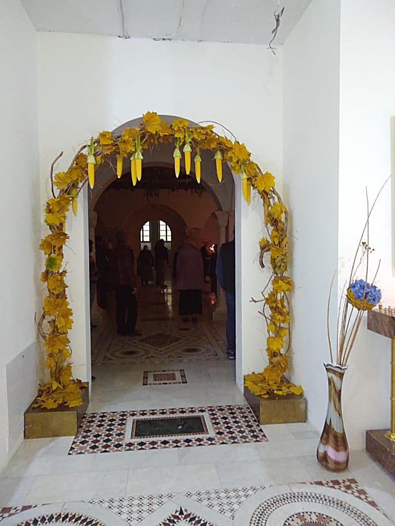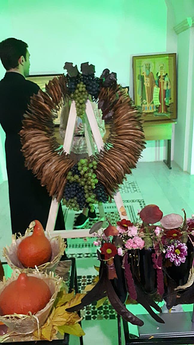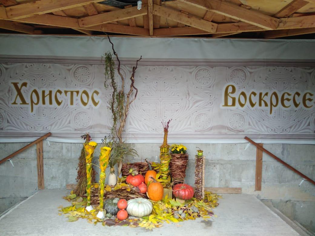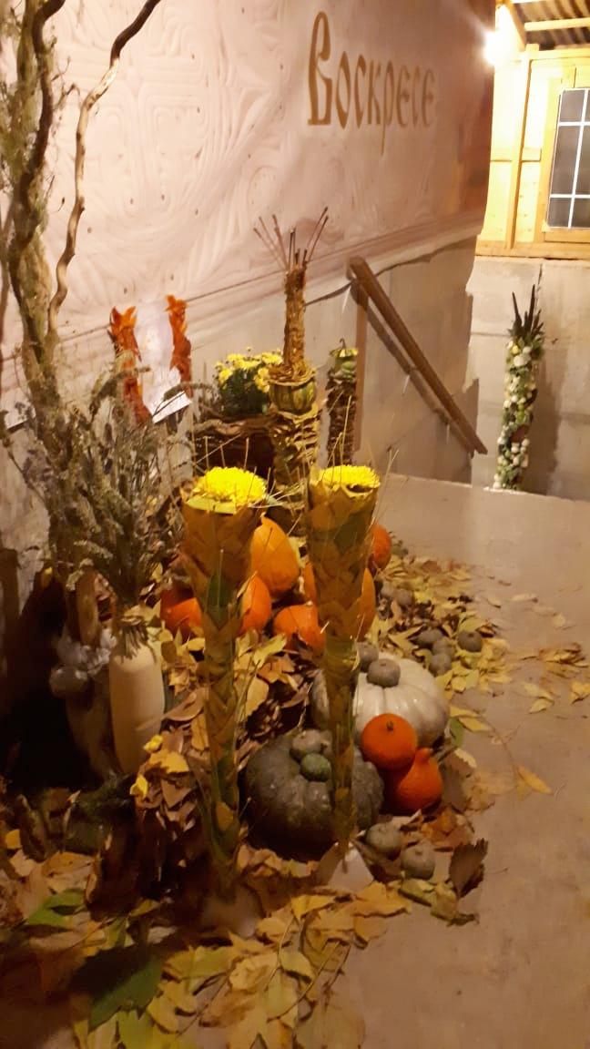 Дизайнеры флористической мастерской прихода святого Георгия Победоносца подготовили уникальную композицию из даров осени, украсив вход в храм. Флорист международного класса, руководитель мастерской Валерия Букина прочла лекцию о цветочном искусстве.