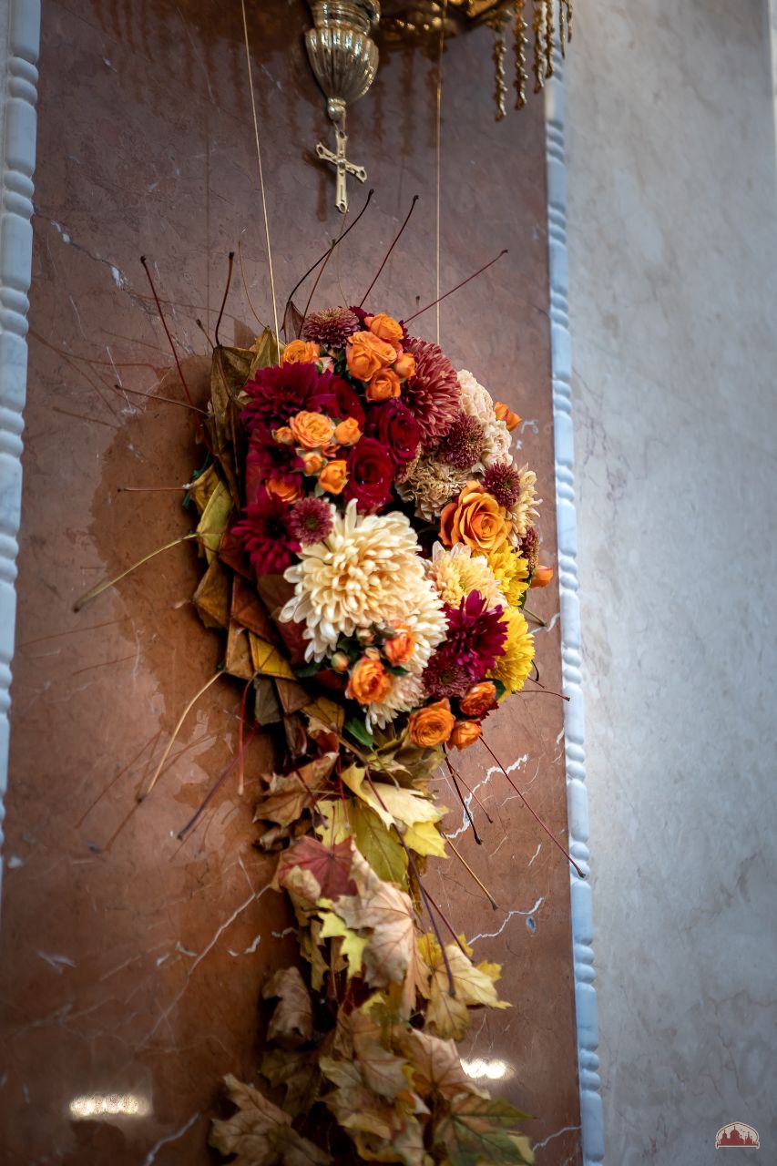 Торжественное осеннее убранство к великому освящению подготовили наши прихожане во главе с Валерией Букиной - мастером-флористом международного класса. Кленовые листочки собирали всем приходом.