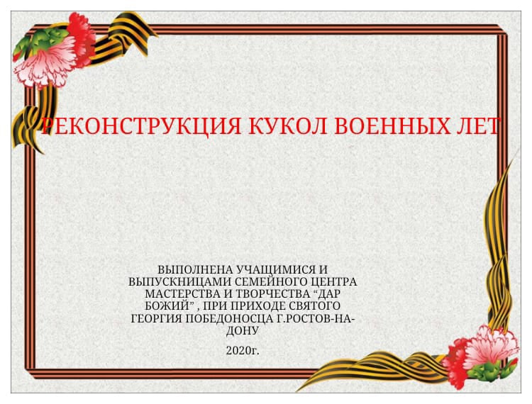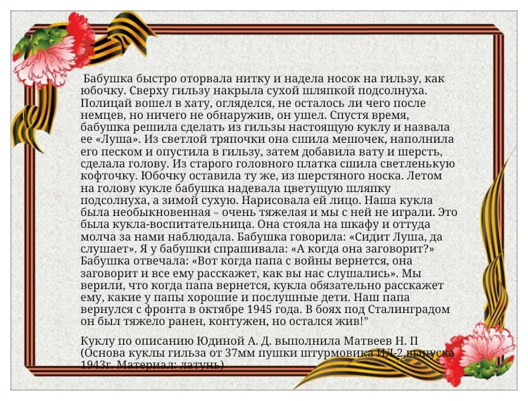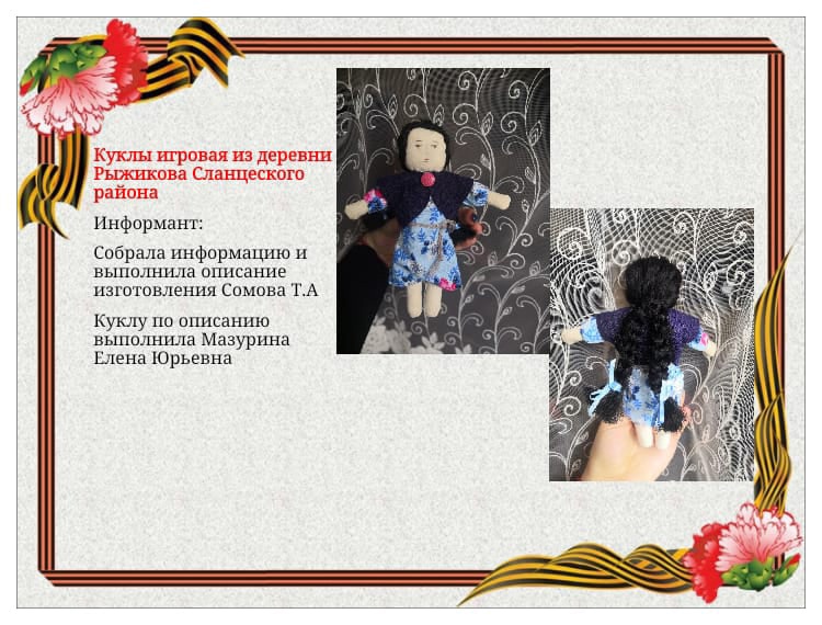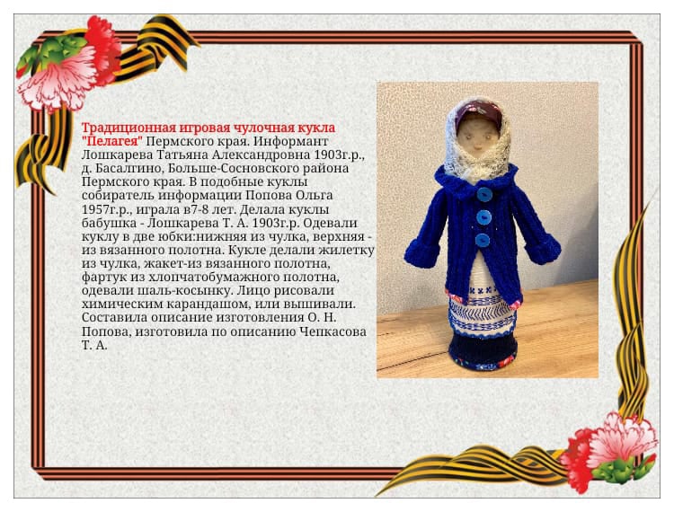 Удивительный проект есть у наших мастериц традиционной текстильной куклы, руководит которыми Наталья Павловна Матвеева. Проект «Кукла военных лет» рассказывает о том, как кукла, изготовленная из подручных и порой недетских материалов, помогала пережить страшные годы войны.