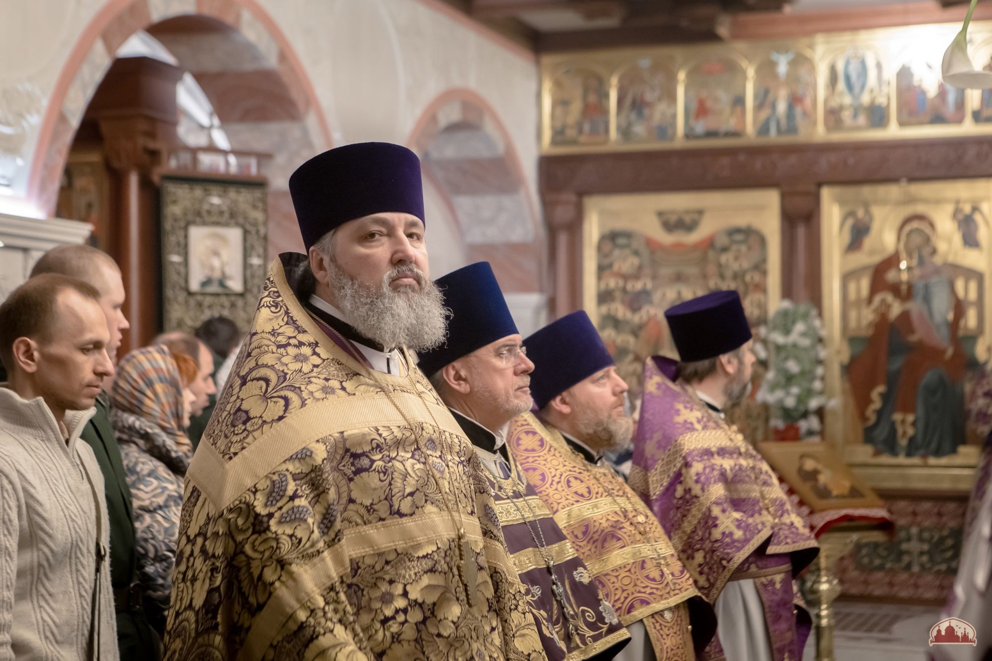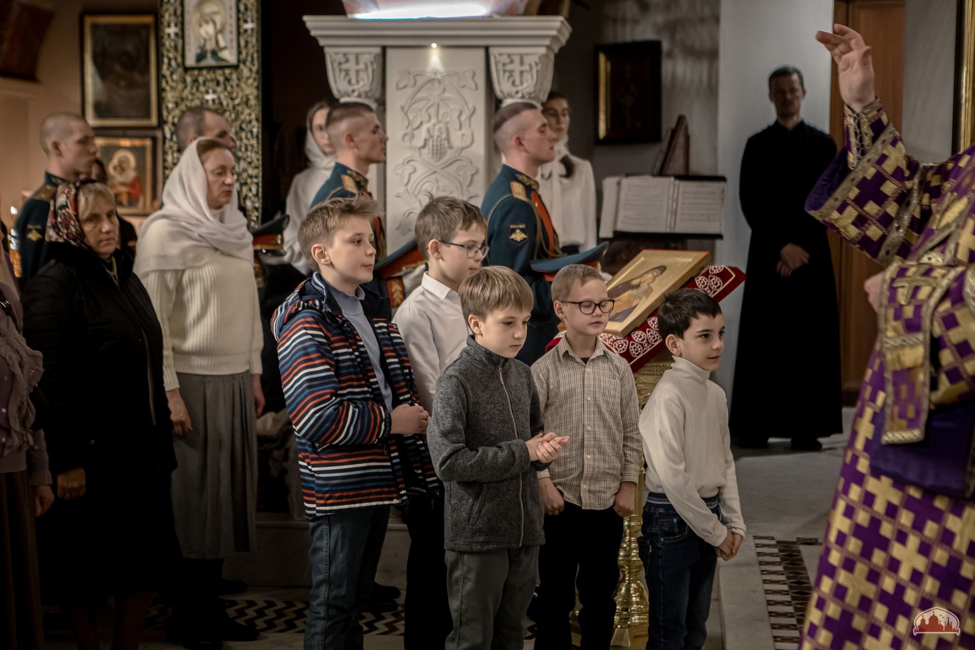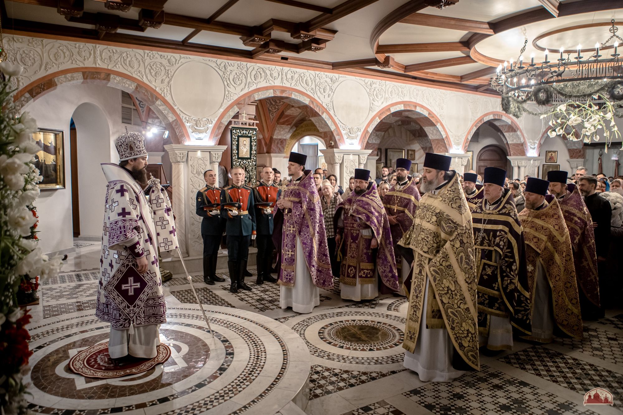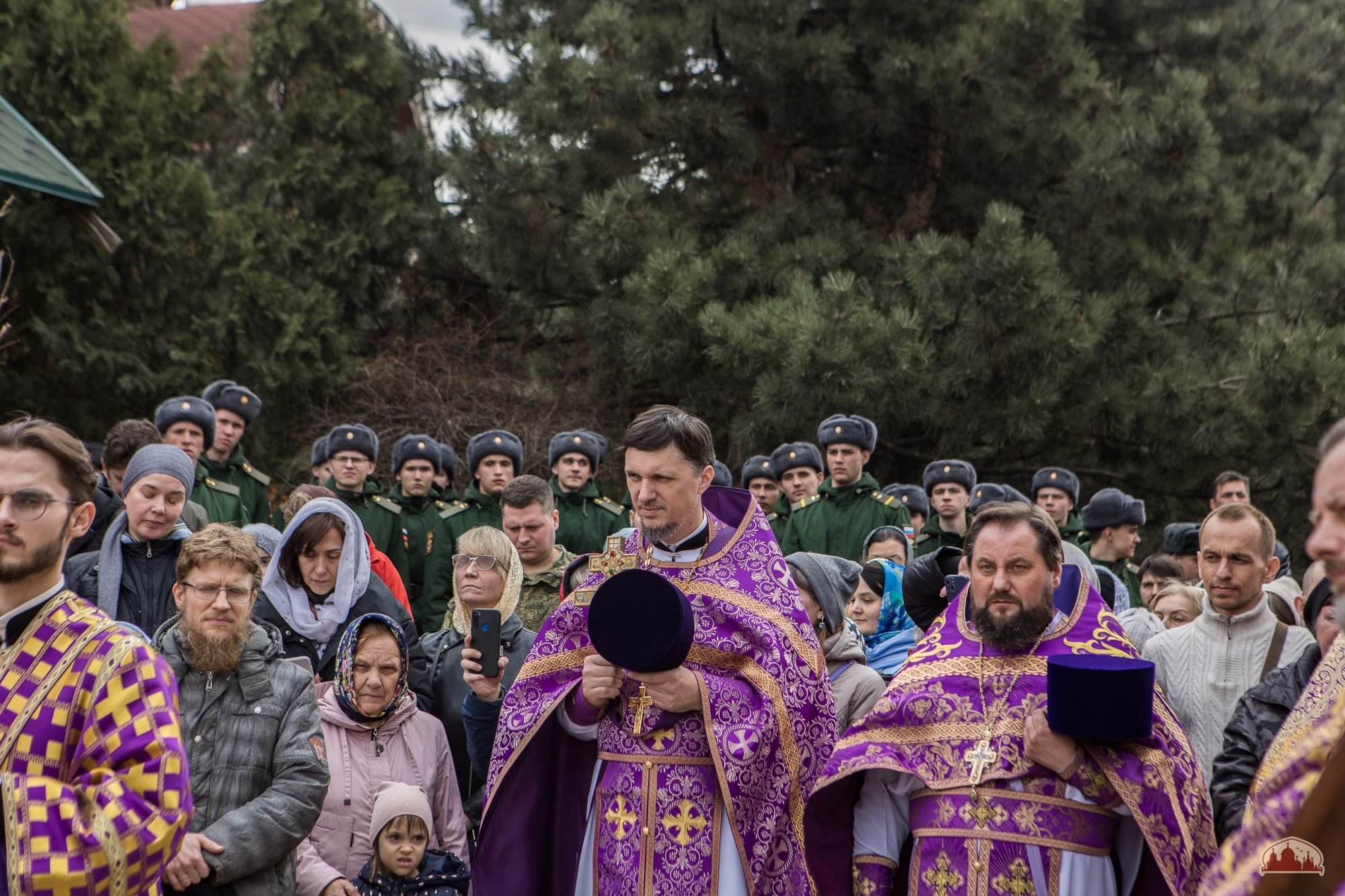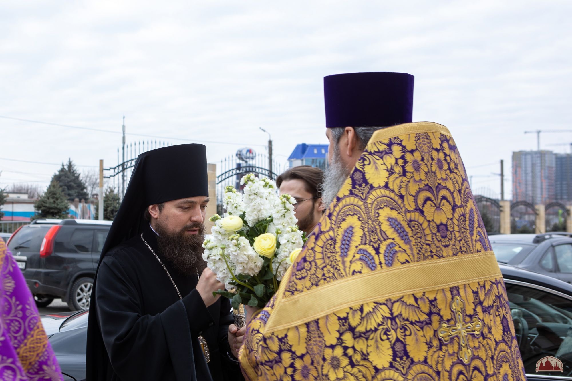 Его Преосвященству сослужили благочинный Западного округа иерей Александр Литвиненко, руководитель Епархиального отдела по взаимодействию с Вооруженными силами и правоохранительными учреждениями, настоятель храма протоиерей Валерий Волощук, руководитель Епархиального отдела по работе с казачеством протоиерей Георгий Сморкалов и клирики благочиния.