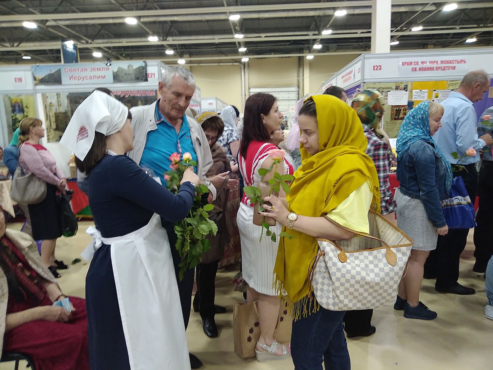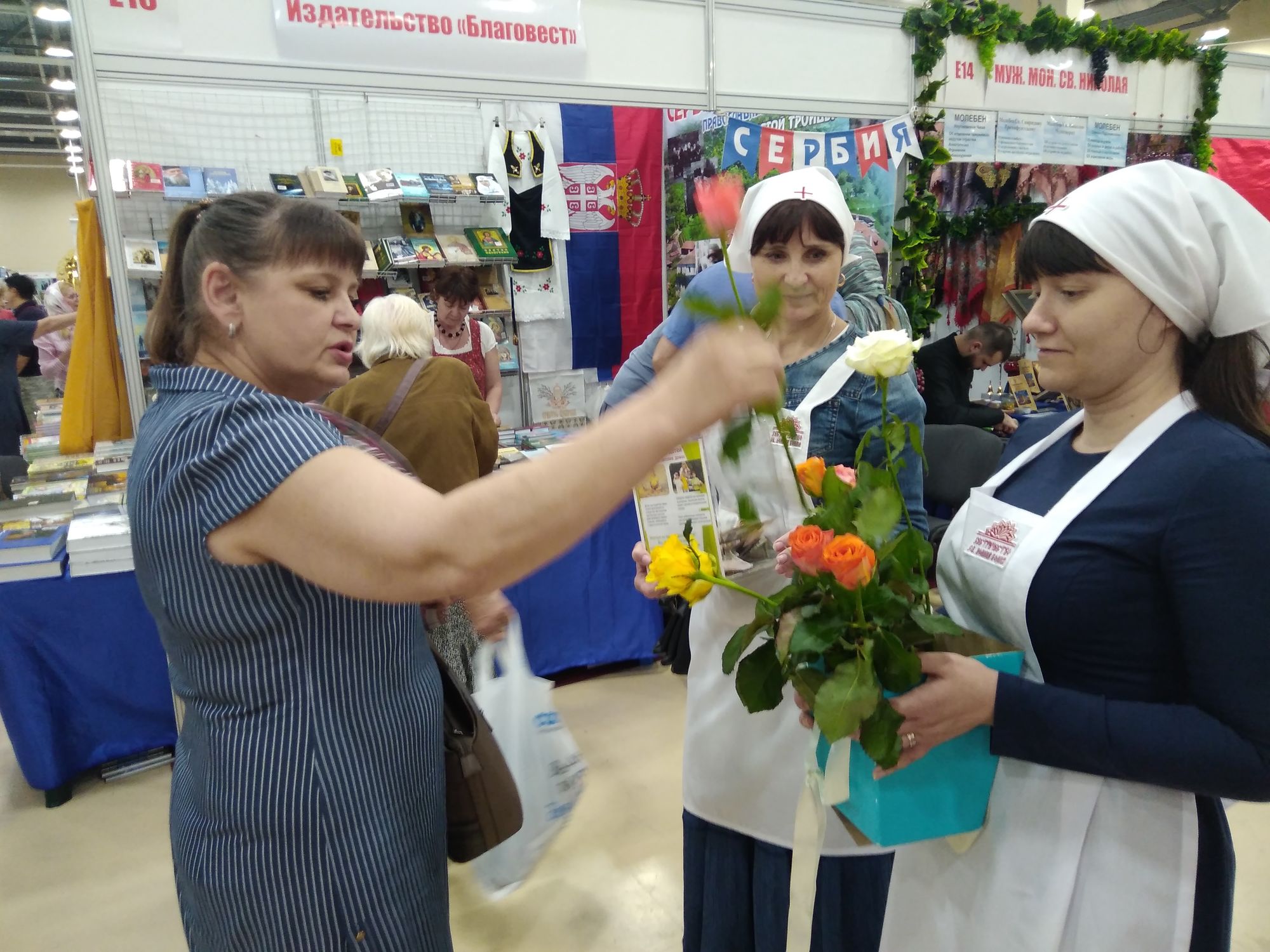Сестры милосердия и добровольцы знакомили посетителей выставки с действующими социальными проектами благочиний и епархии, выдавали раздаточный материал, приглашали к активному участию в проектах и мероприятиях по различным социальным направлениям. Ну и конечно же, на православной выставке раздавали за пожертвование розы для Святой Матронушки!