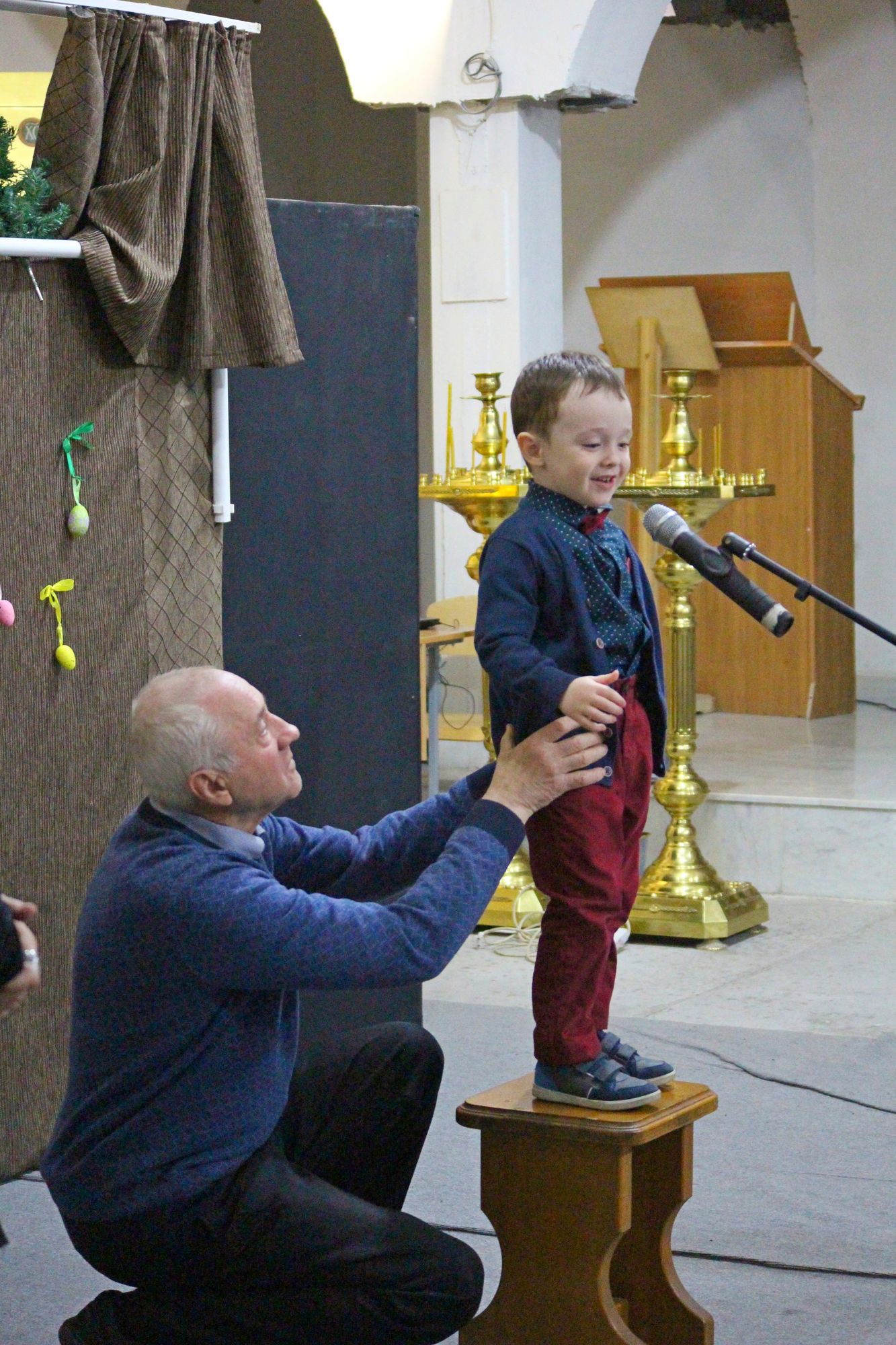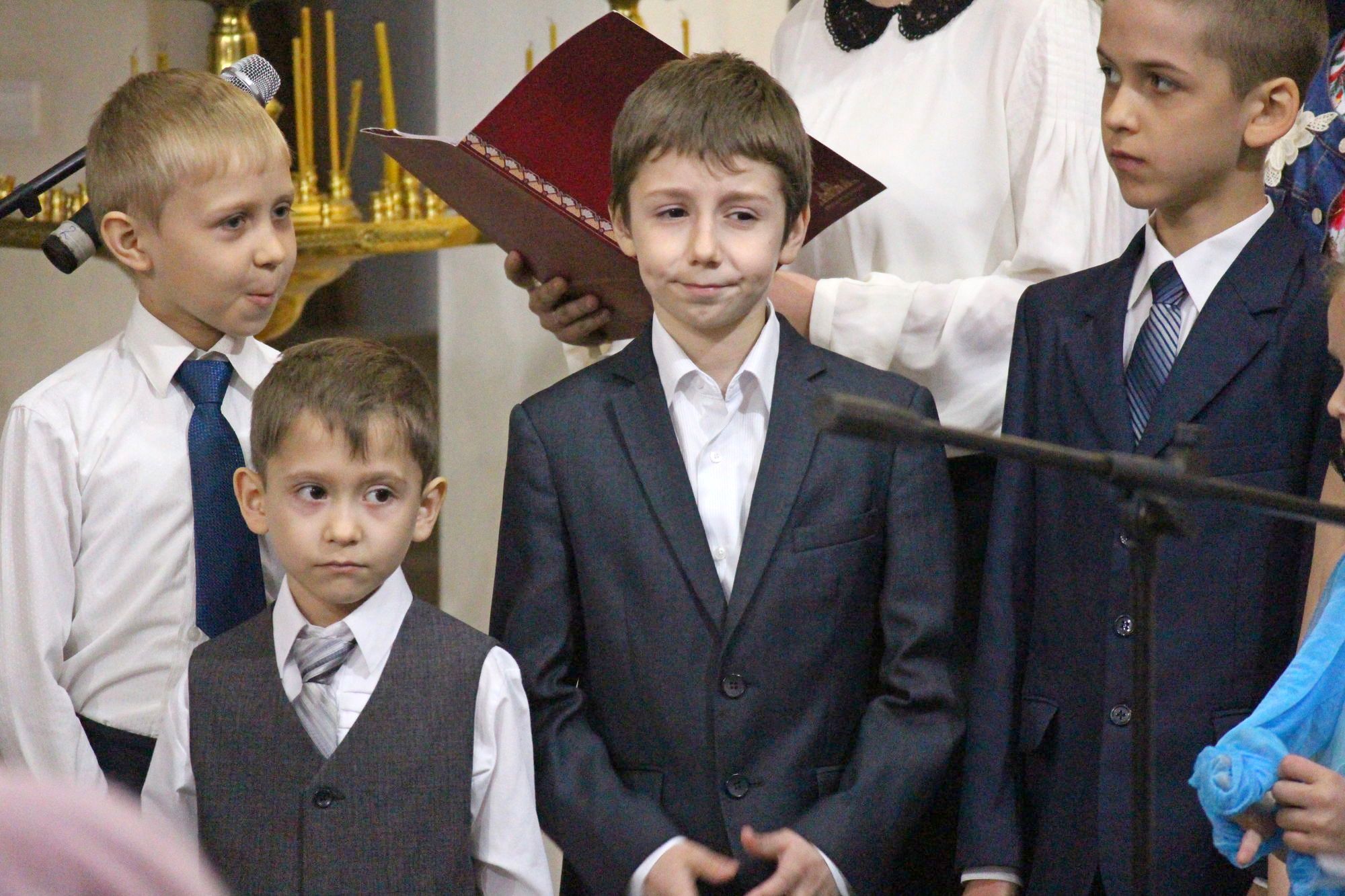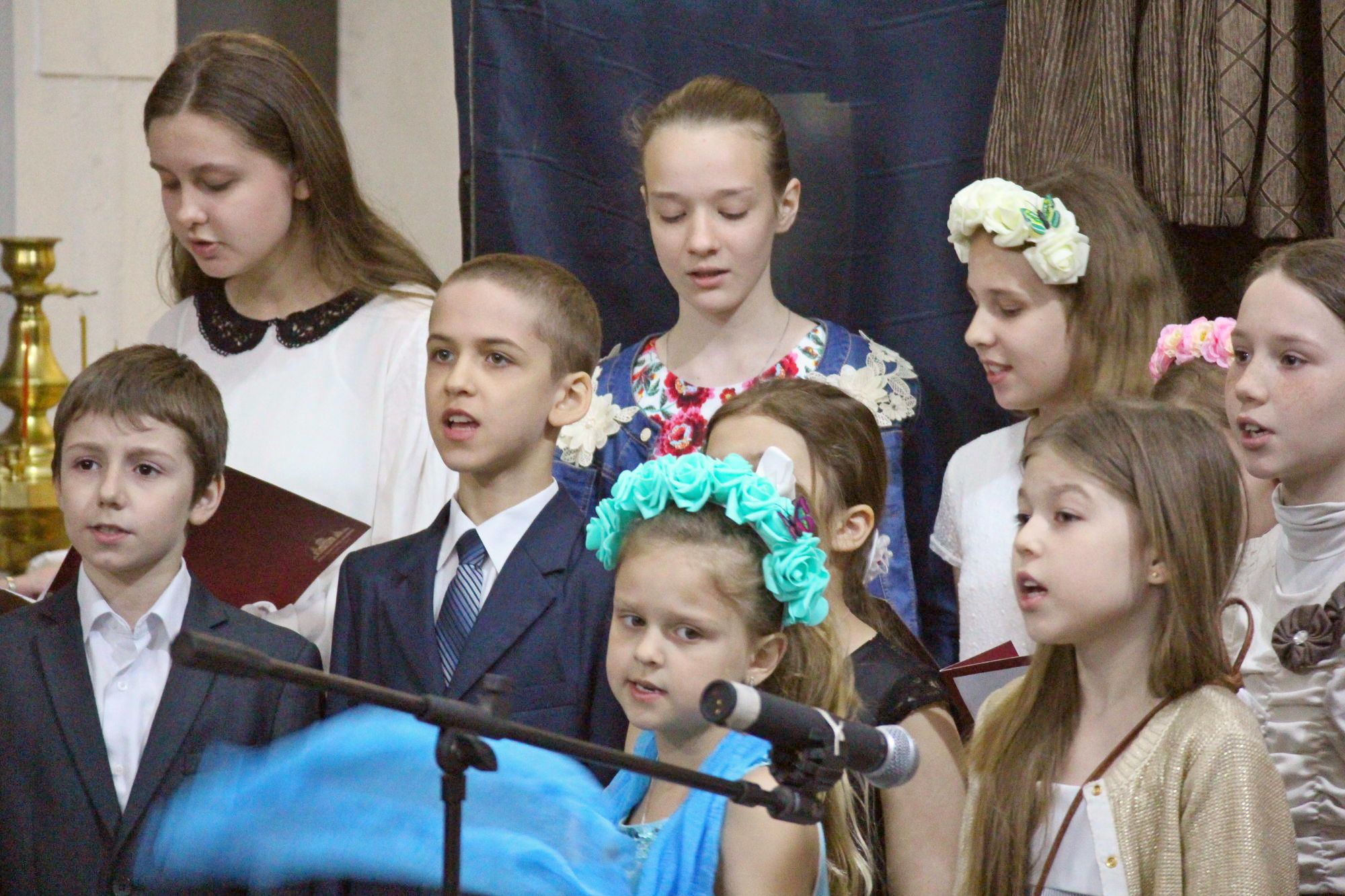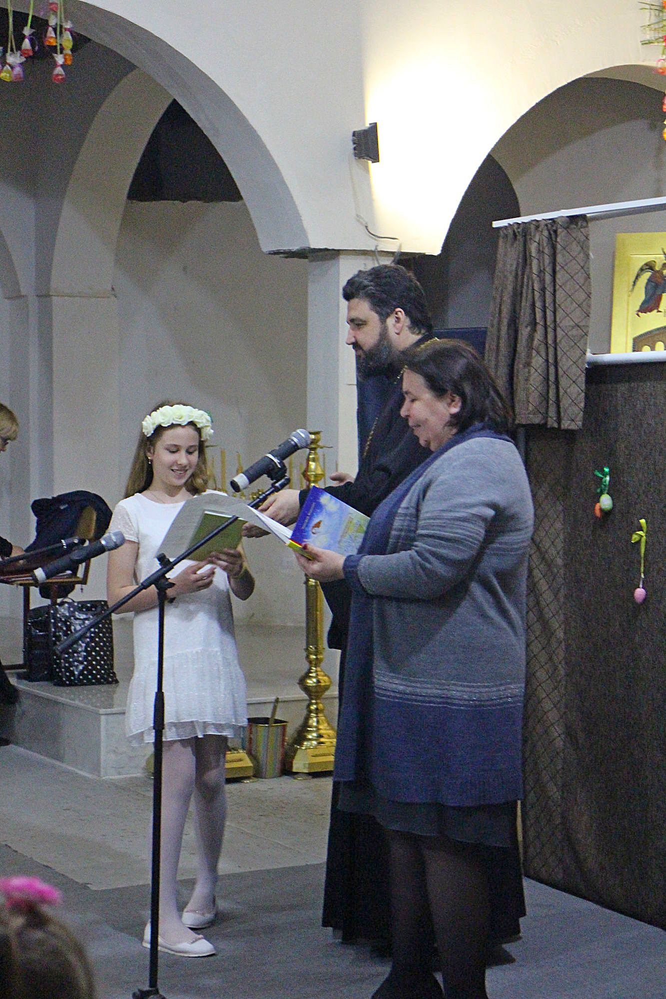 Утренник продолжился музыкальным выступлением. Под руководством Бухтовой Ирины Петровны детский хор исполнил пасхальные песни. Особо запомнилась зрителям песня «Чистая вода», подготовленная самостоятельно ученицами нашей воскресной школы. По окончании праздничного концерта настоятель храма протоиерей Валерий Волощук поздравил всех зрителей со светлым праздником Пасхи и поблагодарил детей за их выступление, а также поздравил воспитанников воскресной школы с победой в Кирилло-Мефодиевской олимпиаде. Победителям олимпиады отец Валерий вручил грамоты и памятные подарки. Так же всем детям, пришедшим на этот светлый праздник, вручили подарки.