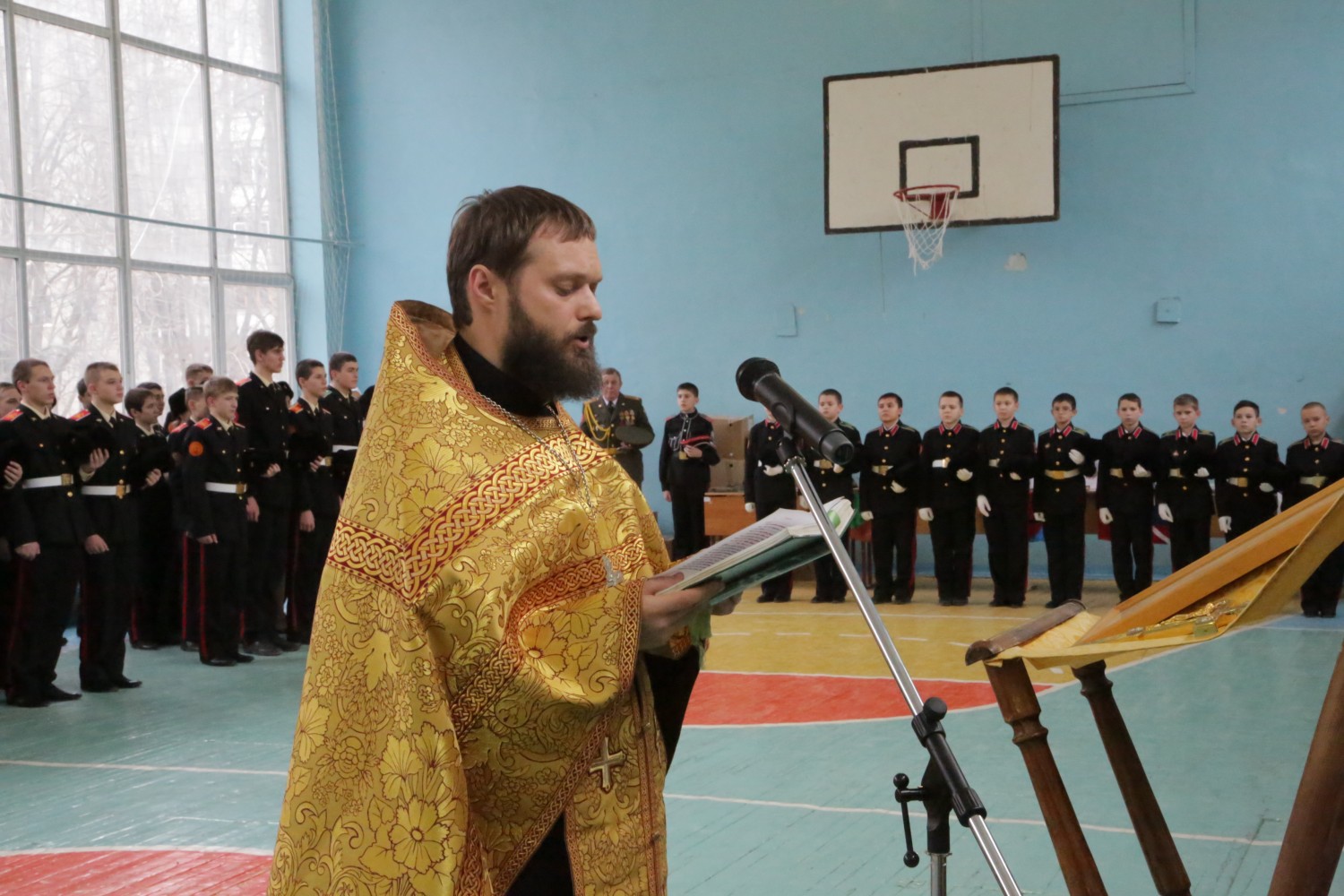 Перед началом мероприятия священник отслужил молебен и сказал напутственное слово собравшимся. Так же кадетов поздравили гости мероприятия и подарили ценные подарки. Ростовский Духовно-патриотический центр передал в дар музею при кадетском корпусе более 50 образцов различных трофеев времен Великой Отечественной Войны.