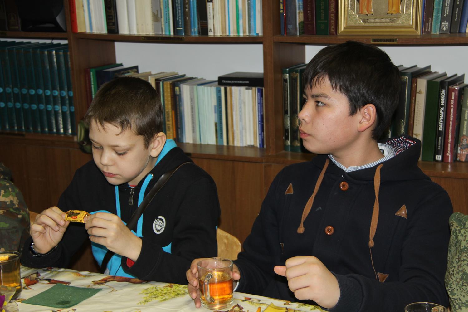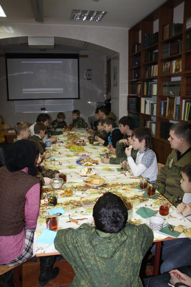 По окончании занятий для учащихся и преподавателей было организовано чаепитие, в ходе которого дети читали стихи и пели песни посвященные нашей армии.