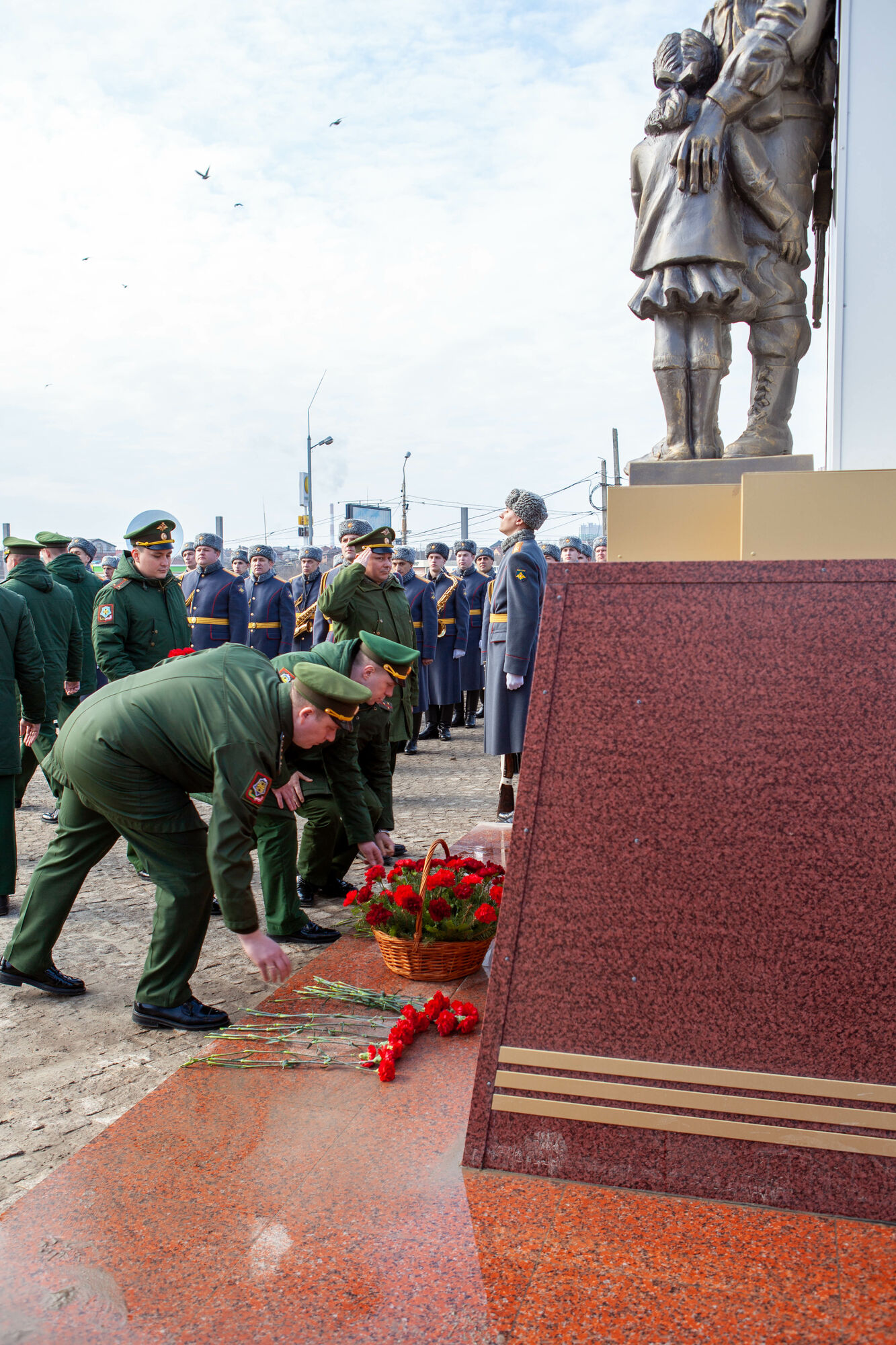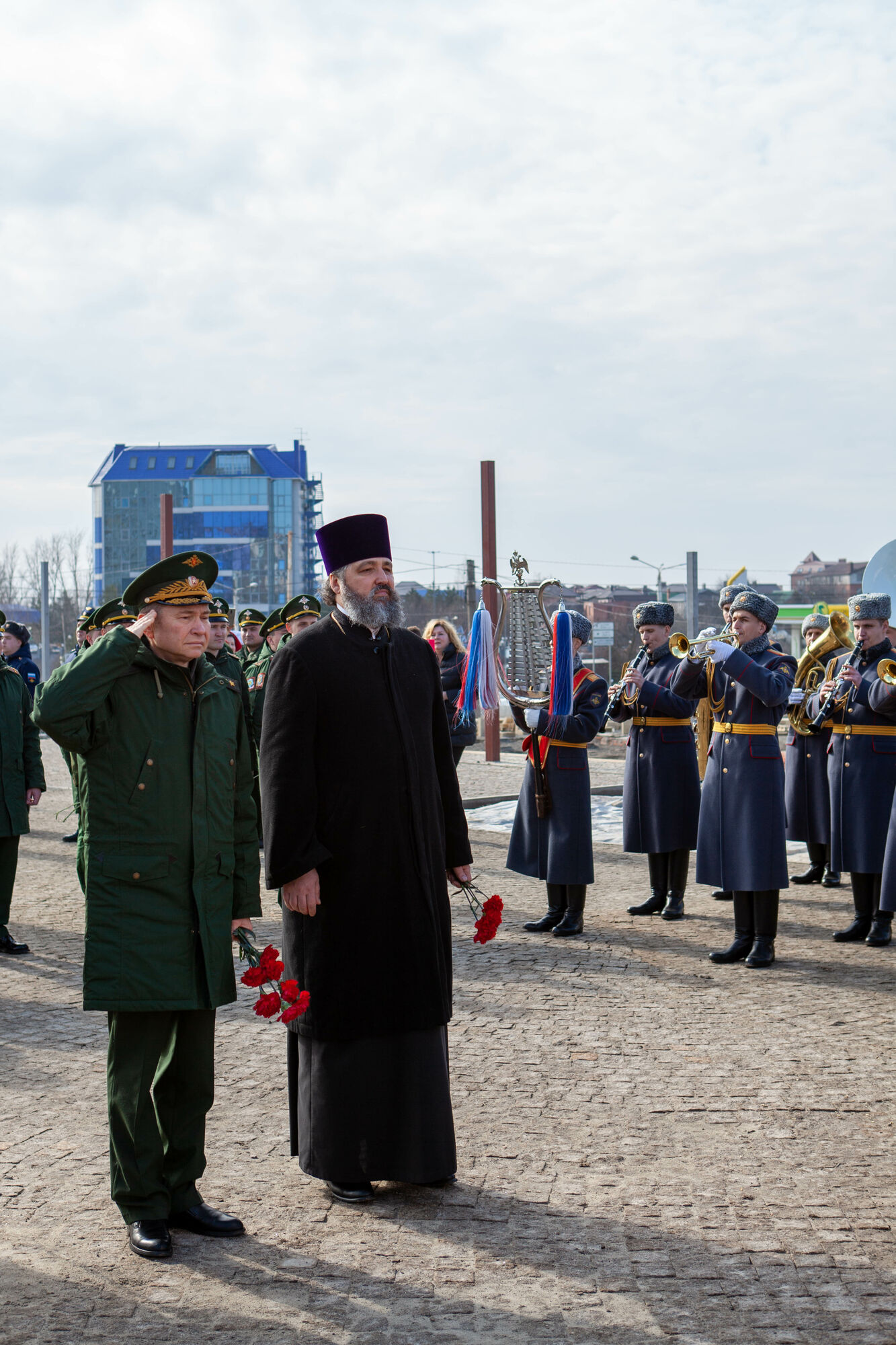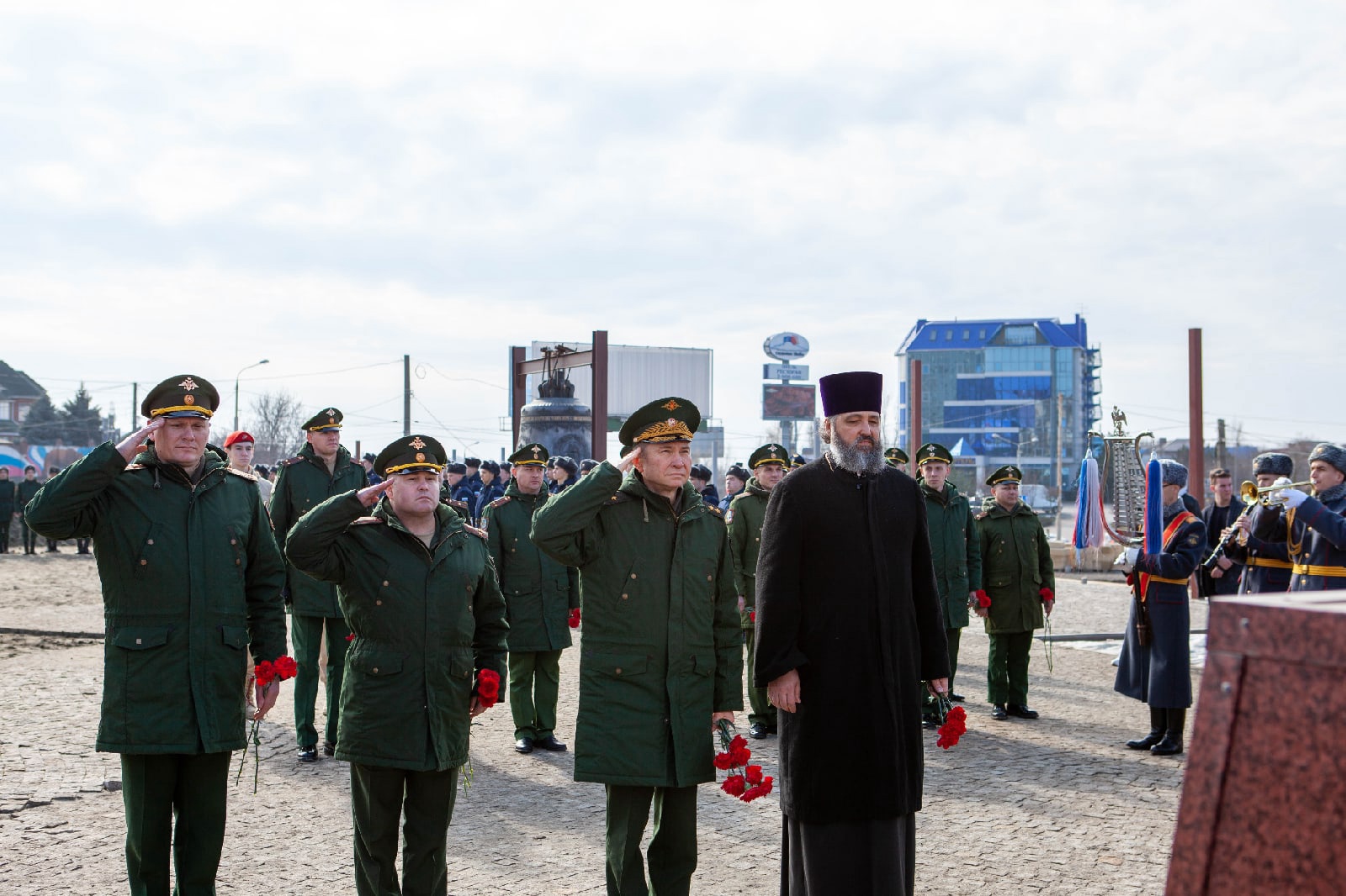 По окончании молебна отец Валерий поздравил в лице собравшихся войска Южного военного округа с Днём защитника Отечества, пожелал крепости, сил и помощи от Господа в высоком и ответственном служении, любви к Богу, Родине и ближним. Торжественную церемонию завершило возложение цветов к памятнику войнам-освободителям.